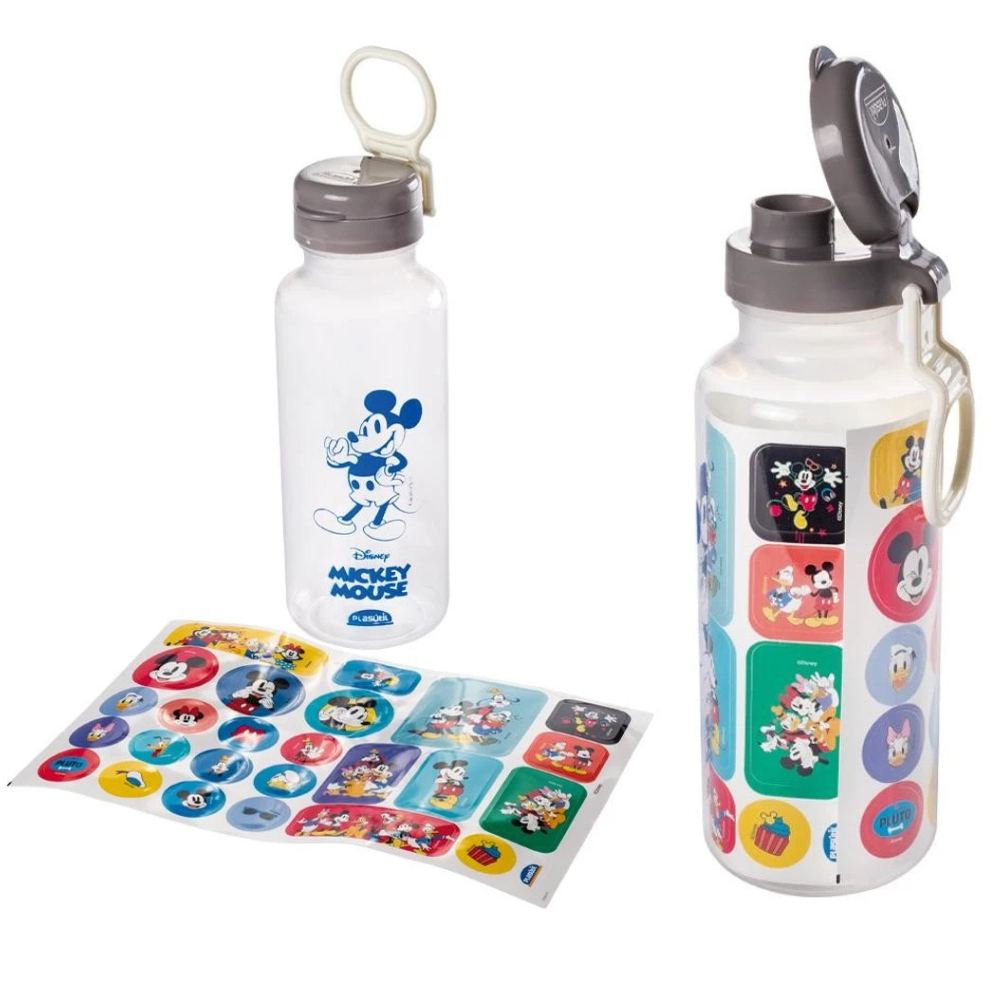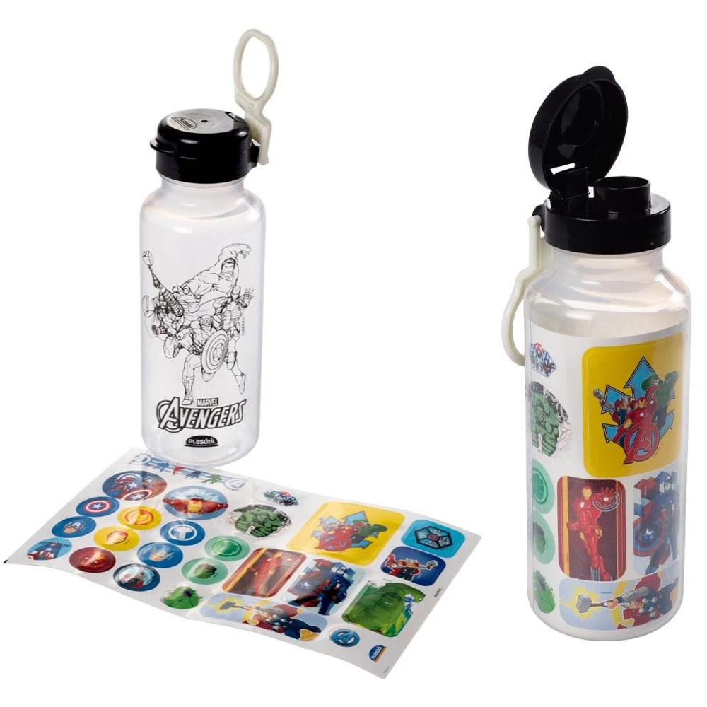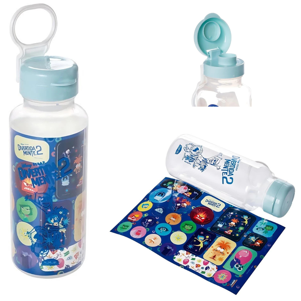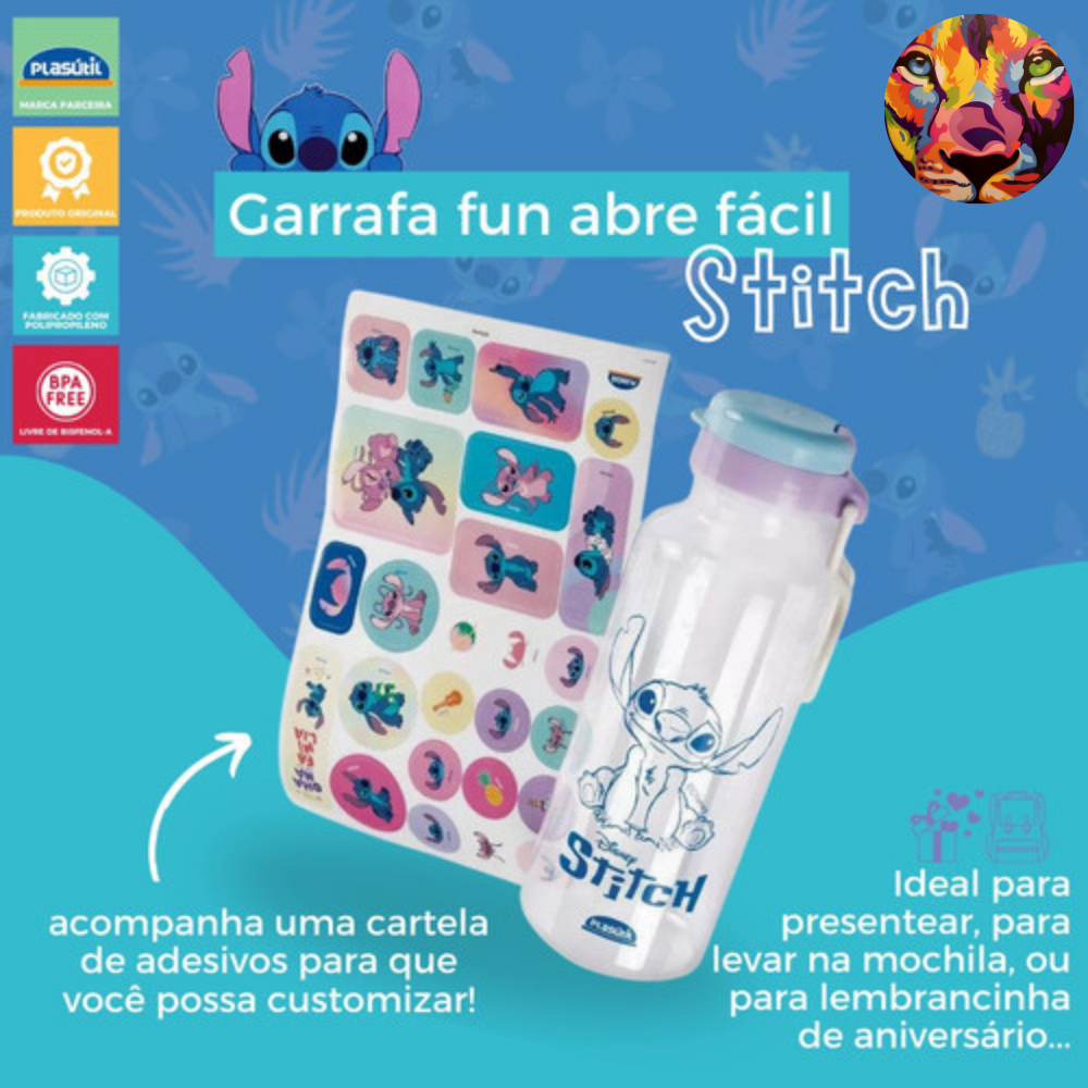 Garrafa Plasútil Abre Fácil Stitch Spidey Aranha Avangers Mickey Divertidamente 600ml + Adesivos