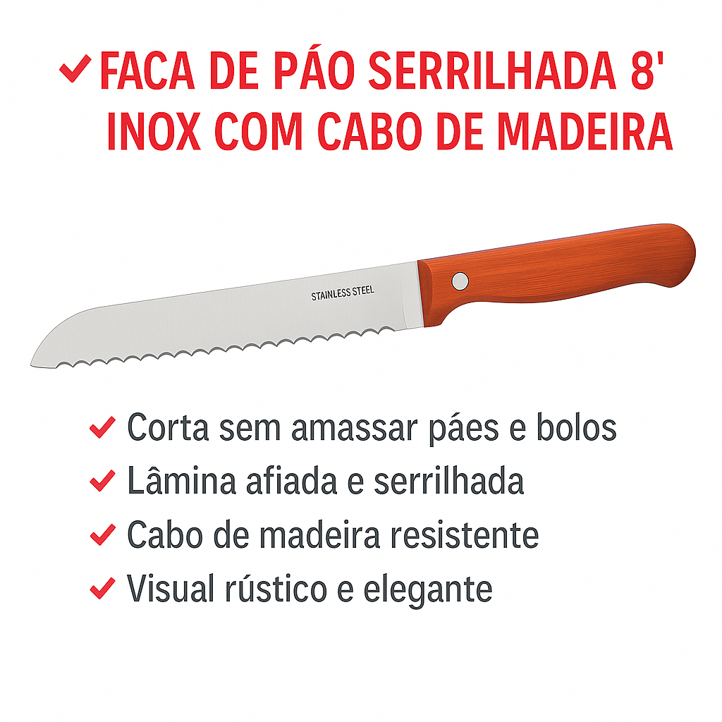 Faca De Pão Serrilhada 8" Inox 32,5cm Profissional Cabo Madeira Corte Preciso Cozinha Padaria