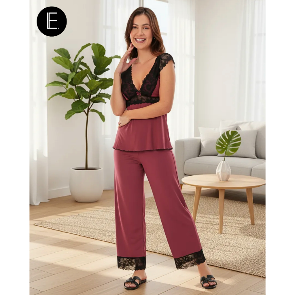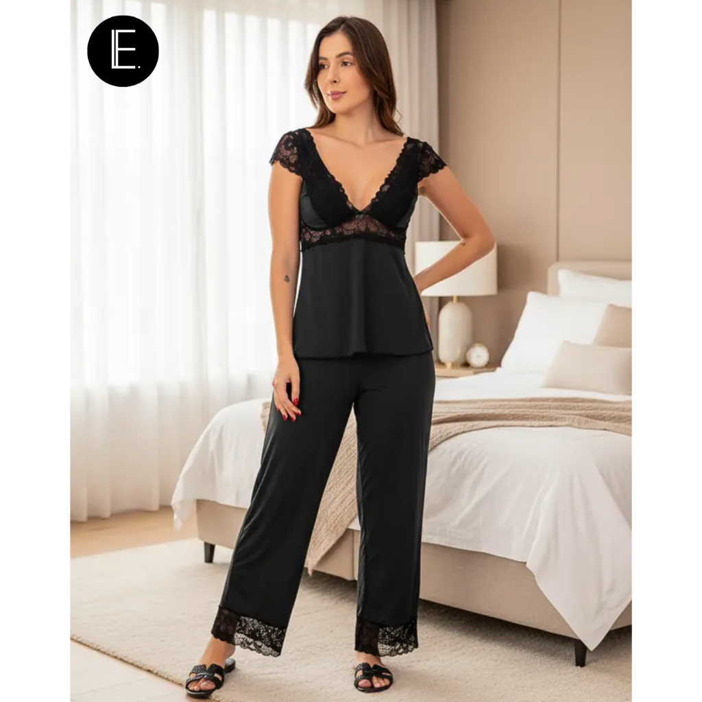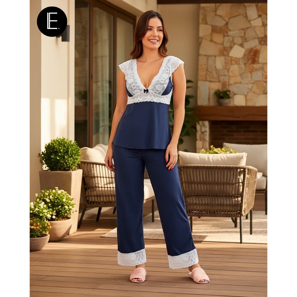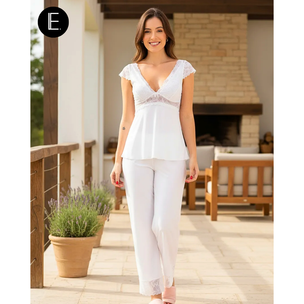Pijama Feminino Manga Curta Renda Sem Bojo Calça Estampa Lisa Confortável Elegante Lingerie Langerie