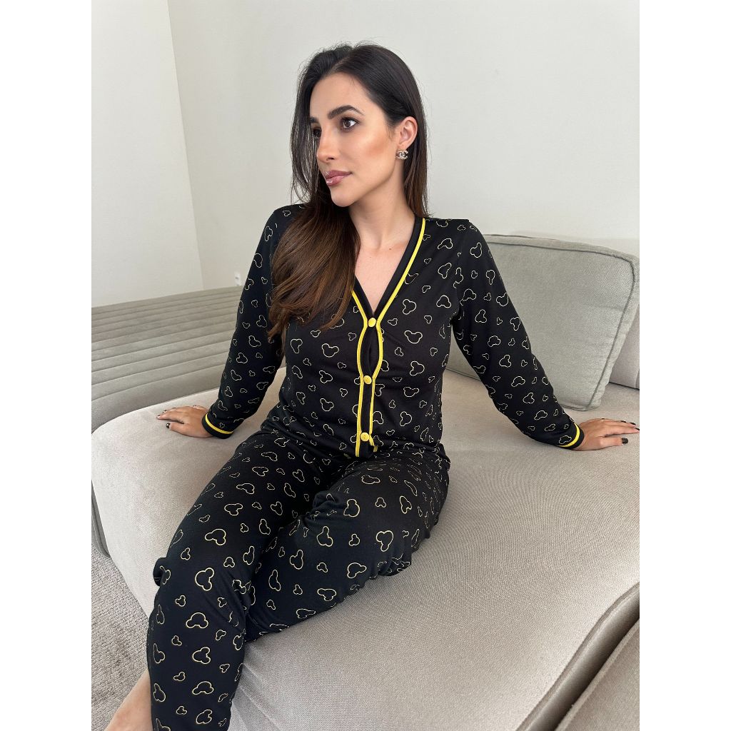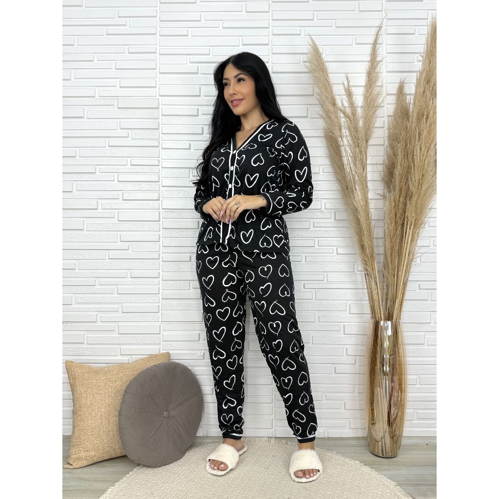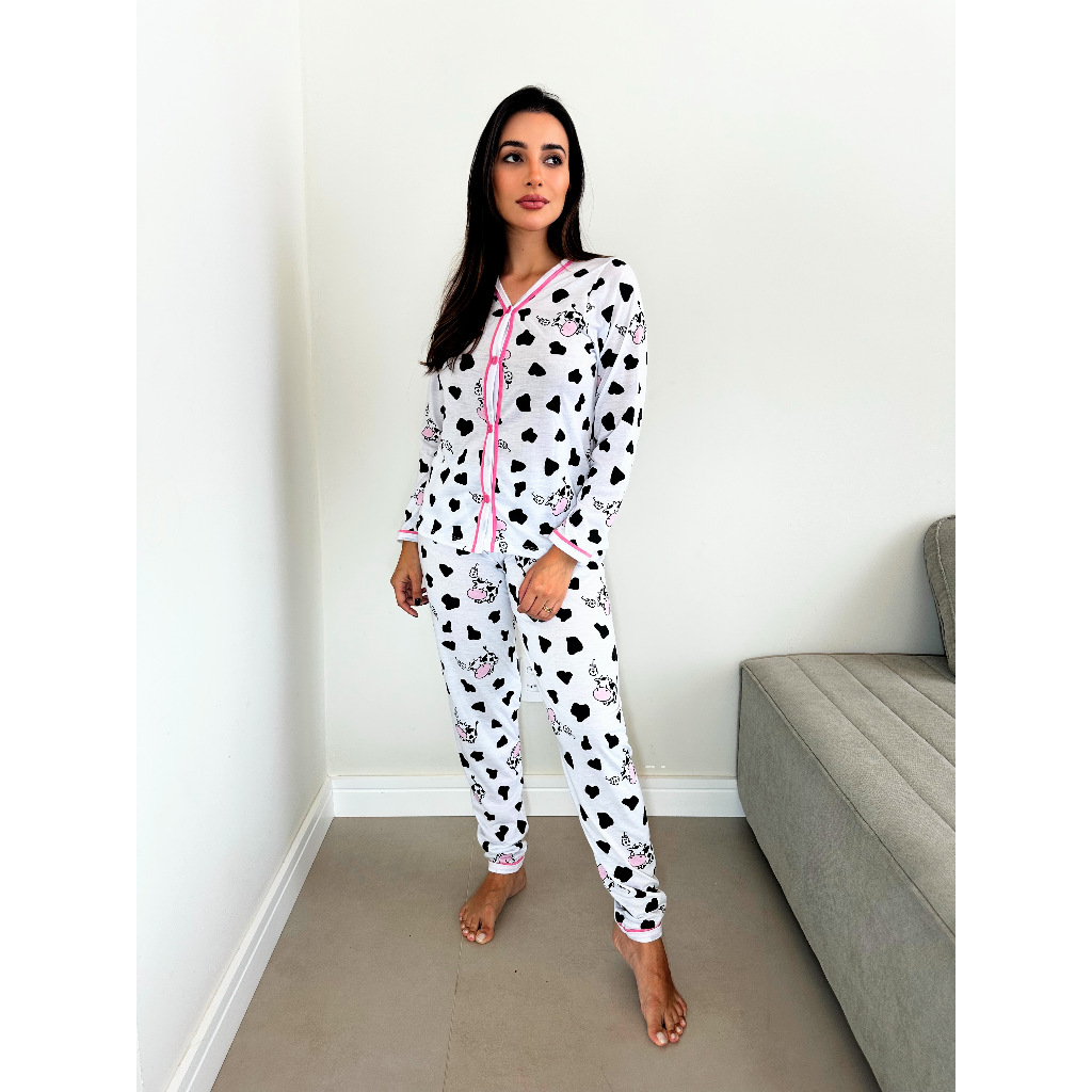 Pijama Feminino Americano Calça e Blusa de Frio Gola V e Botões que Abrem Amamentação Malha Inverno