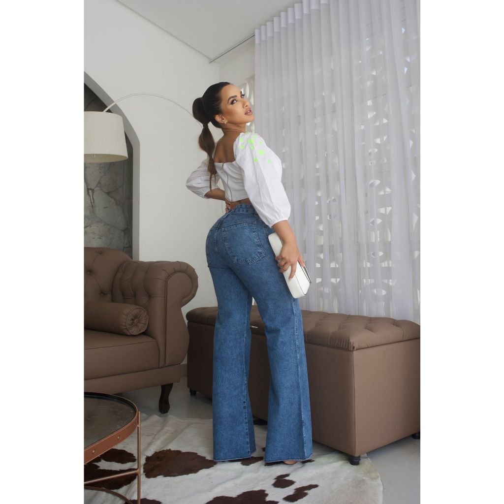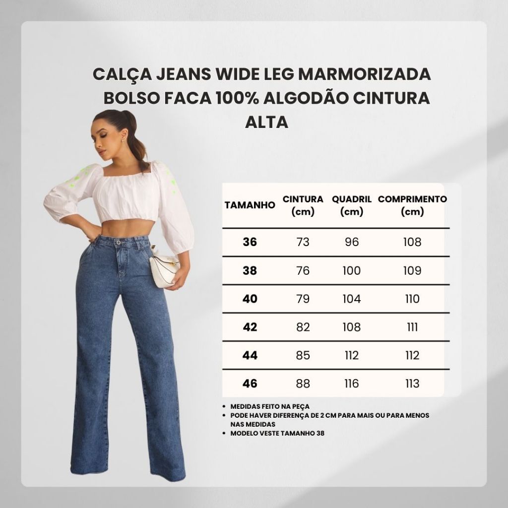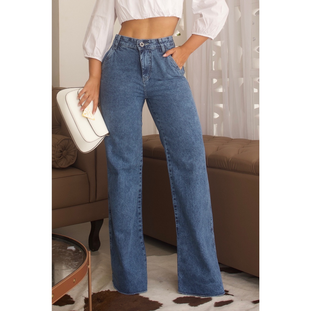 Calça Jeans Premium Feminina Wide Leg Pantalona Marmorizada Cintura Alta Bolso Faca Sem Elastano Lycra