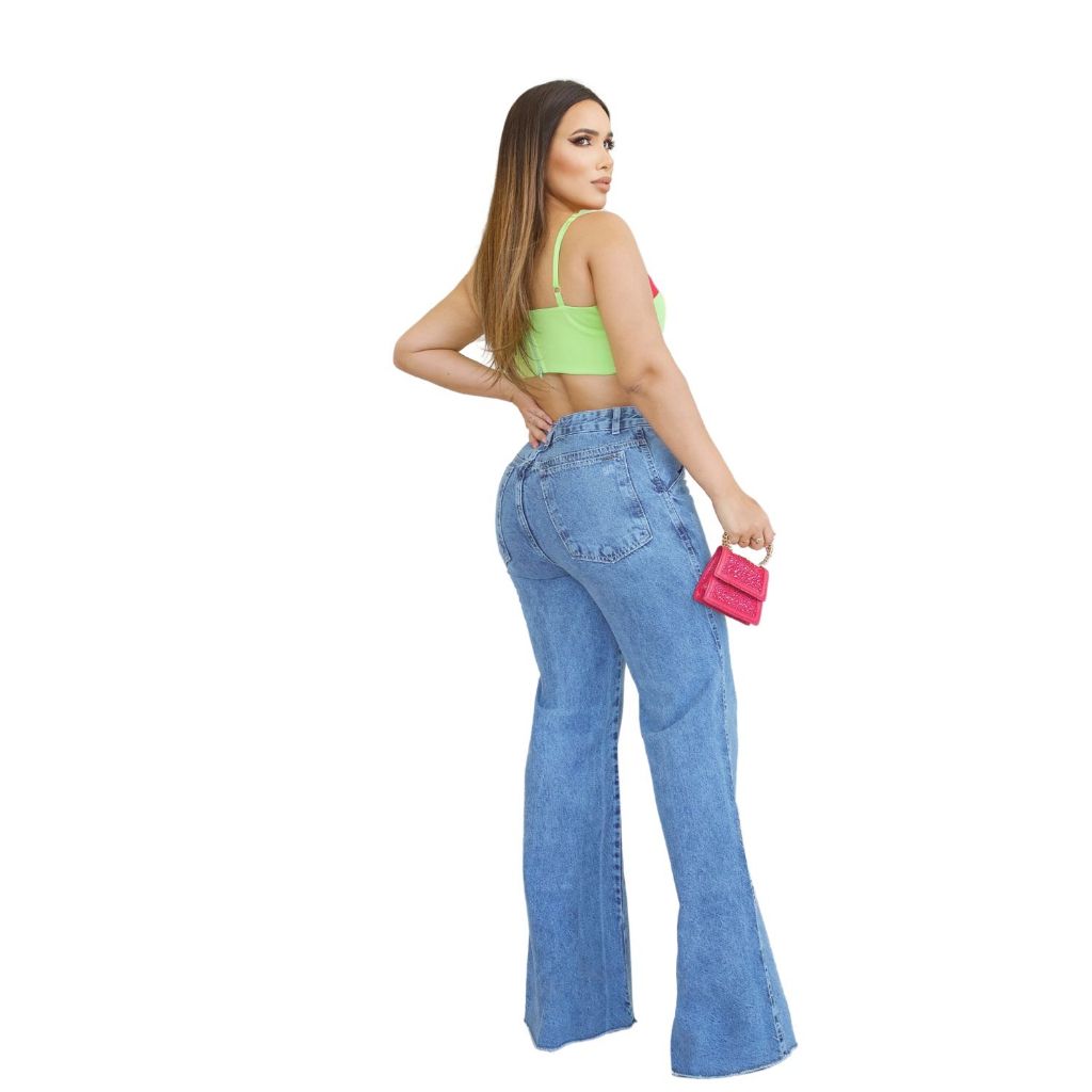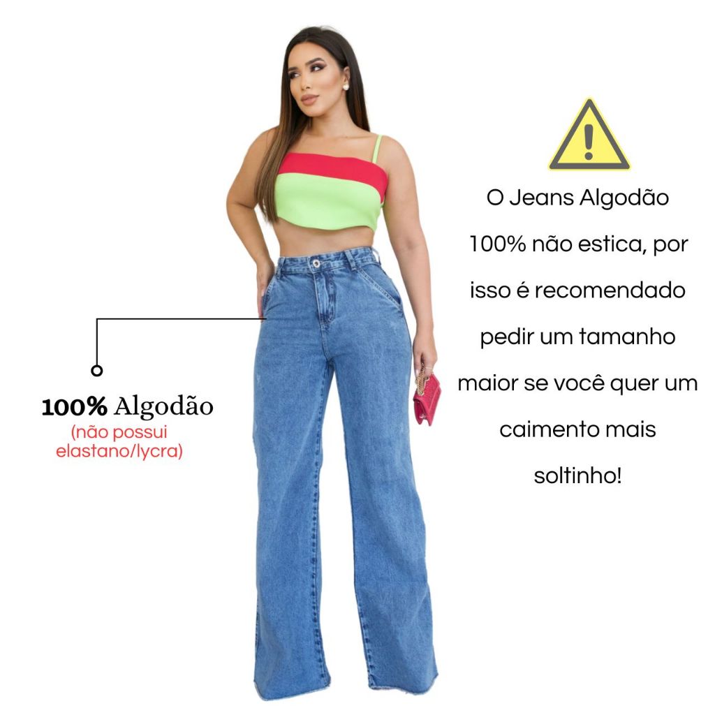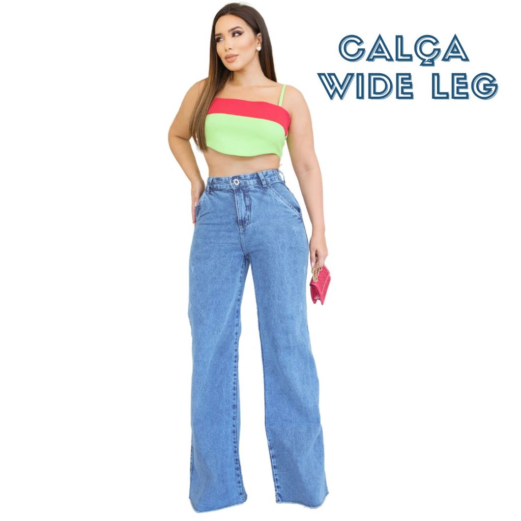 Calça Jeans Premium Feminina Wide Leg Pantalona Marmorizada Cintura Alta Bolso Faca Sem Elastano Lycra