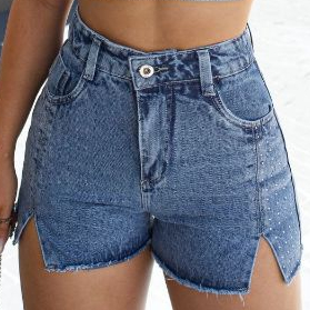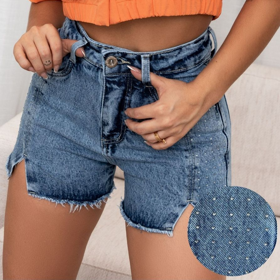 Short Jeans Feminino Premium Marmorizado Brilho Lateral Strass Luxo Moda Blogueira Cintura Alta 100% Algodão