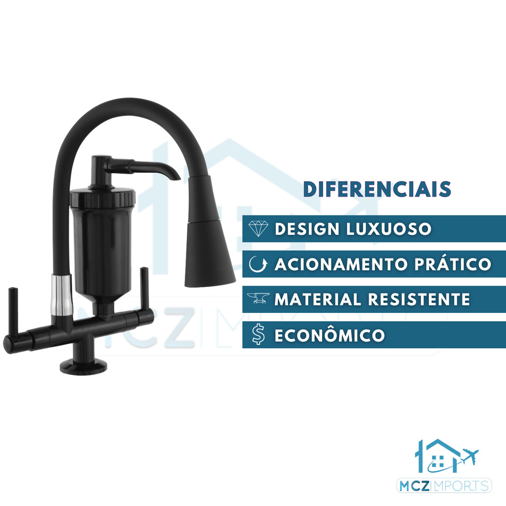 Torneira de Cozinha Bancada Preta Flexível Duplo Jato Cone 1/4 de Volta Com Filtro Slim Preto