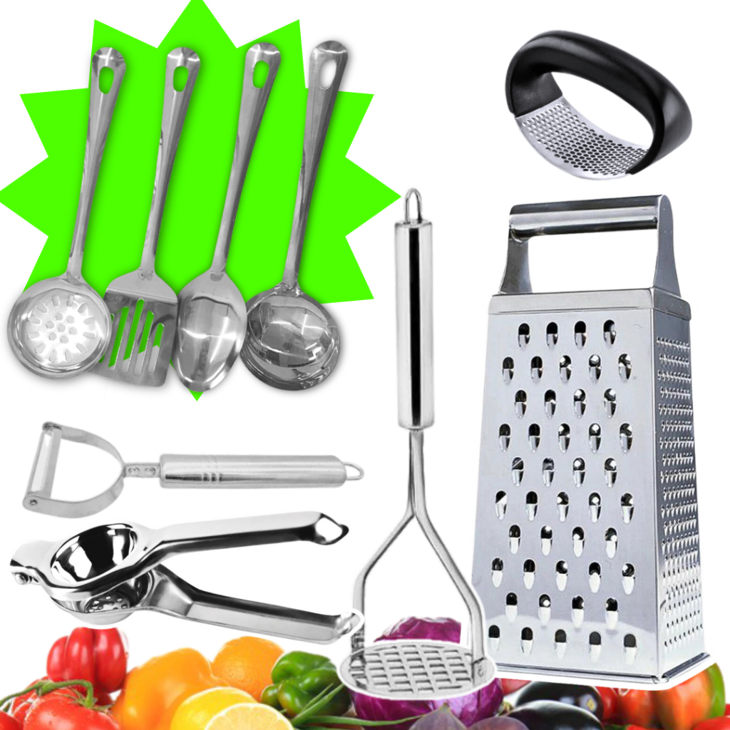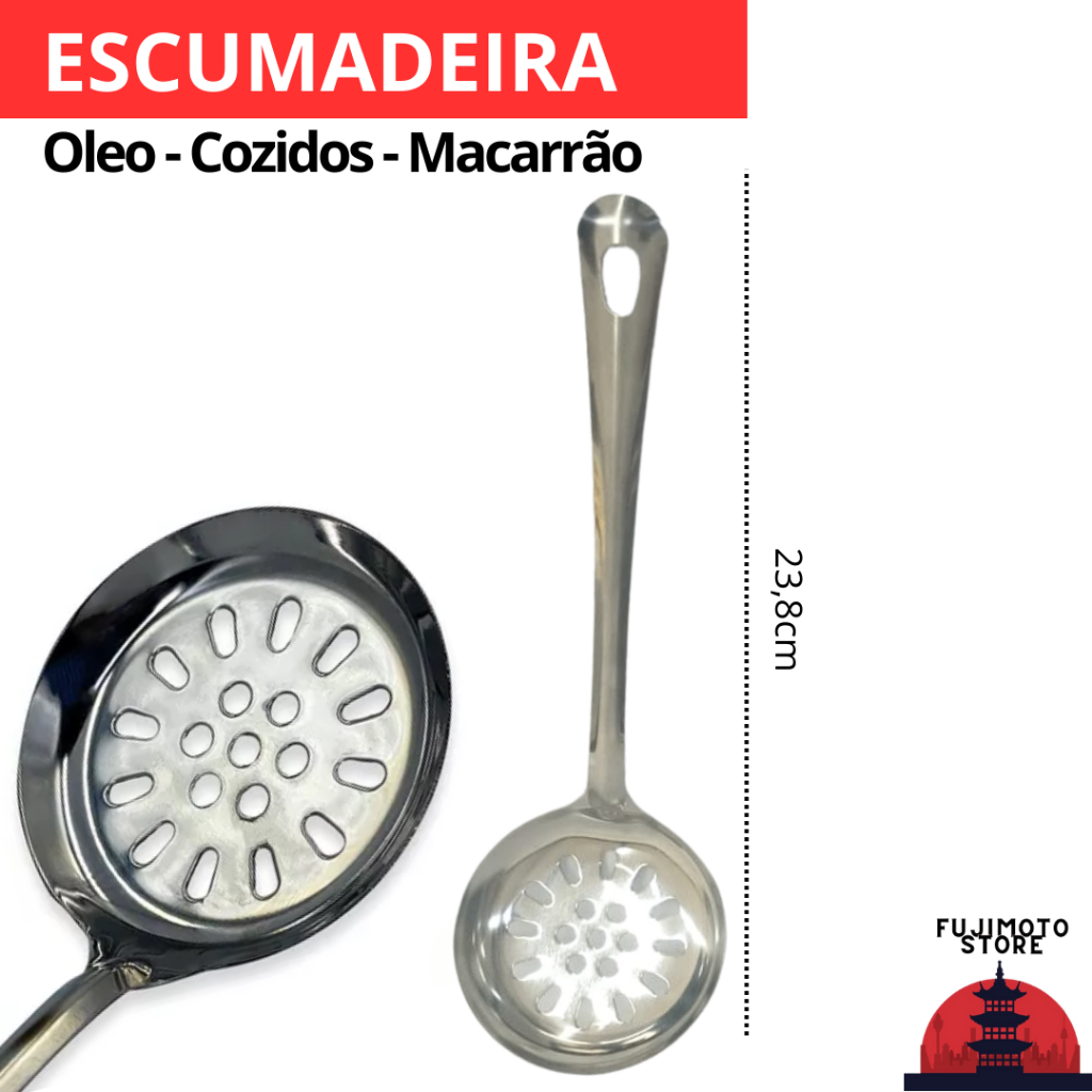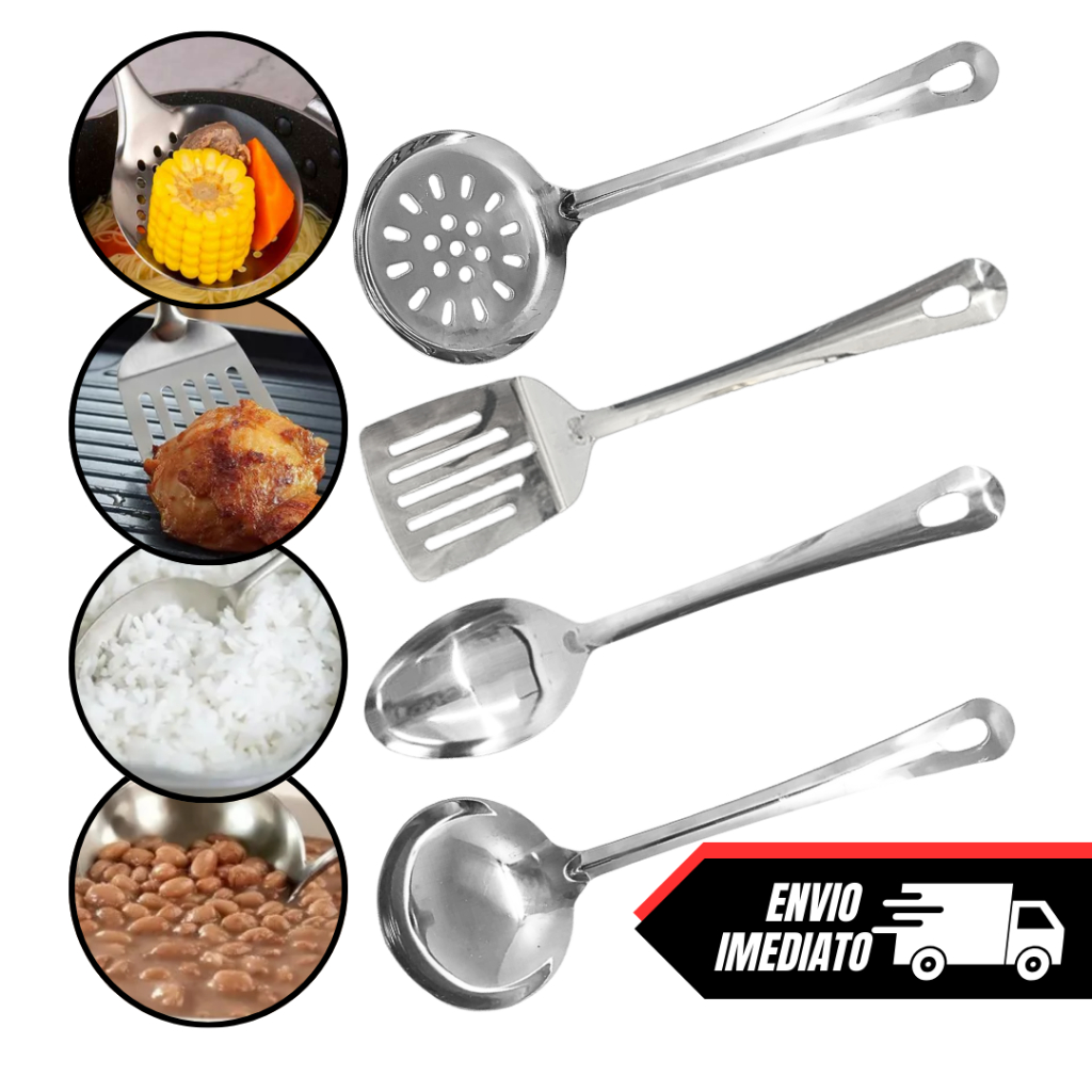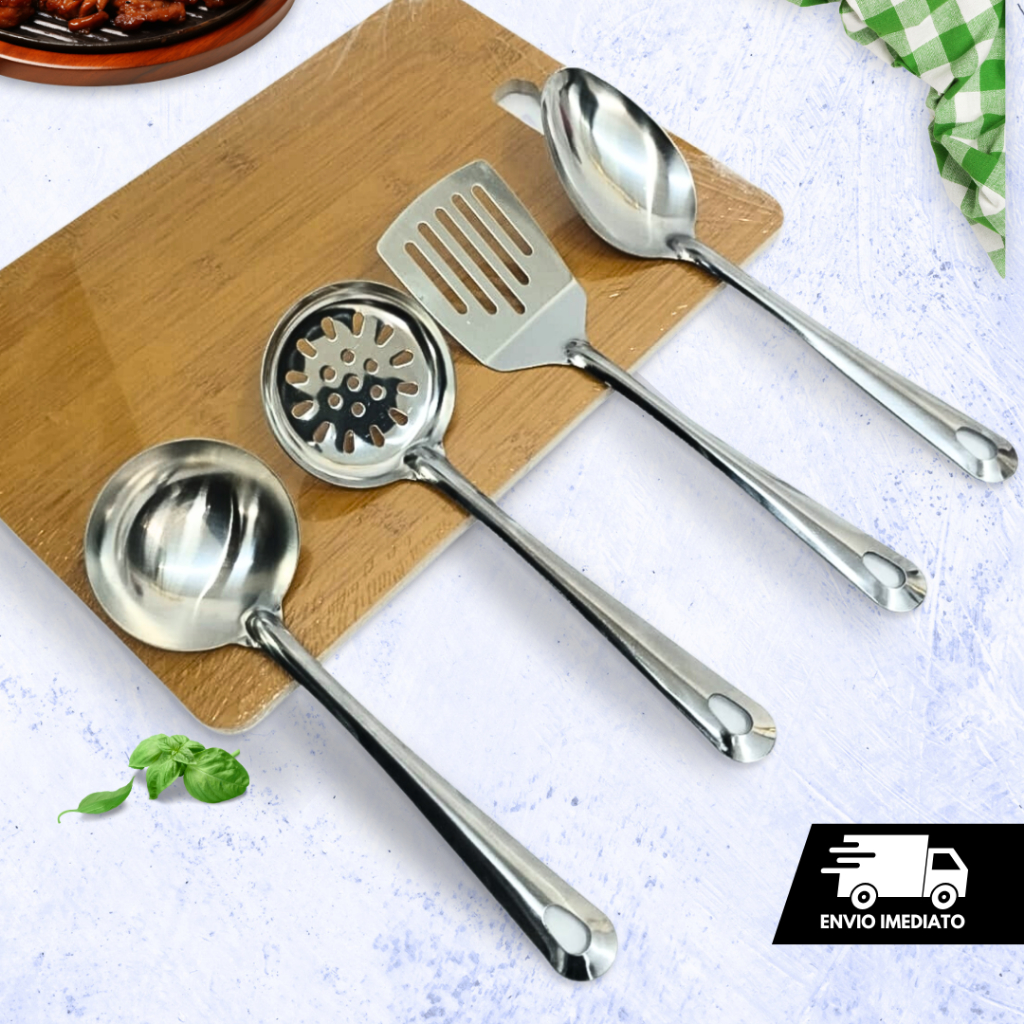 Kit Colher de Arroz Concha Escumadeira Espátula 4 Peças Inox Utensílios Cozinha Restaurante Casa