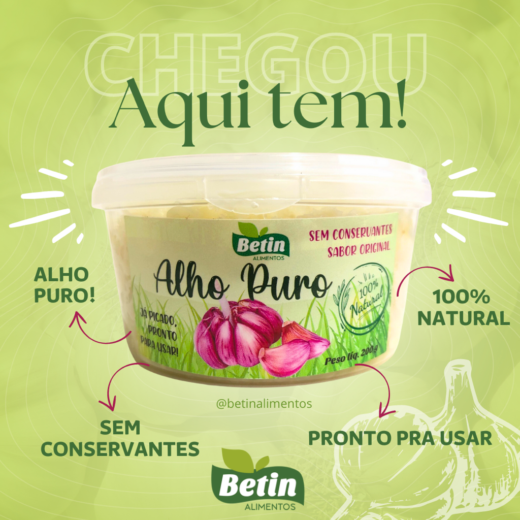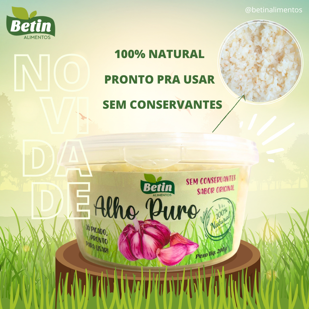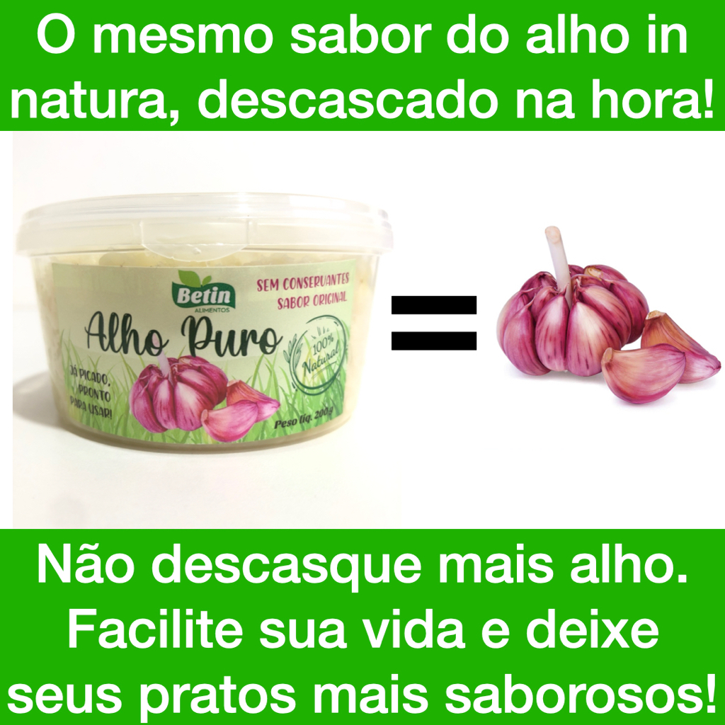 Alho Puro Betin 250g 500g e 1kg. Alho Gourmet triturado e sem sal! Não é pasta, é alho in natura picado sem conservantes