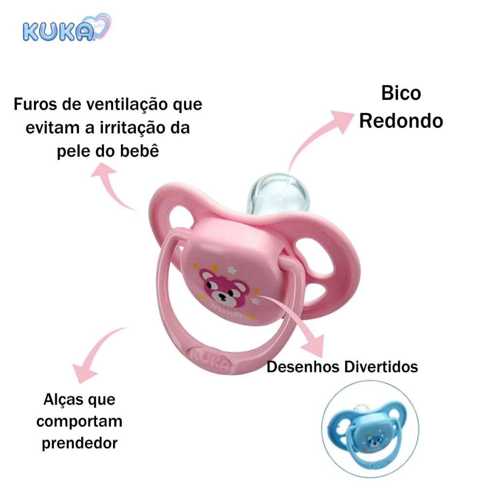 Chupeta Kuka Smart 0-6 meses Bico Silicone Redondo Reto com Alça e Furos de Ventilação