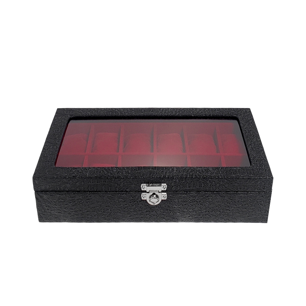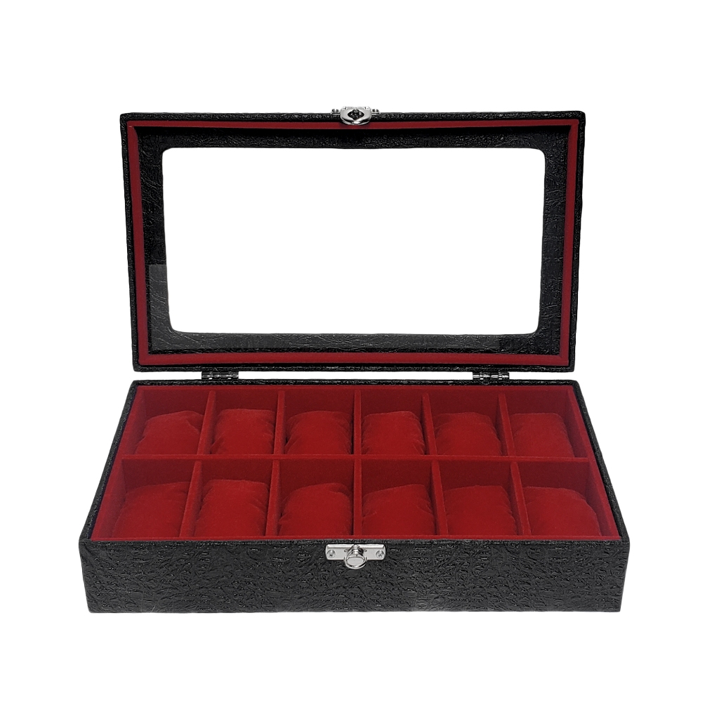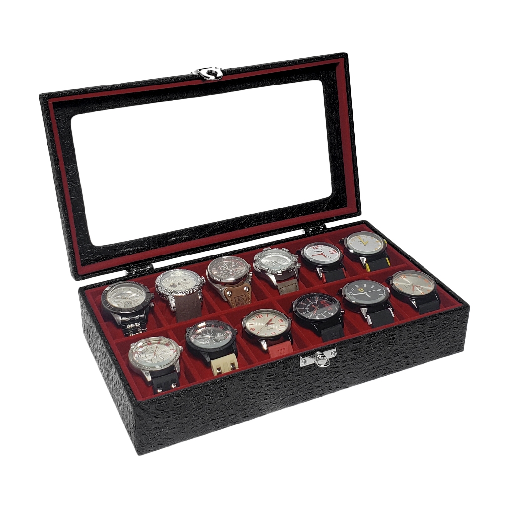 Estojo Para 12 Relógios Preto Com Interno Aveludado Vermelho