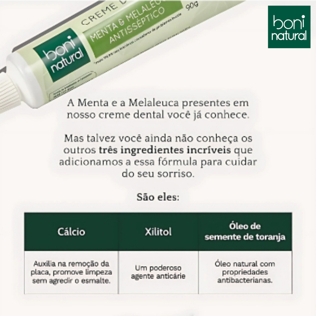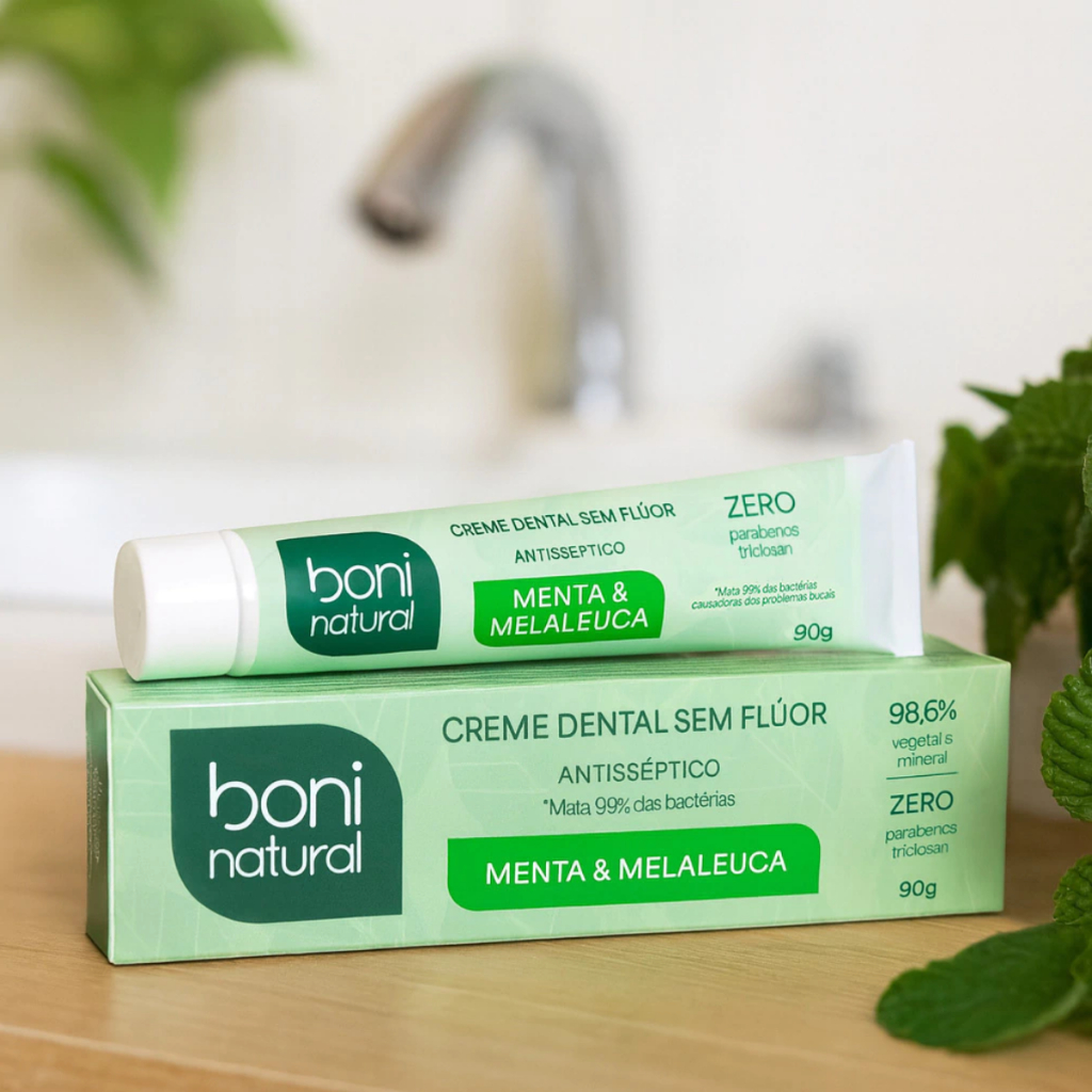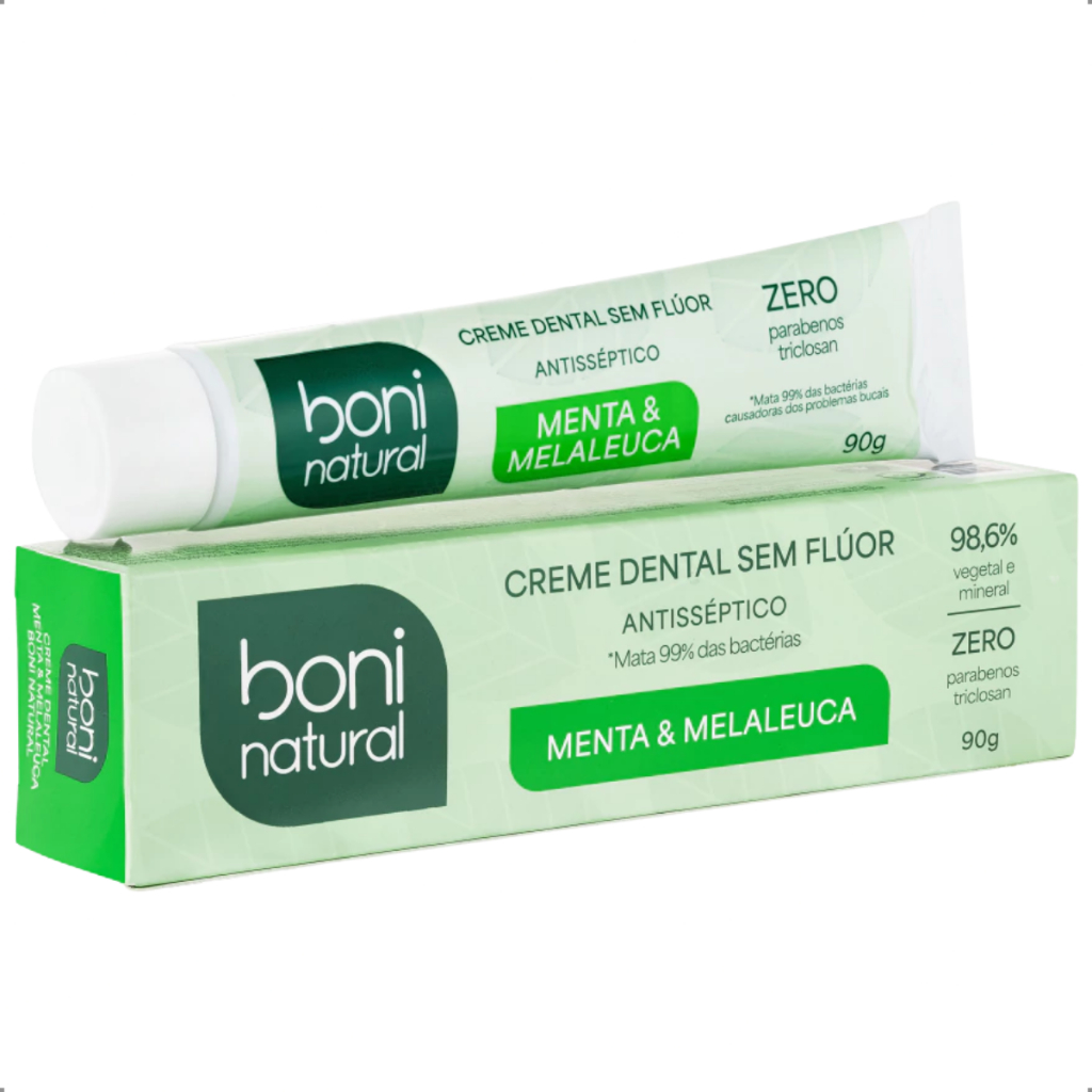KIT 2 Pasta de Dente Sem Flúor Menta e Melaleuca Creme Dental Vegano Antisséptico Boni Natural 90g