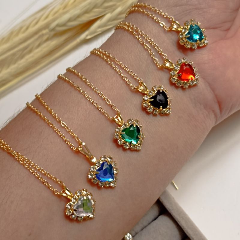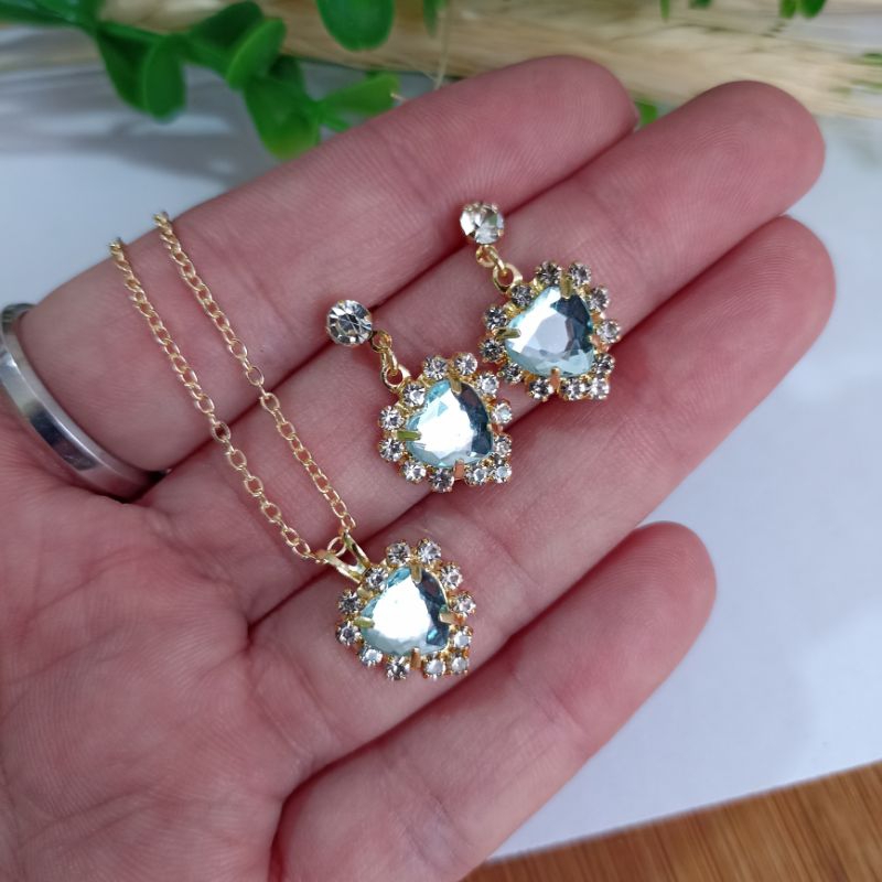 Conjunto Colar e Brinco Coração Pendurado, Cravejado de Strass, Folheados