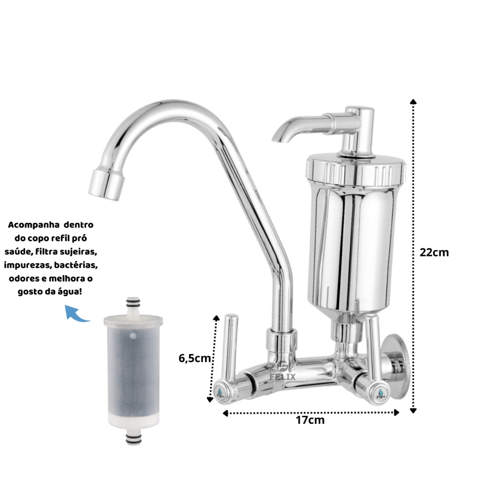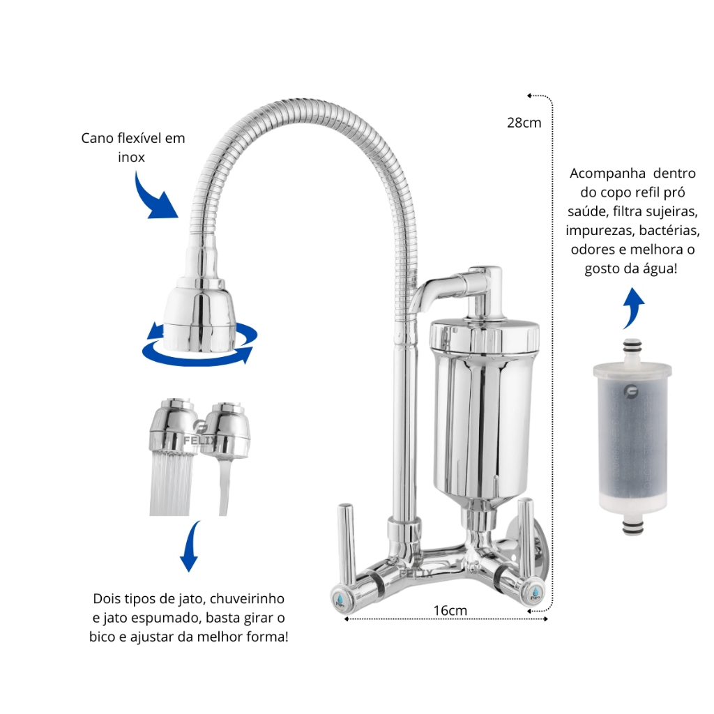 Torneira Filtro Parede Cozinha Gourmet Flexível Bica Móvel 1/4 de Volta + Refil