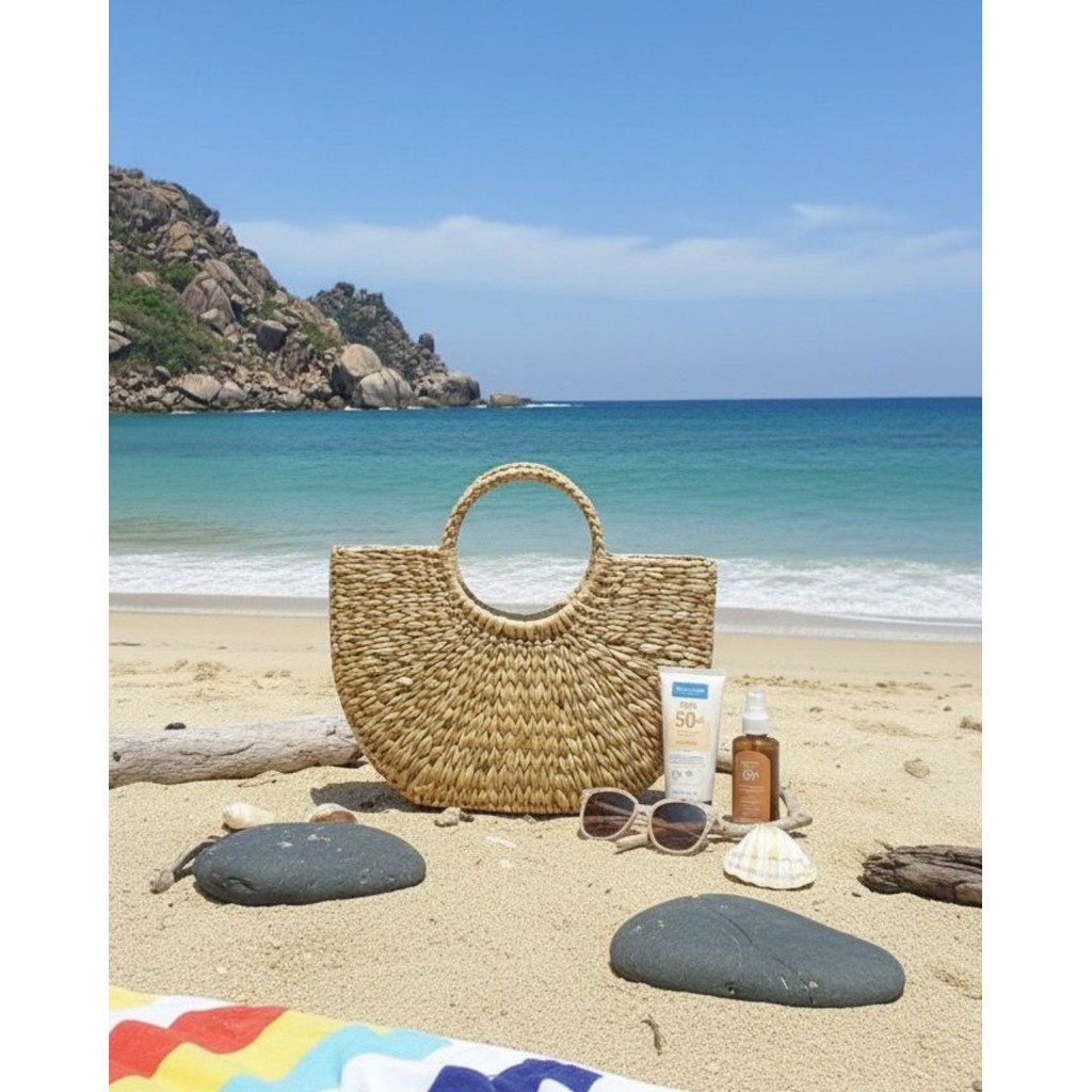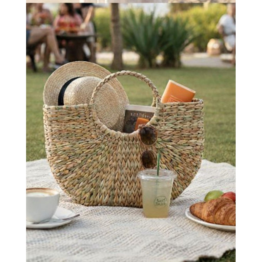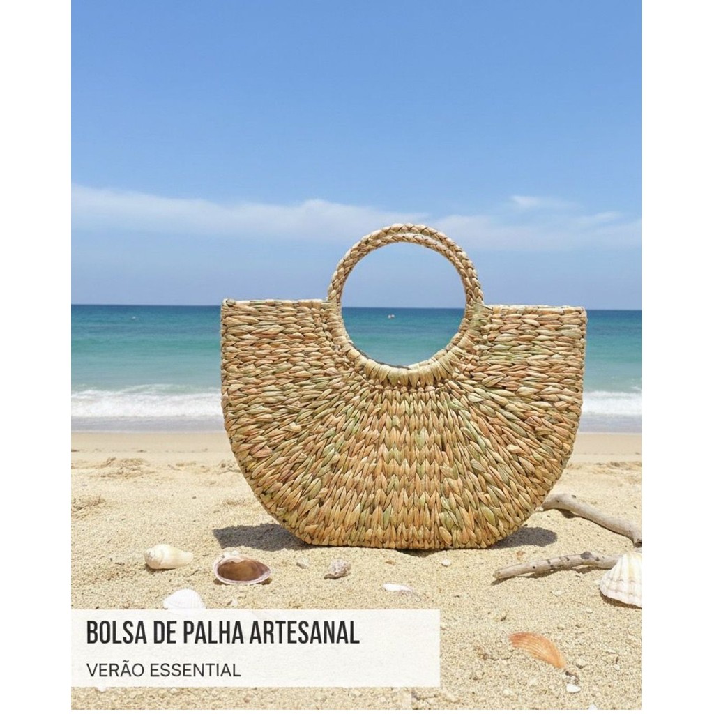 Bolsa de praia feminina de mão argola palha grande meia lua