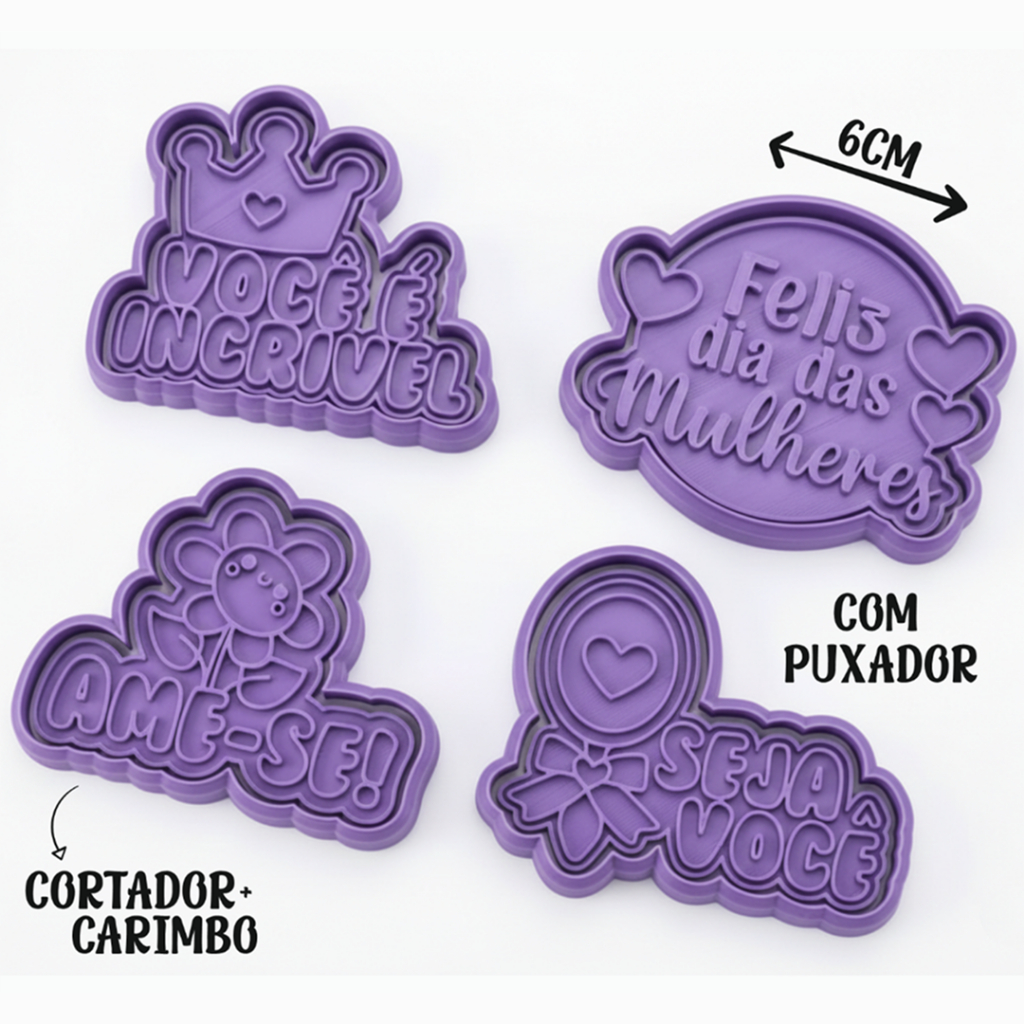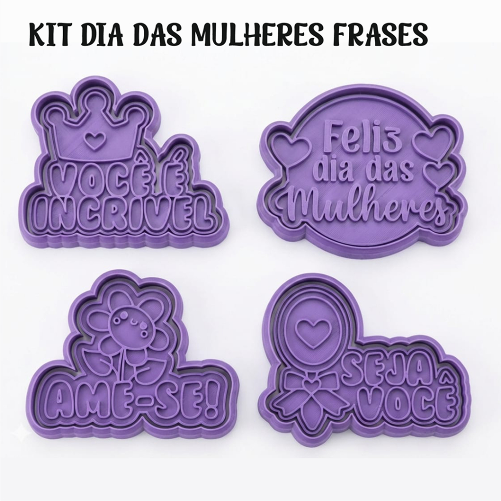 Kit 4 Cortadores e Marcadores 3D Dia das mulheres frases você é incrivel biscoitos ceramica fria biscuit