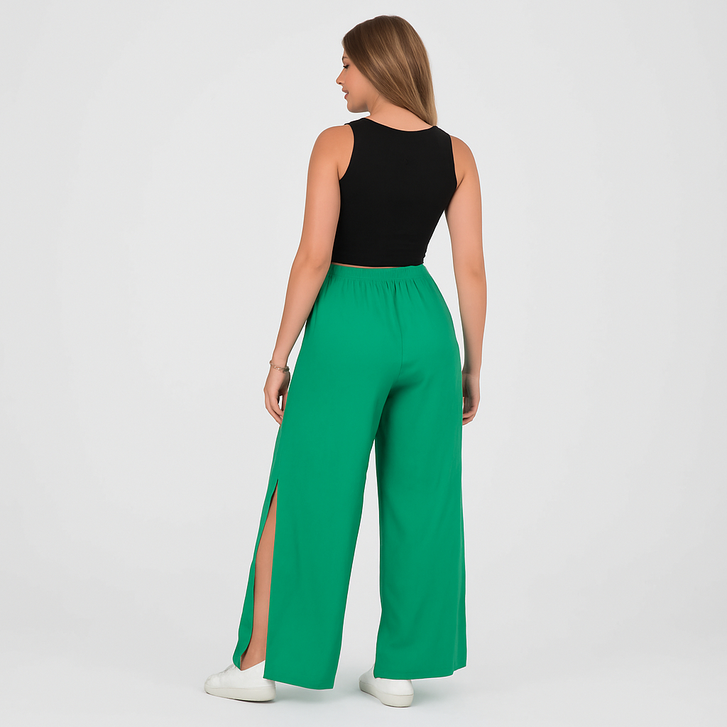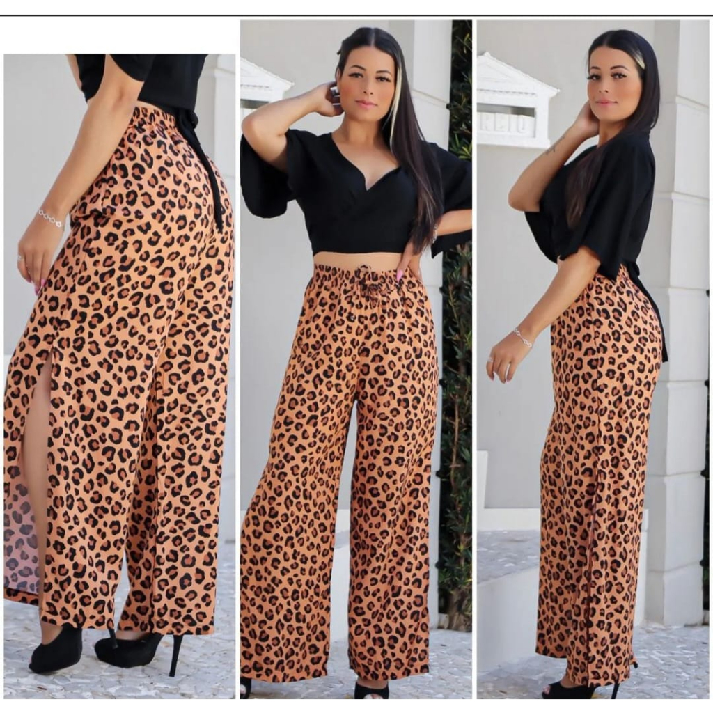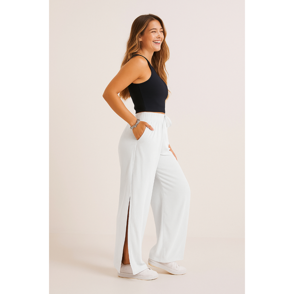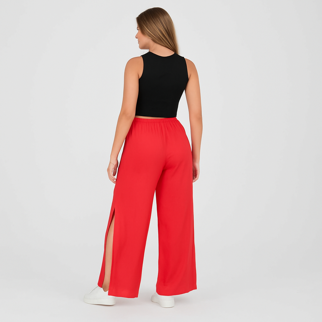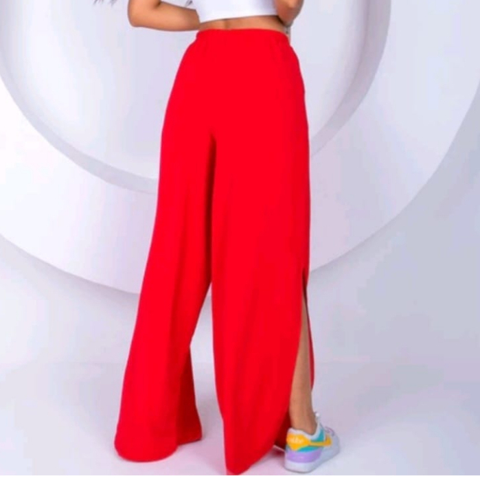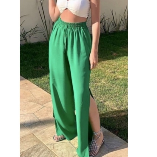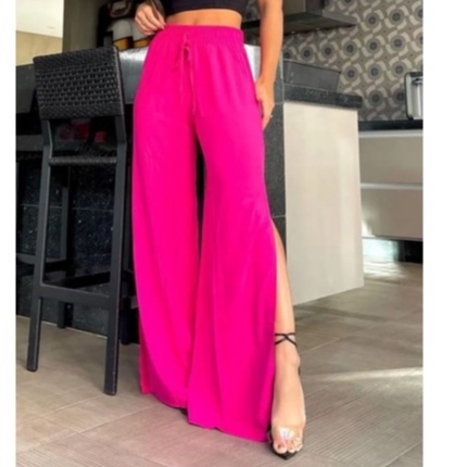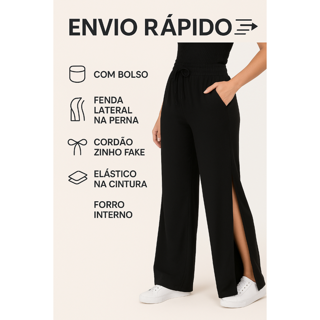 Calça Pantalona Fenda Lateral Cintura Alta com Cordão Forrada Feminina Moda