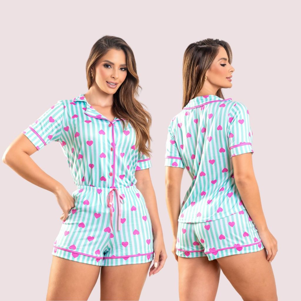 Pijama Americano Feminino Curto Botão Pós-Cirúrgico Amamentação Baby Doll de Verão