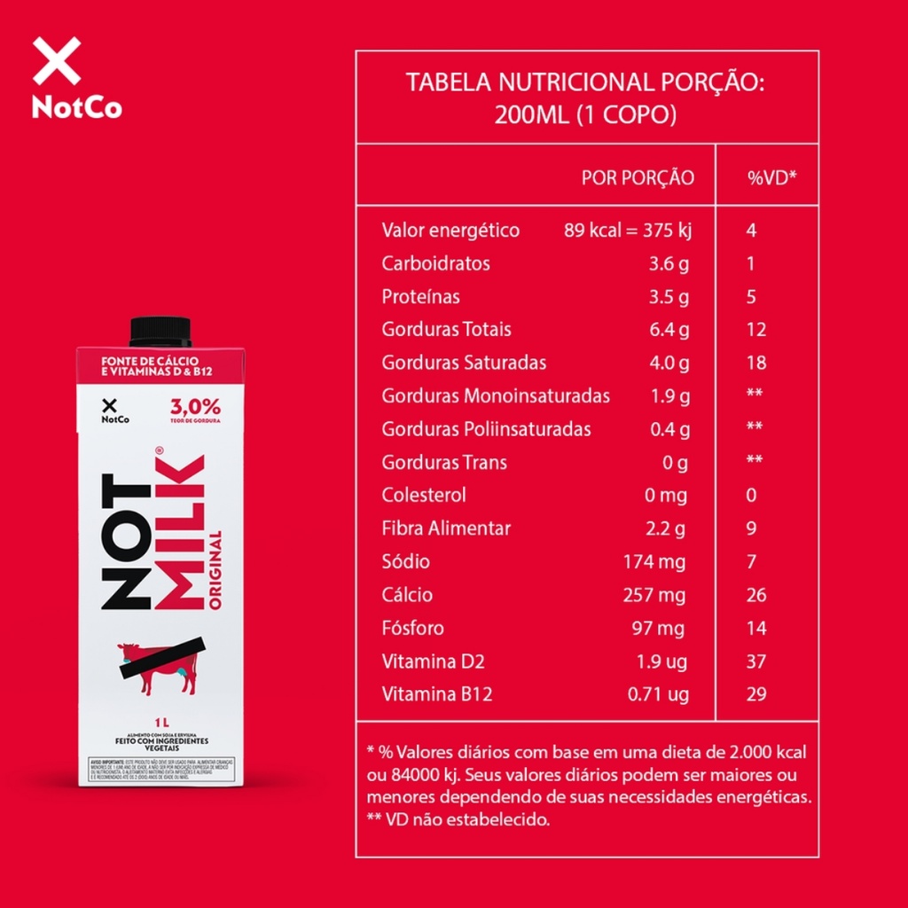 Leite Vegetal Sem Lactose Not Milk Integral Vegano 1L