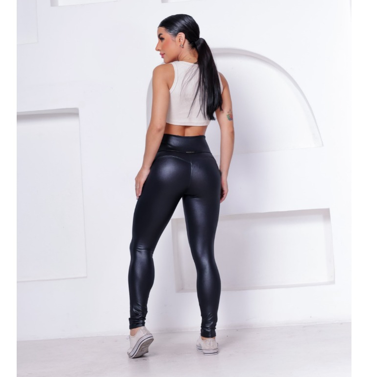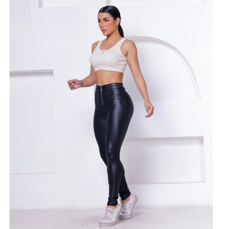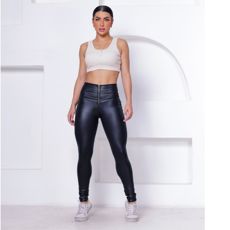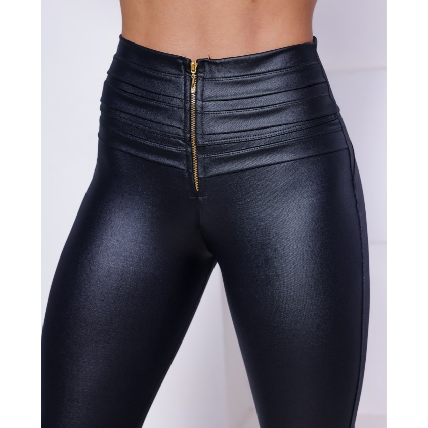 Calça Skinny Hot Pants Com Zíper Em Cirrê Couro Brilho Molhado WOLFOX Feminina Casual Social