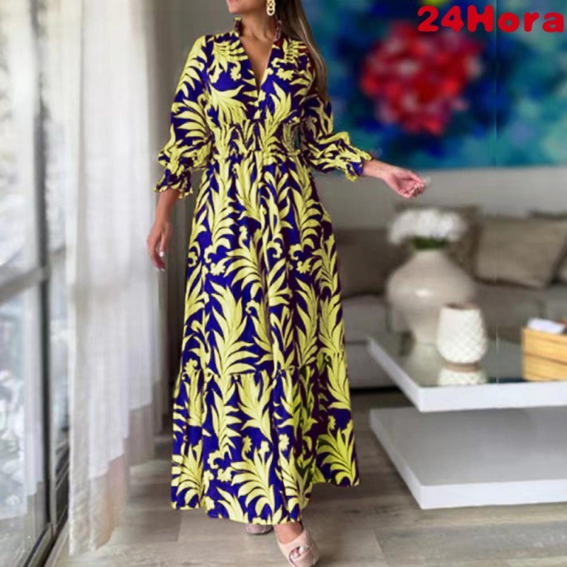 Vestido longo feminino boêmio manga longa com decote em V estampado