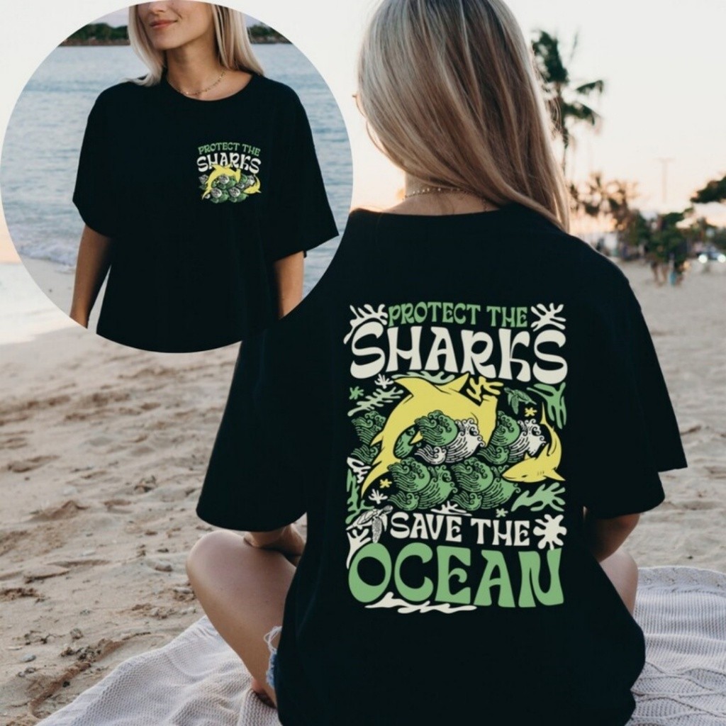 Camiseta Feminina Casual de Gola Redonda e Manga Curta com Estampa de Tubarão e Design de Proteção do Oceano