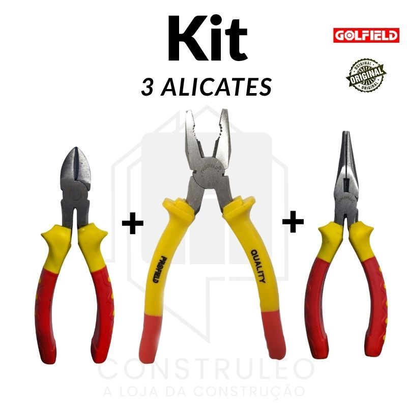 Alicate Universal 8" Aço Niquelado, Corte Diagonal 6" e Bico Meia Cana 6" Golfield – Profissional