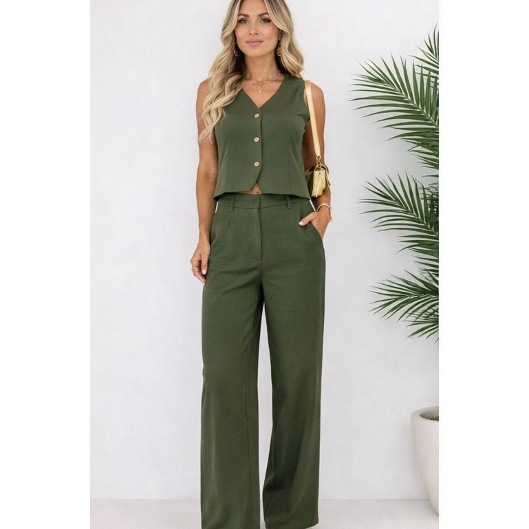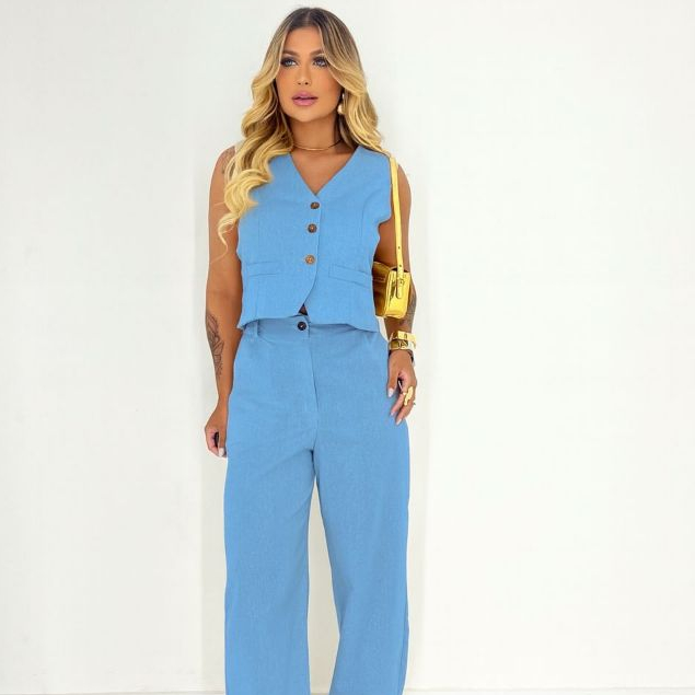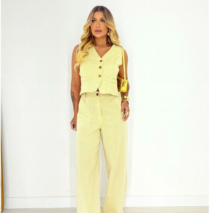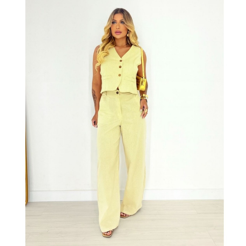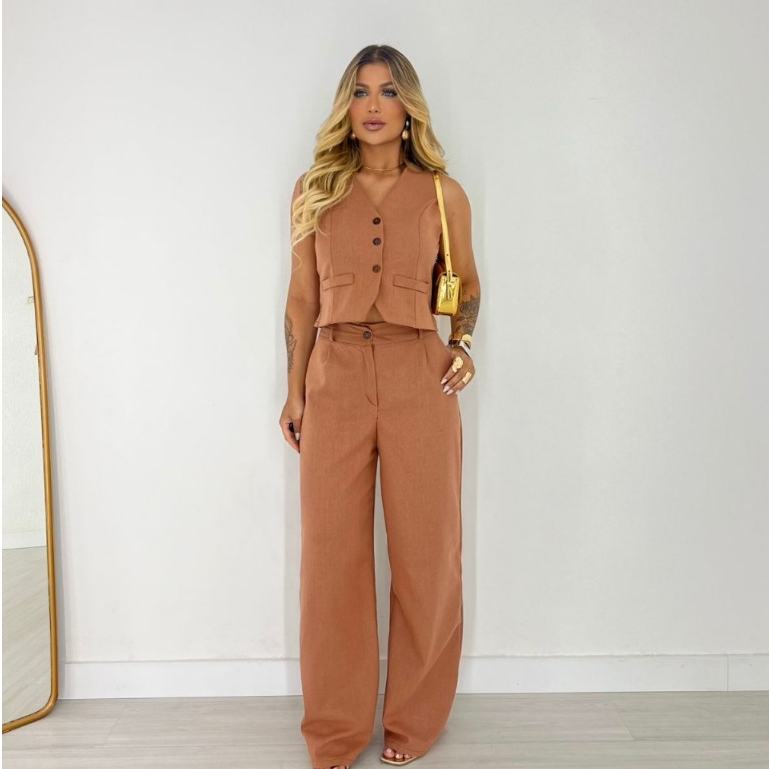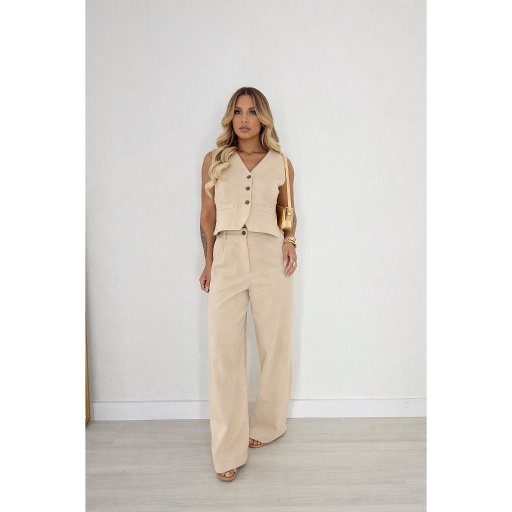 Conjunto Feminino de Linho com Blusa Cropped e Calça Longa – 2 Peças Elegantes