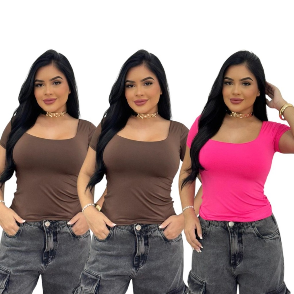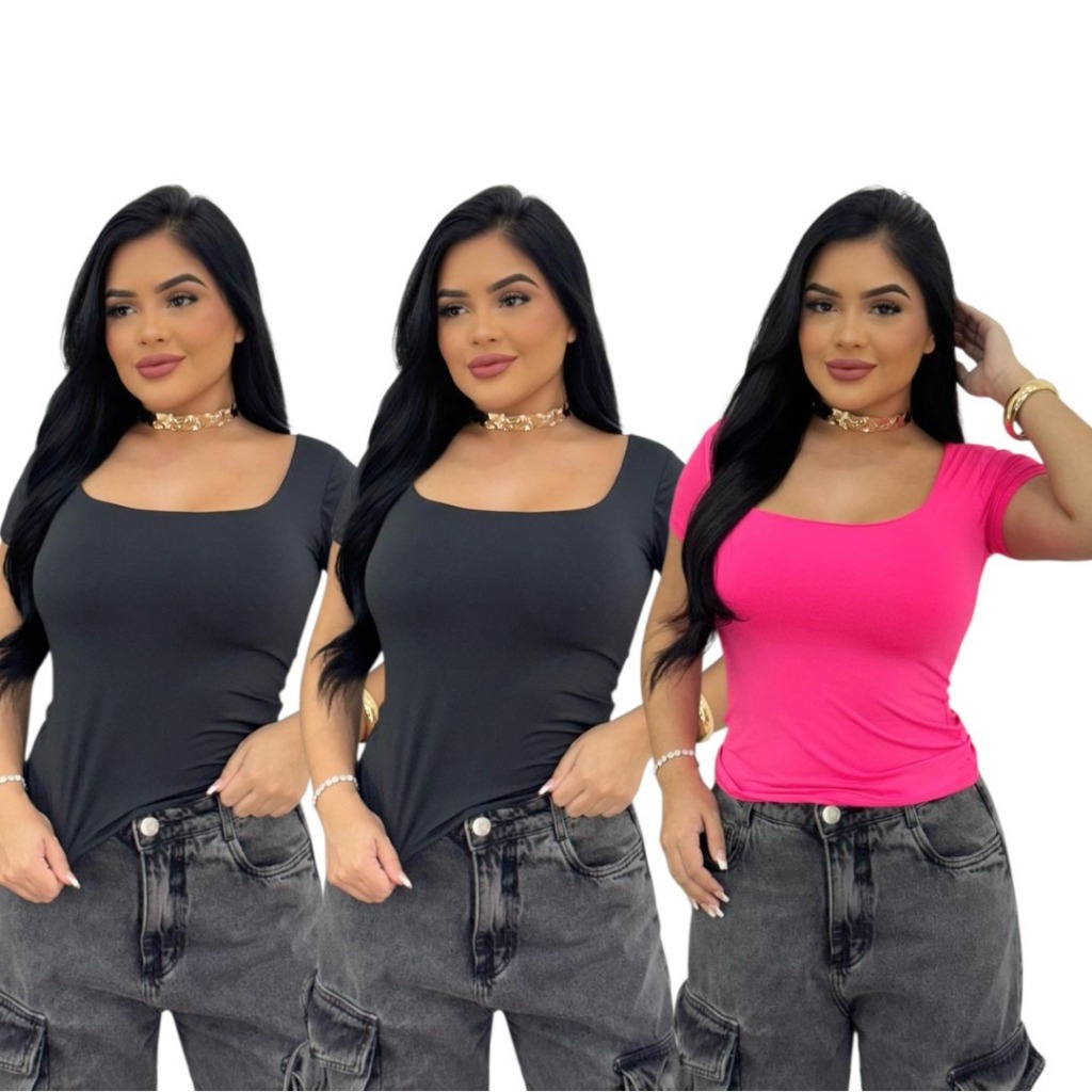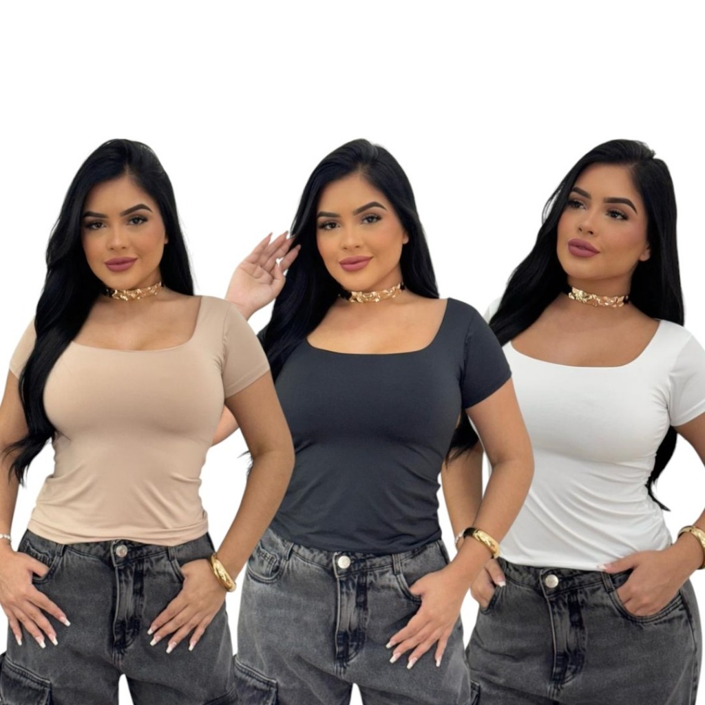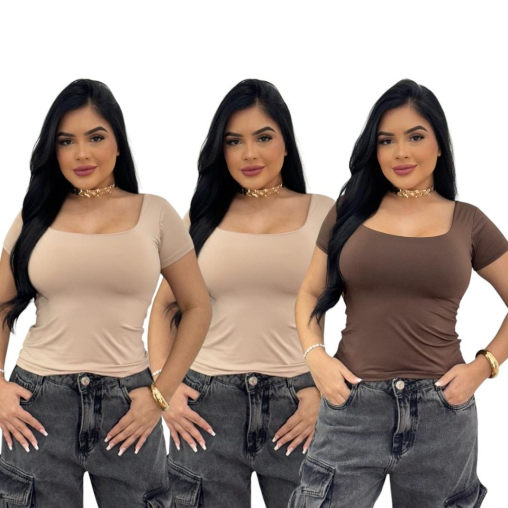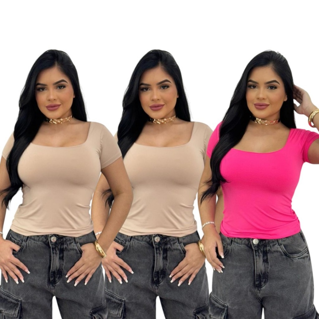 Kit 3 Blusa Feminina Suplex Decote Quadrado Forro Básica Premium Elegante Tshirt Casual Segunda Pele