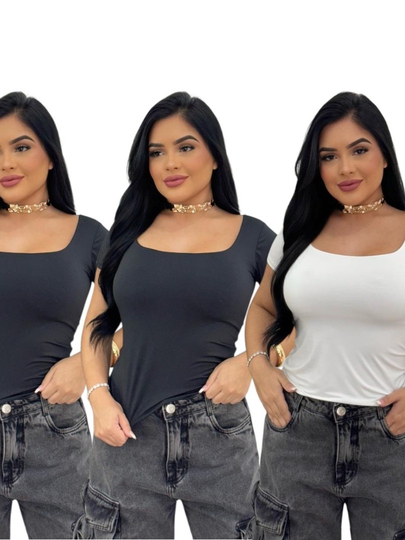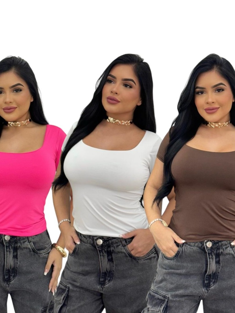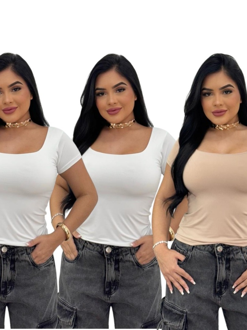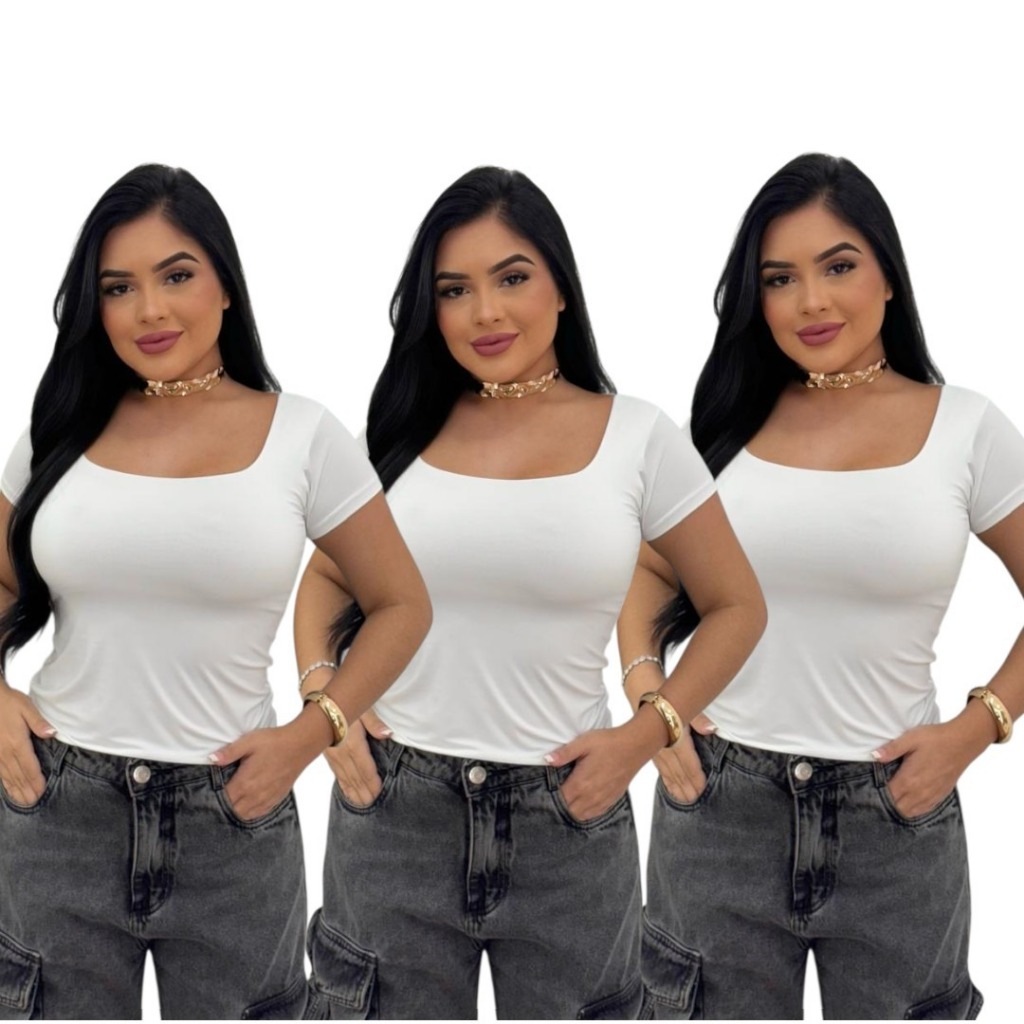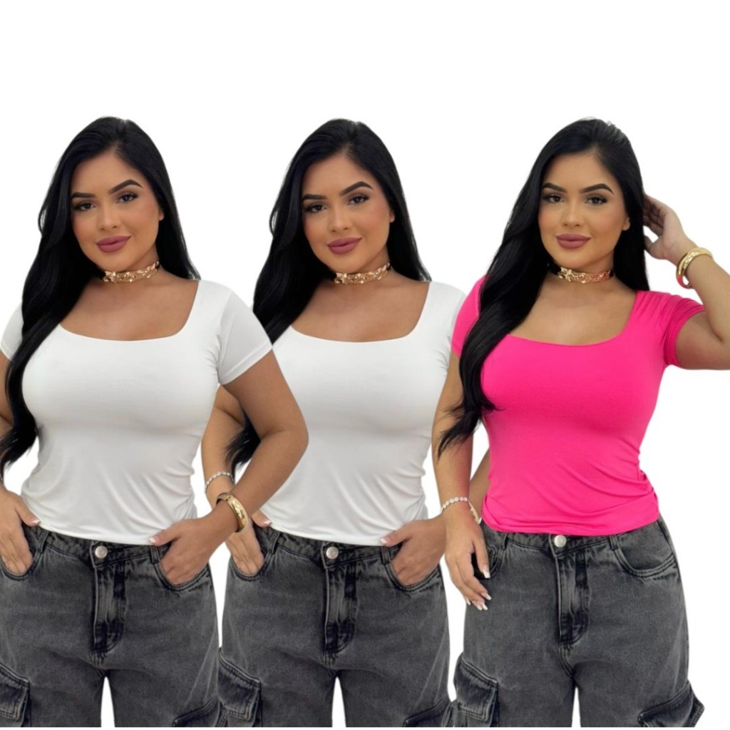Kit 3 Blusa Feminina Suplex Decote Quadrado Forro Básica Premium Elegante Tshirt Casual Segunda Pele