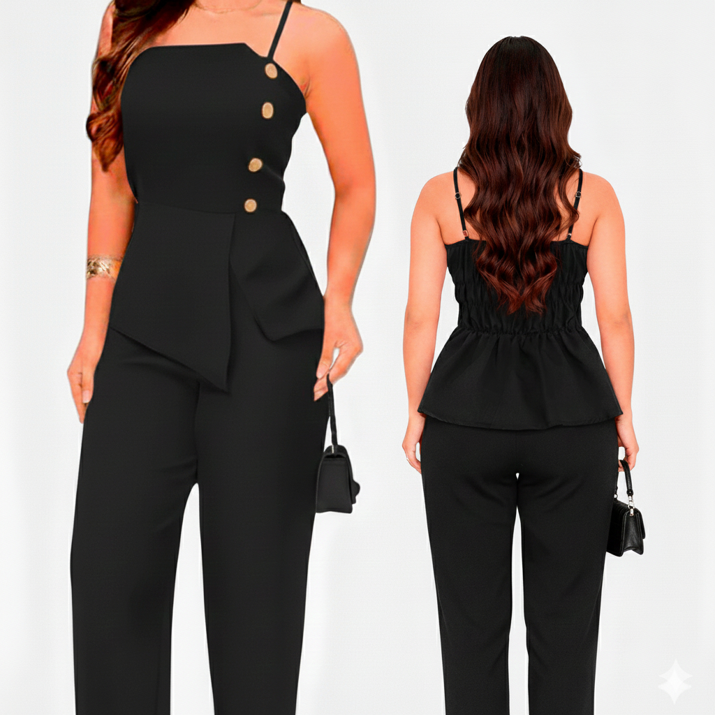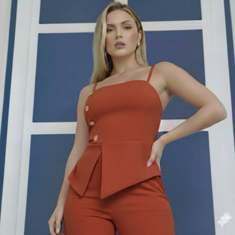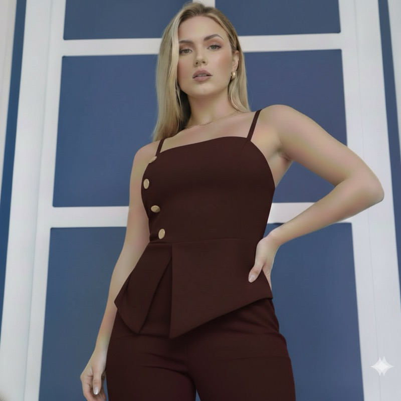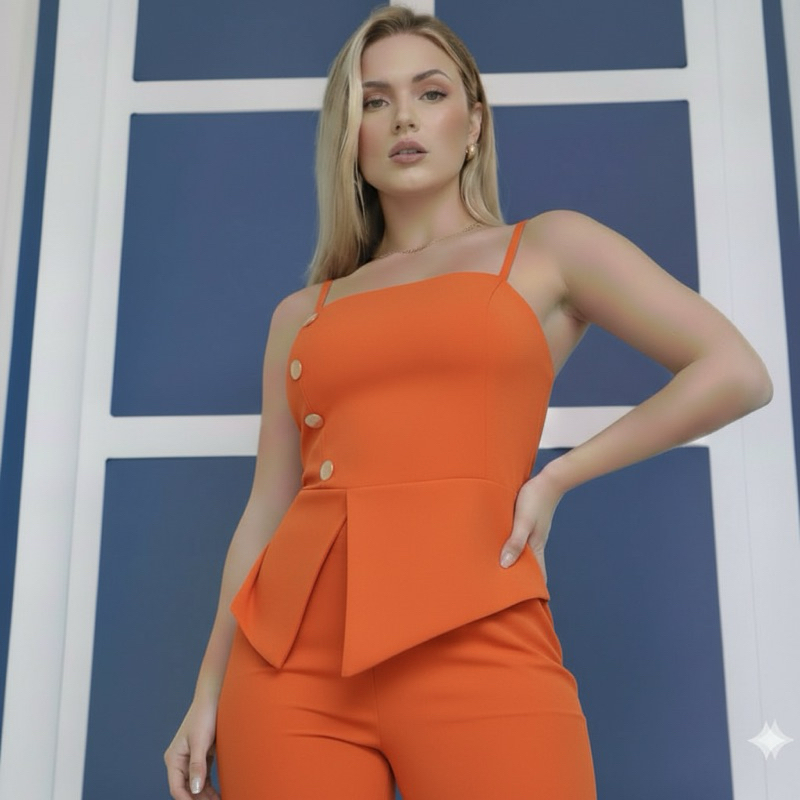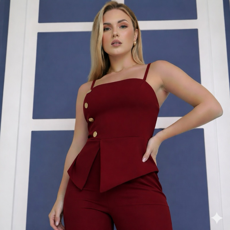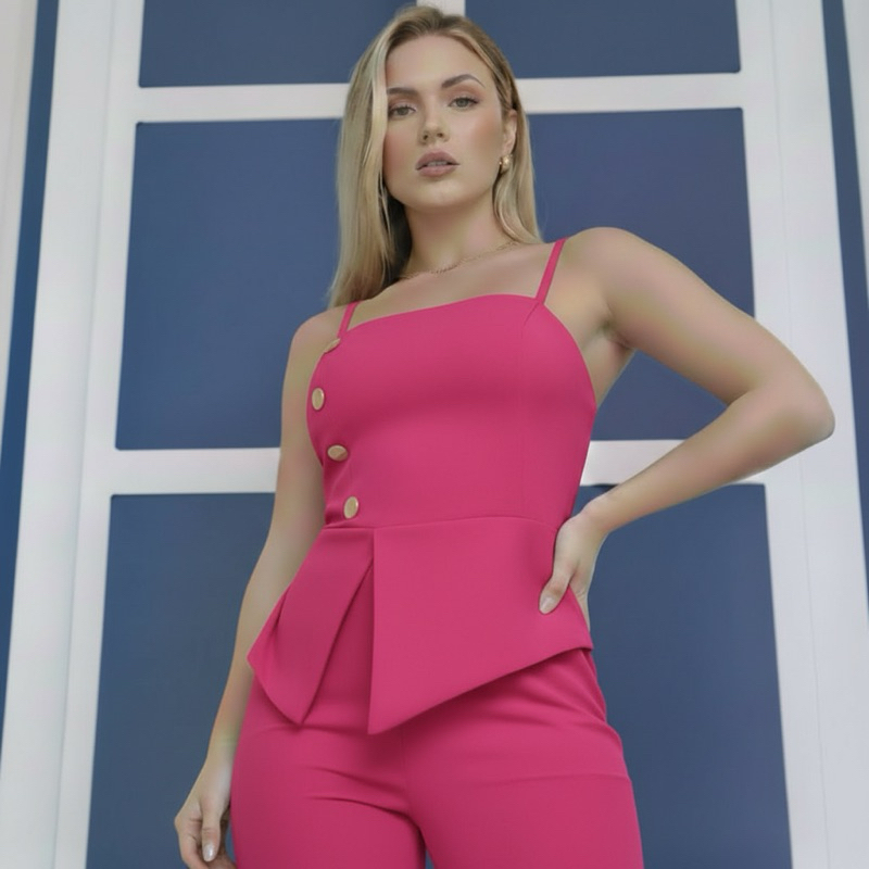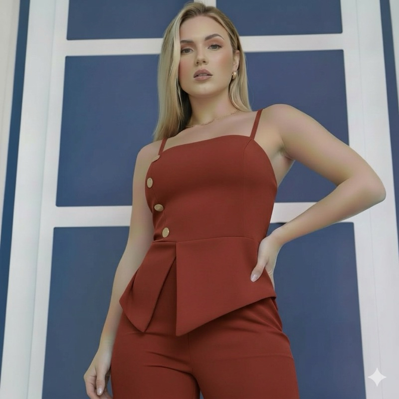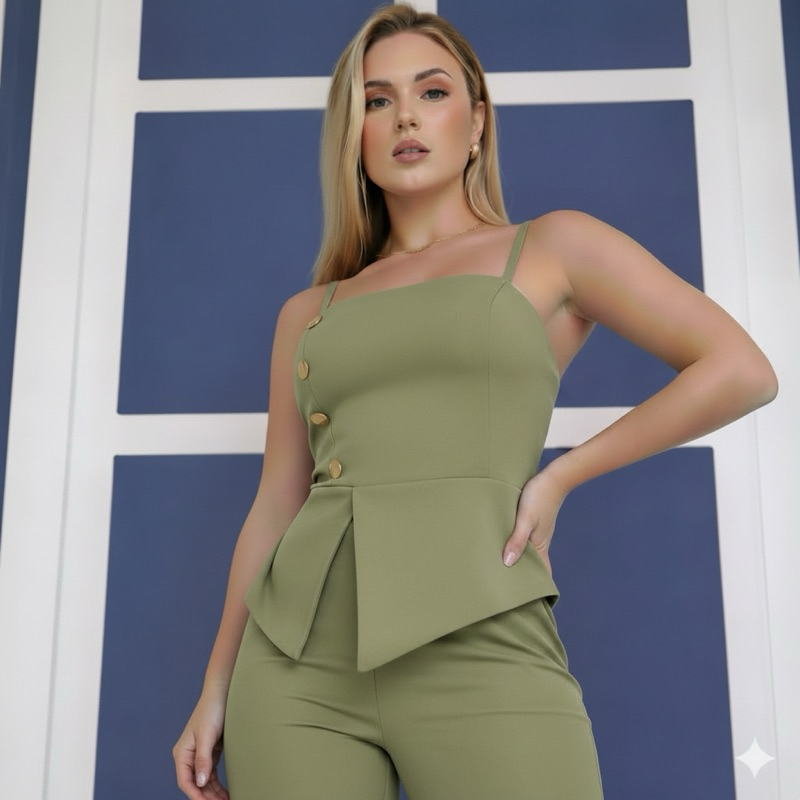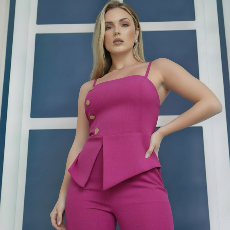 Conjunto com calça pantalona e blusa de alcinha em alfaiataria