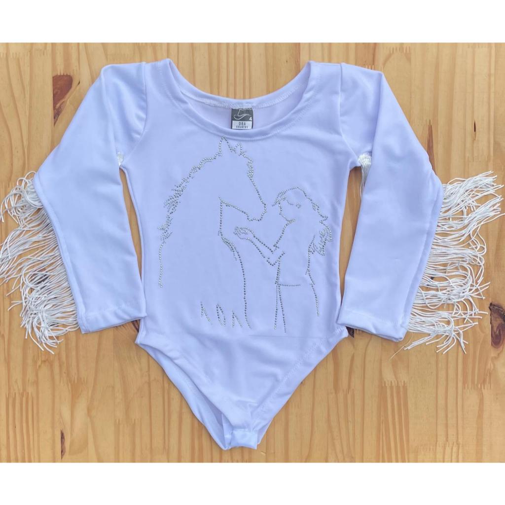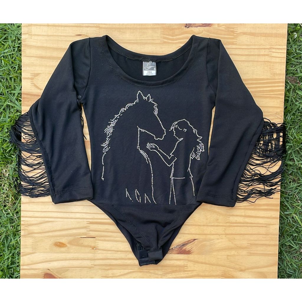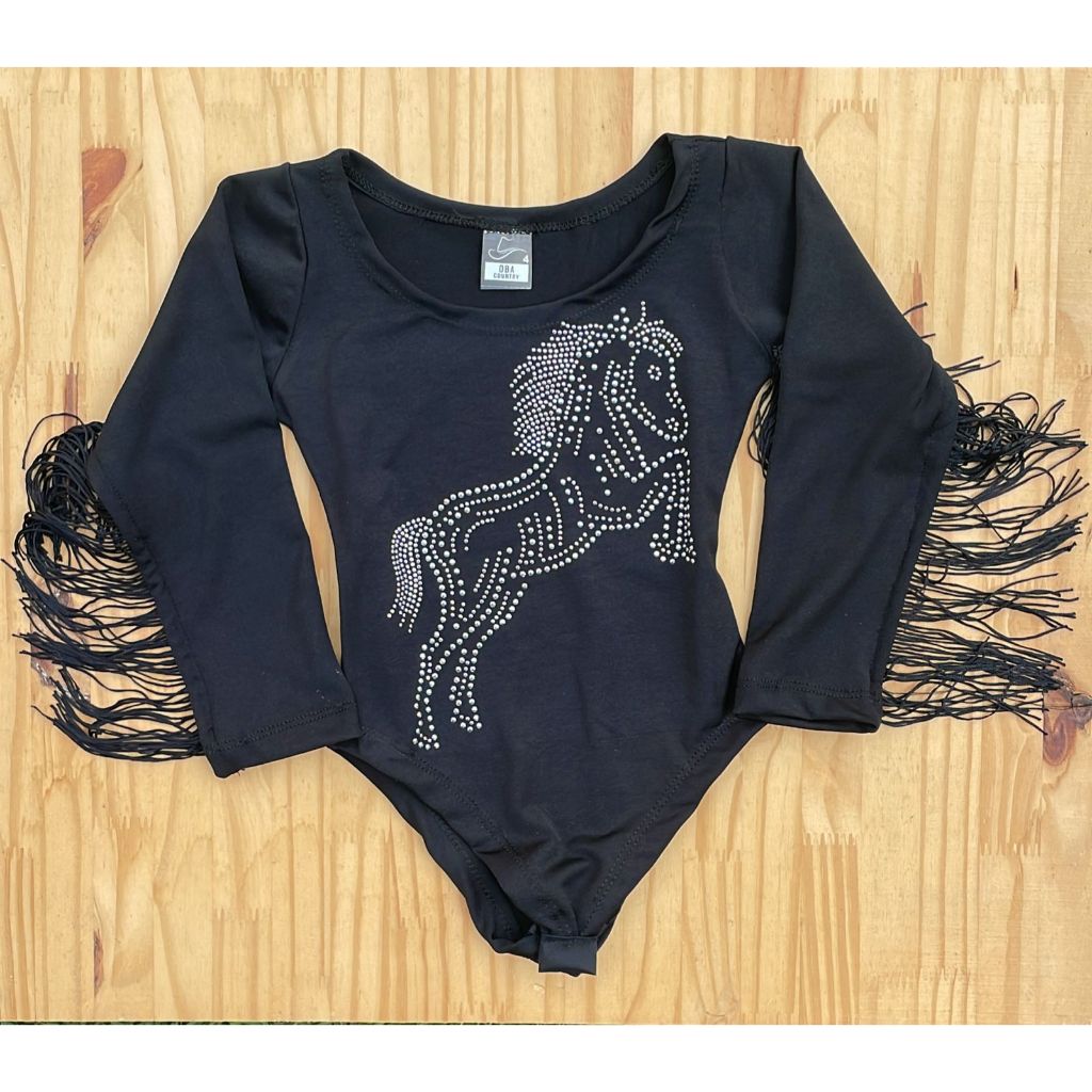Body Infantil Manga Longa Franja Menina Preto e Branco Pedraria Brilho Boiadeira Country Cavalo Rodeio Cowgirl