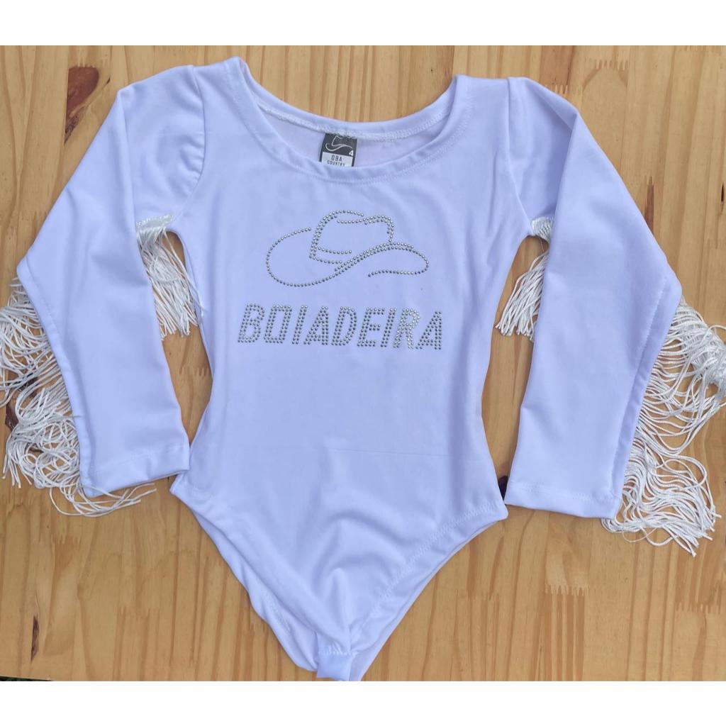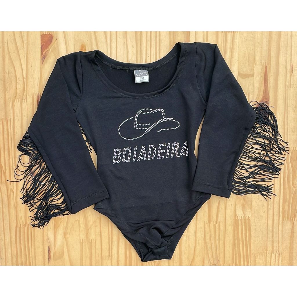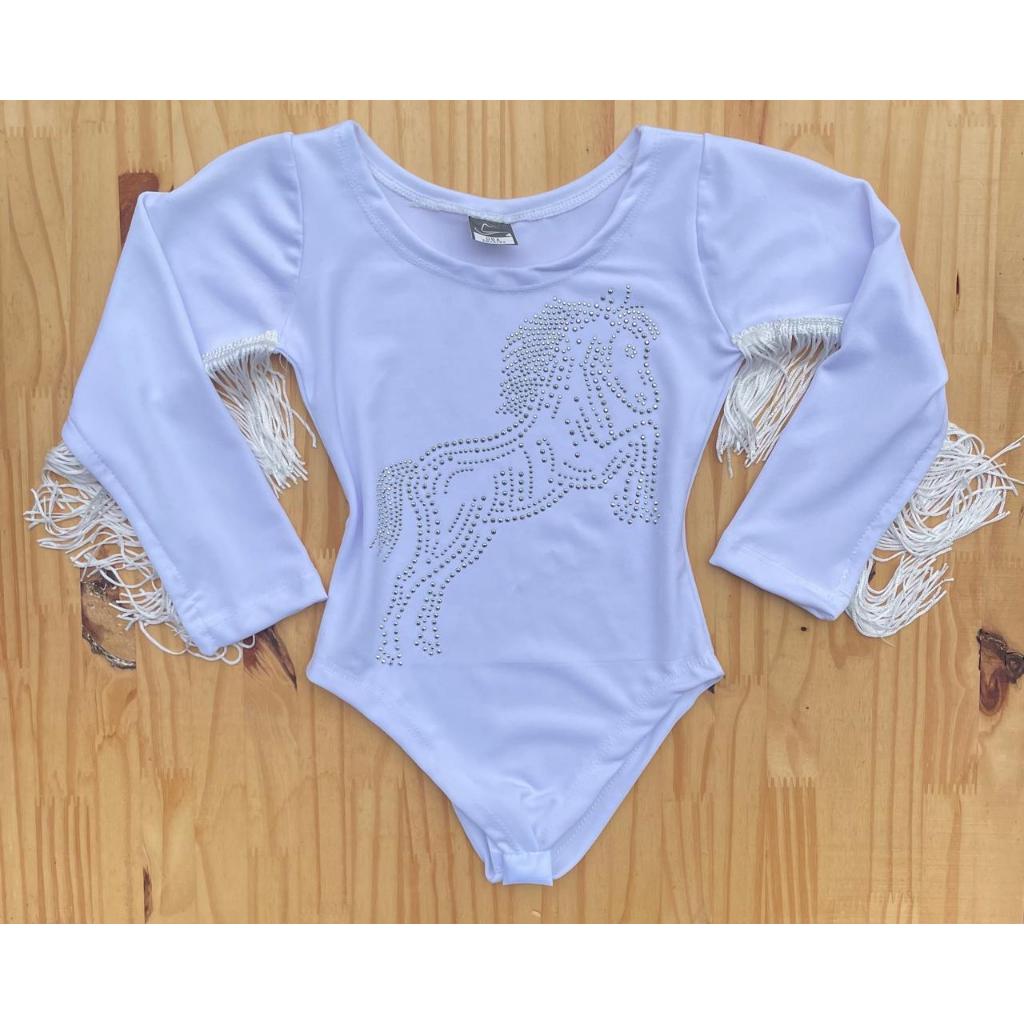 Body Infantil Manga Longa Franja Menina Preto e Branco Pedraria Brilho Boiadeira Country Cavalo Rodeio Cowgirl