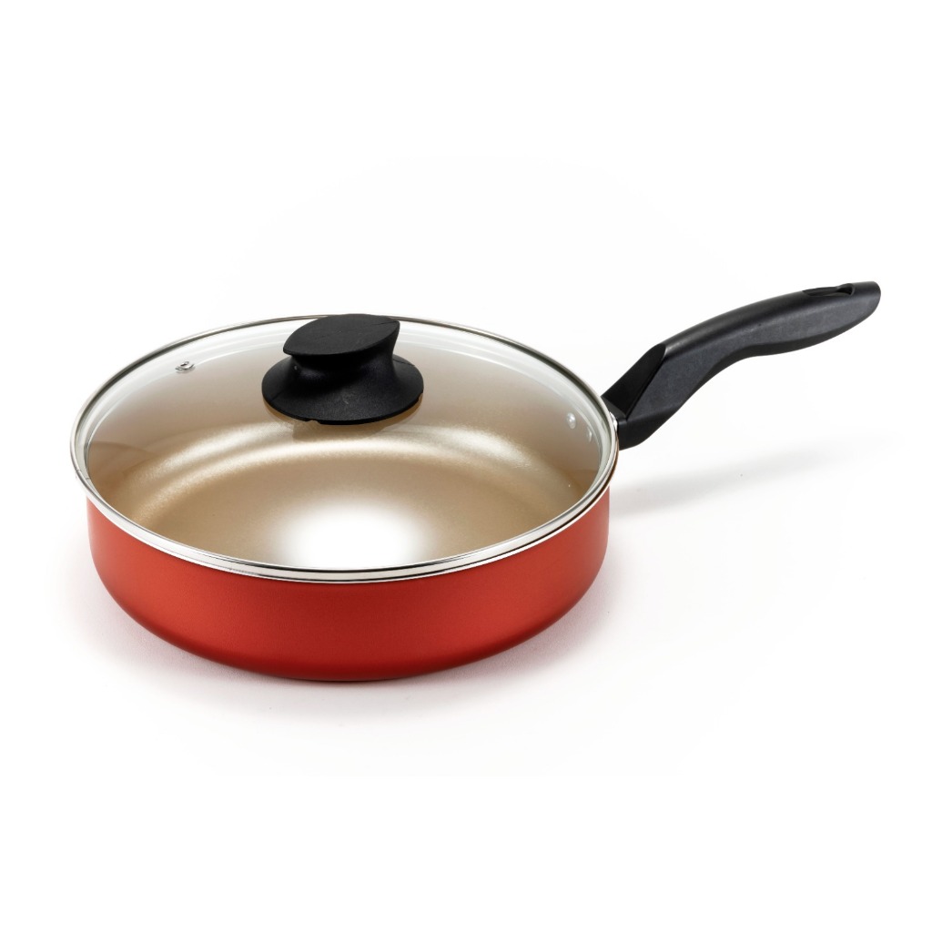 FRIGIDEIRA ANTIADERENTE 06 CAMADAS CEREJA E BEJE C/ TAMPA DE VIDRO