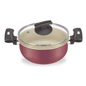 PANELA ANTIADERENTE 06 CAMADAS CEREJA E BEGE COM TAMPA DE VIDRO
