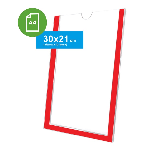Display A4 Expositor De Parede Acrílico Porta Folha 21x30cm com borda Vermelha
