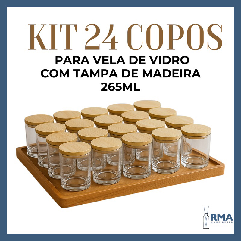 24 Copos De Vidro Whisky P/ Velas 265ml C/ Tampas De Madeira