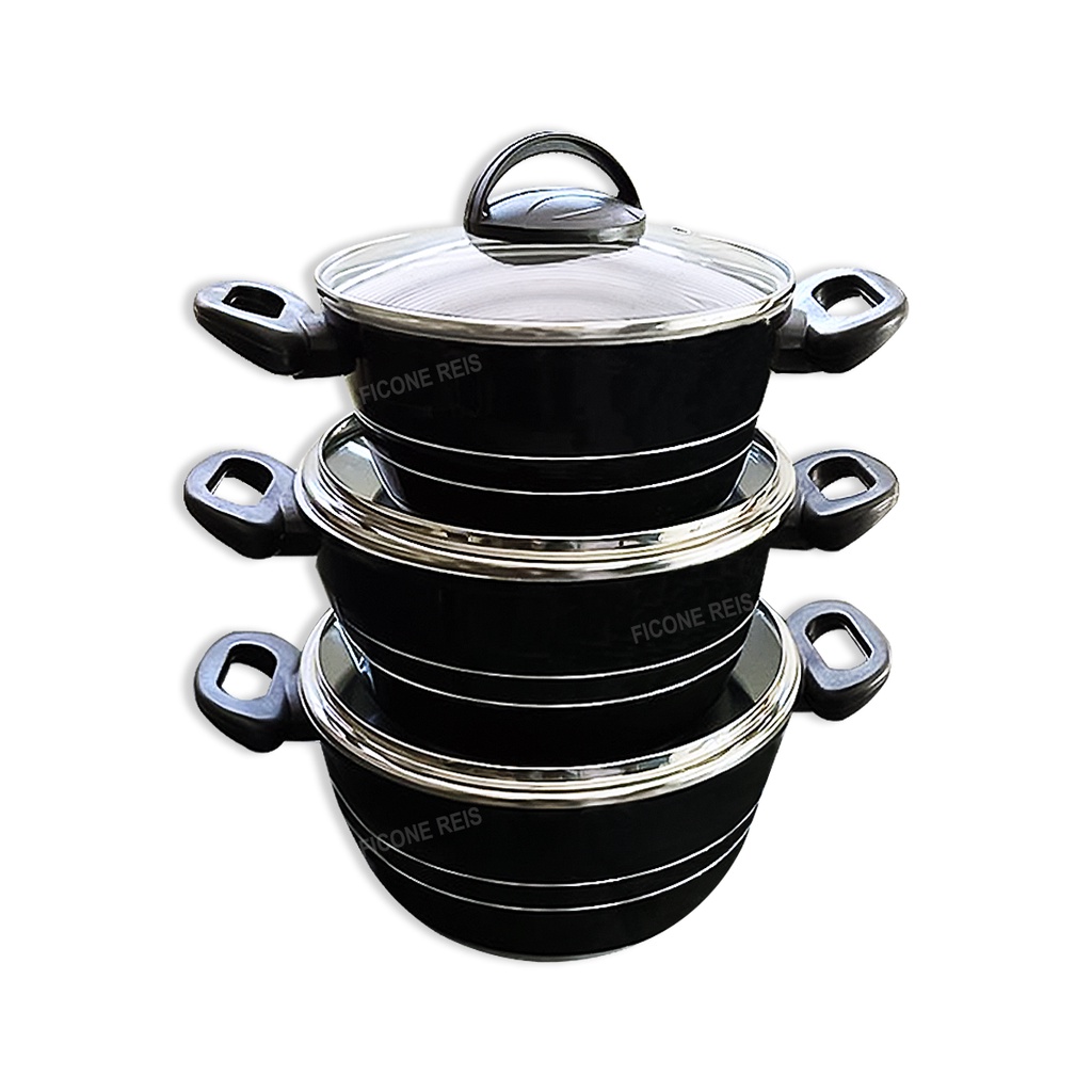 Jogo de Panelas 3 Peças Alumínio Antiaderente e Pintura Preto Brilhante com Tampa de Vidro