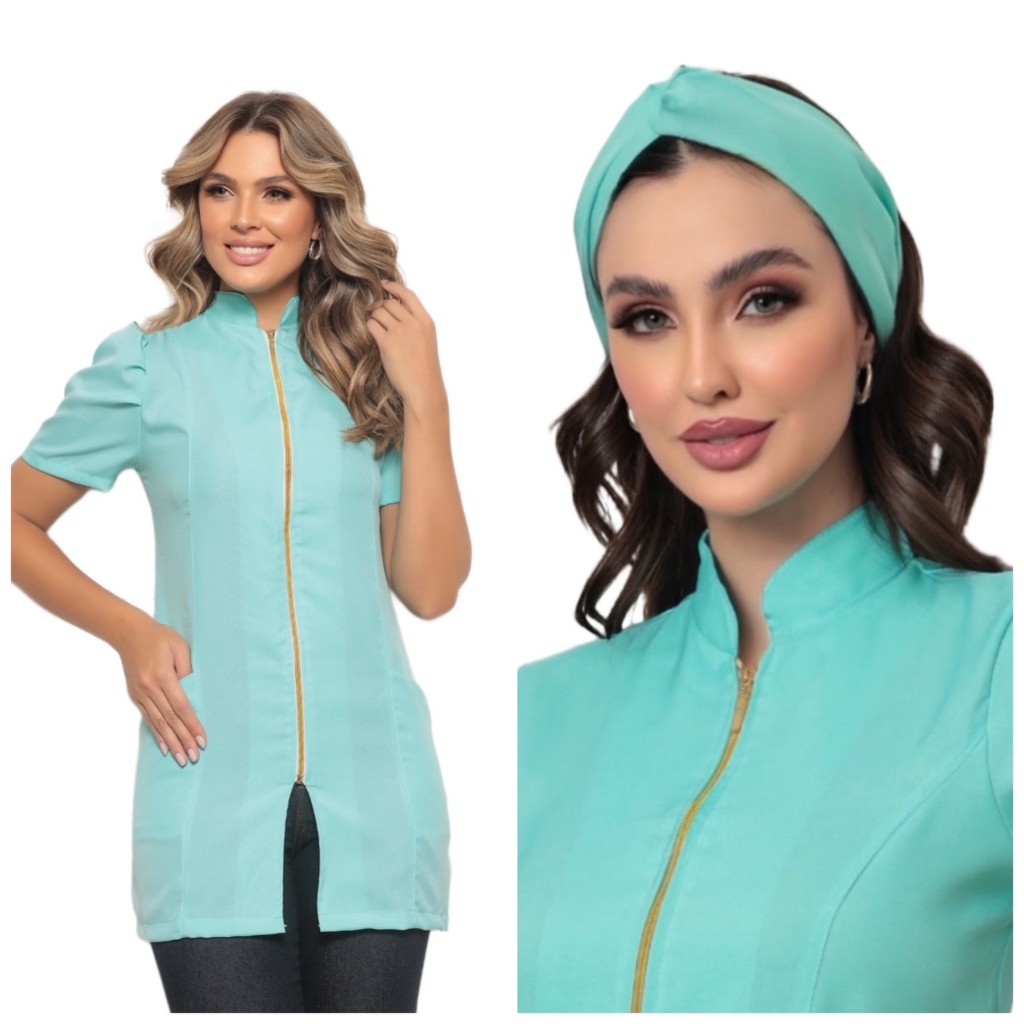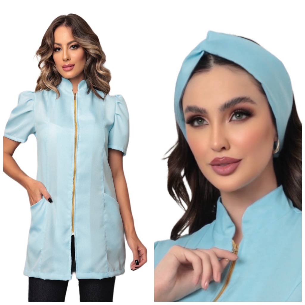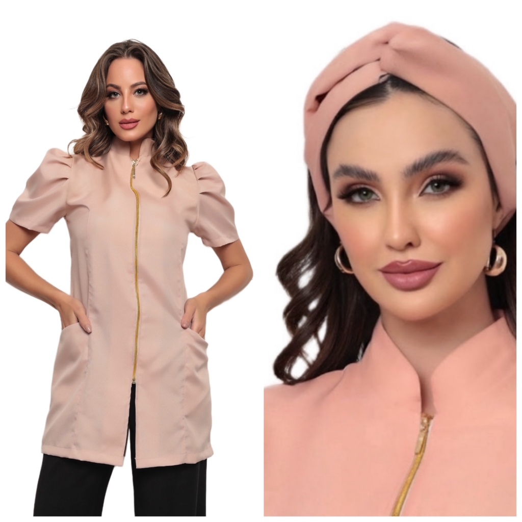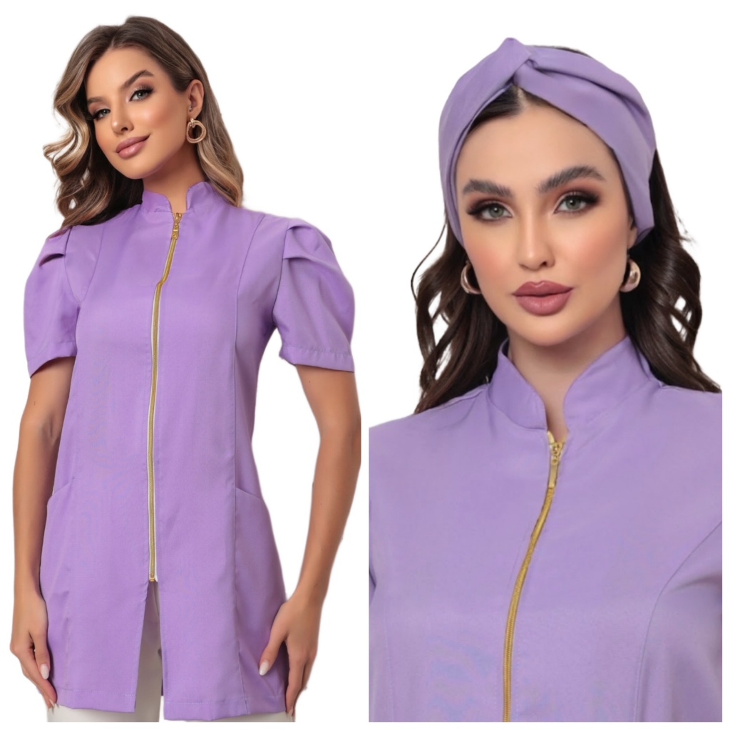 Jaleco Feminino Manga Curta Bufante Zíper Mara Várias Cores + Turbante Gardenia Jalecos