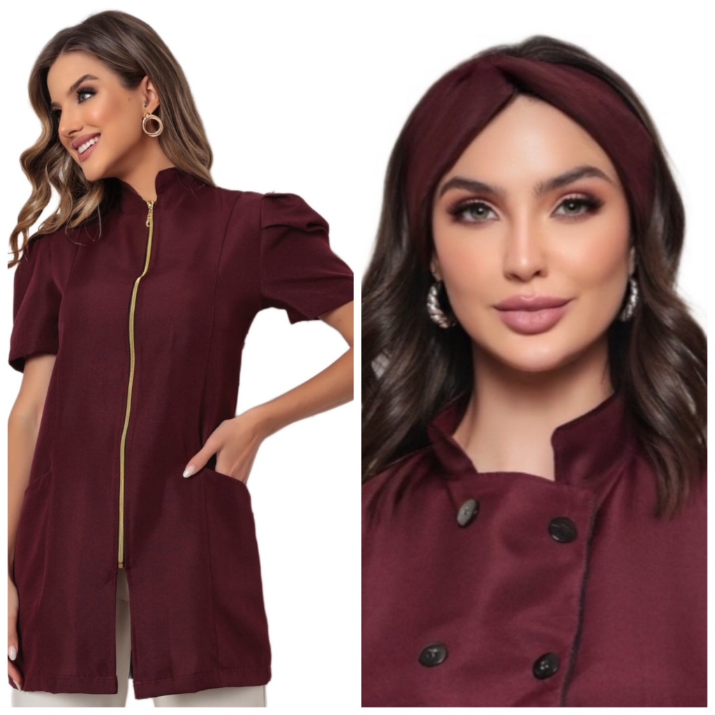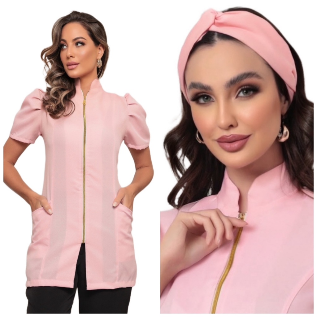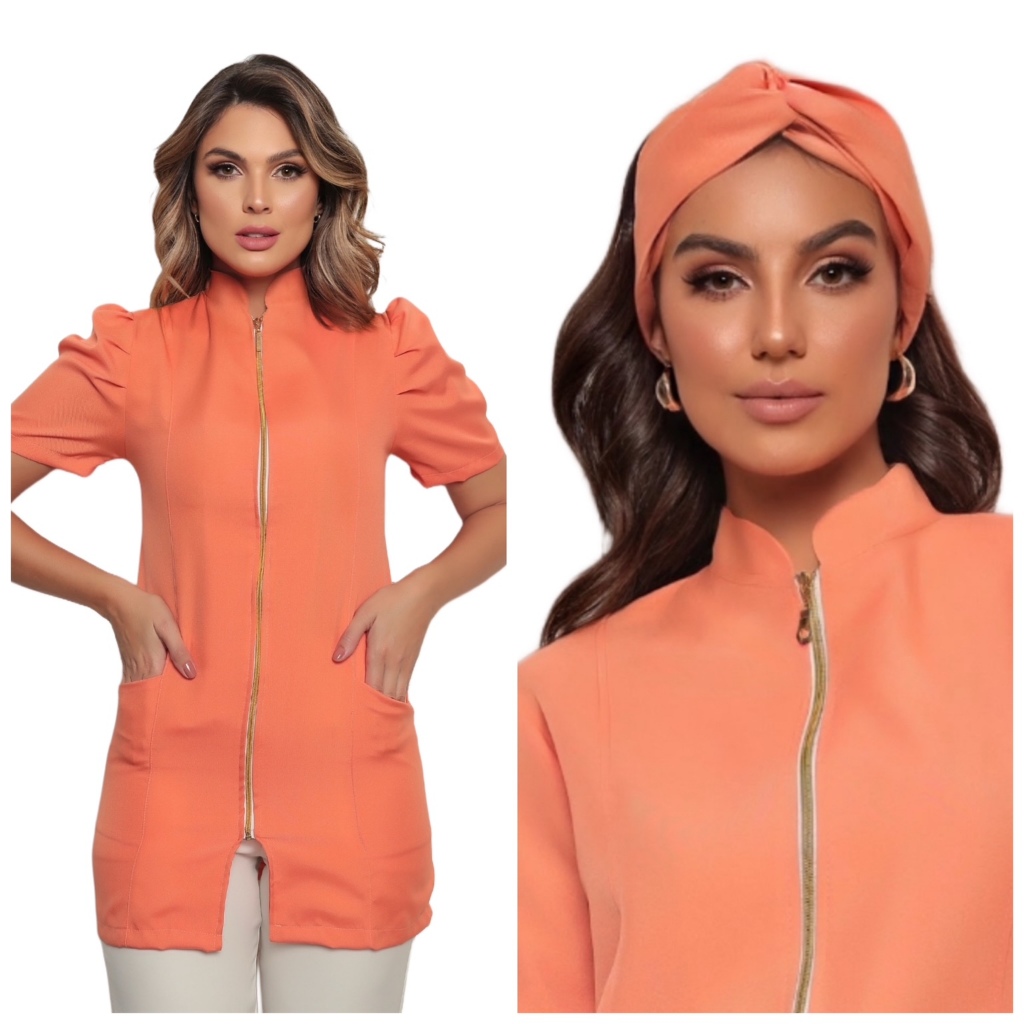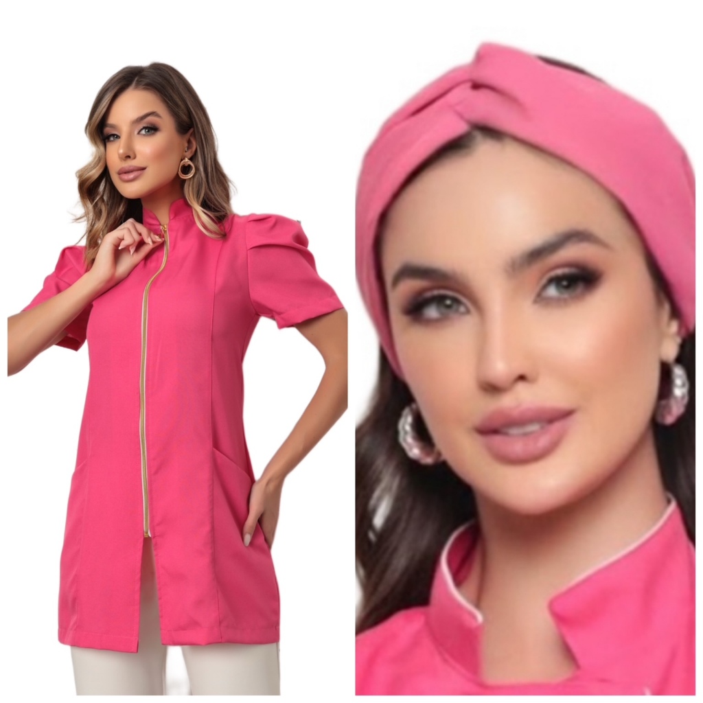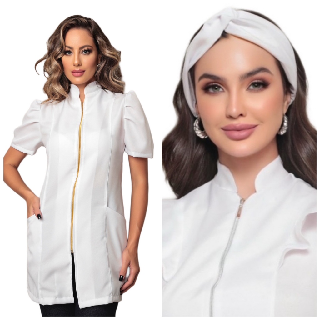Jaleco Feminino Manga Curta Bufante Zíper Mara Várias Cores + Turbante Gardenia Jalecos