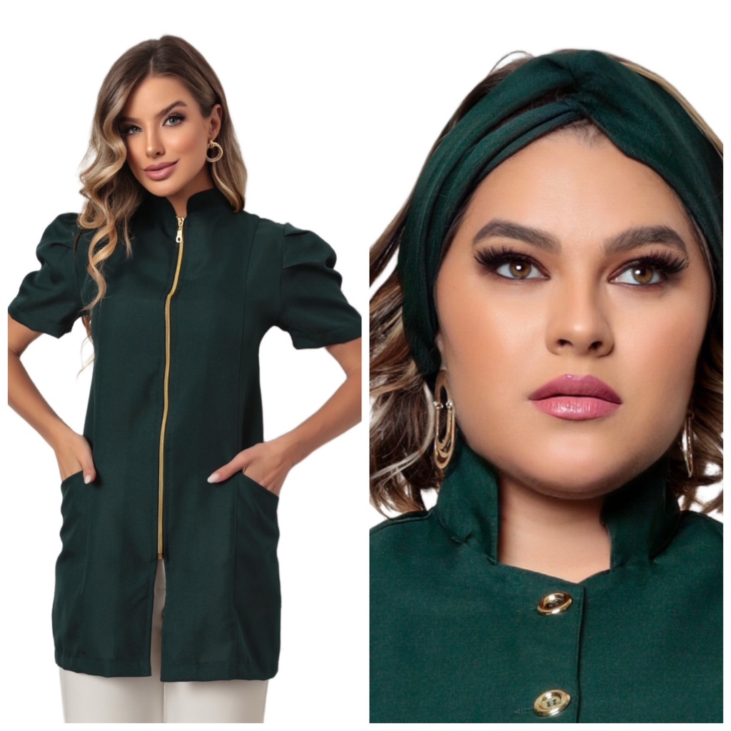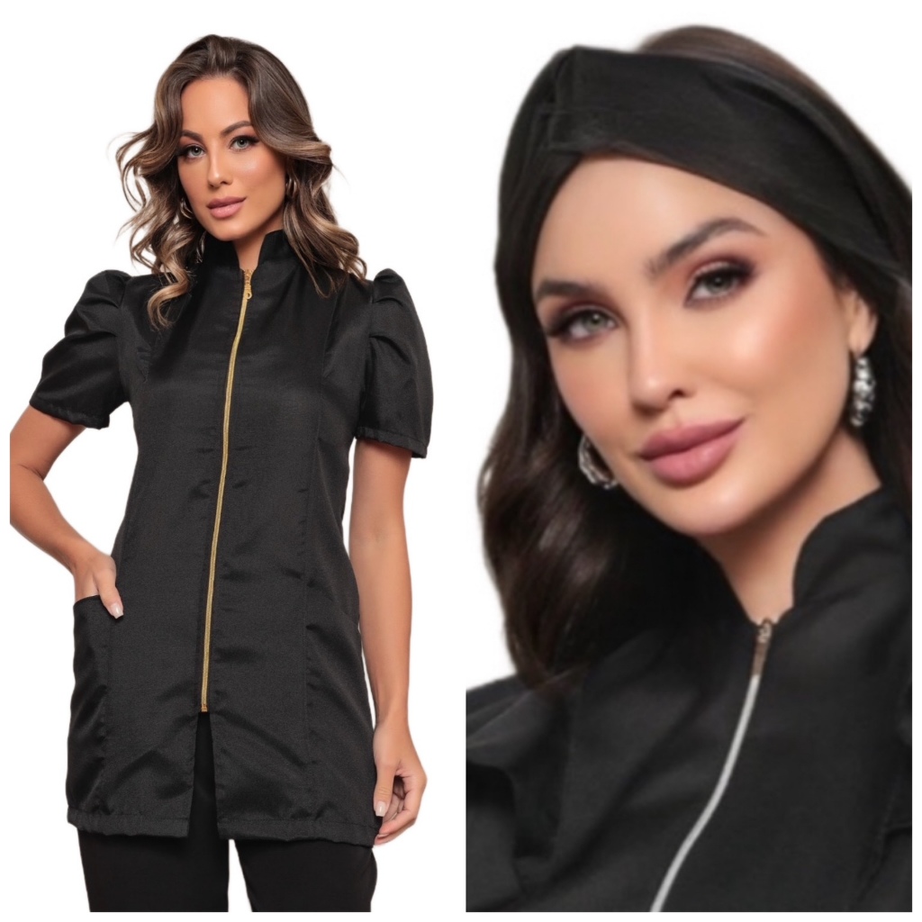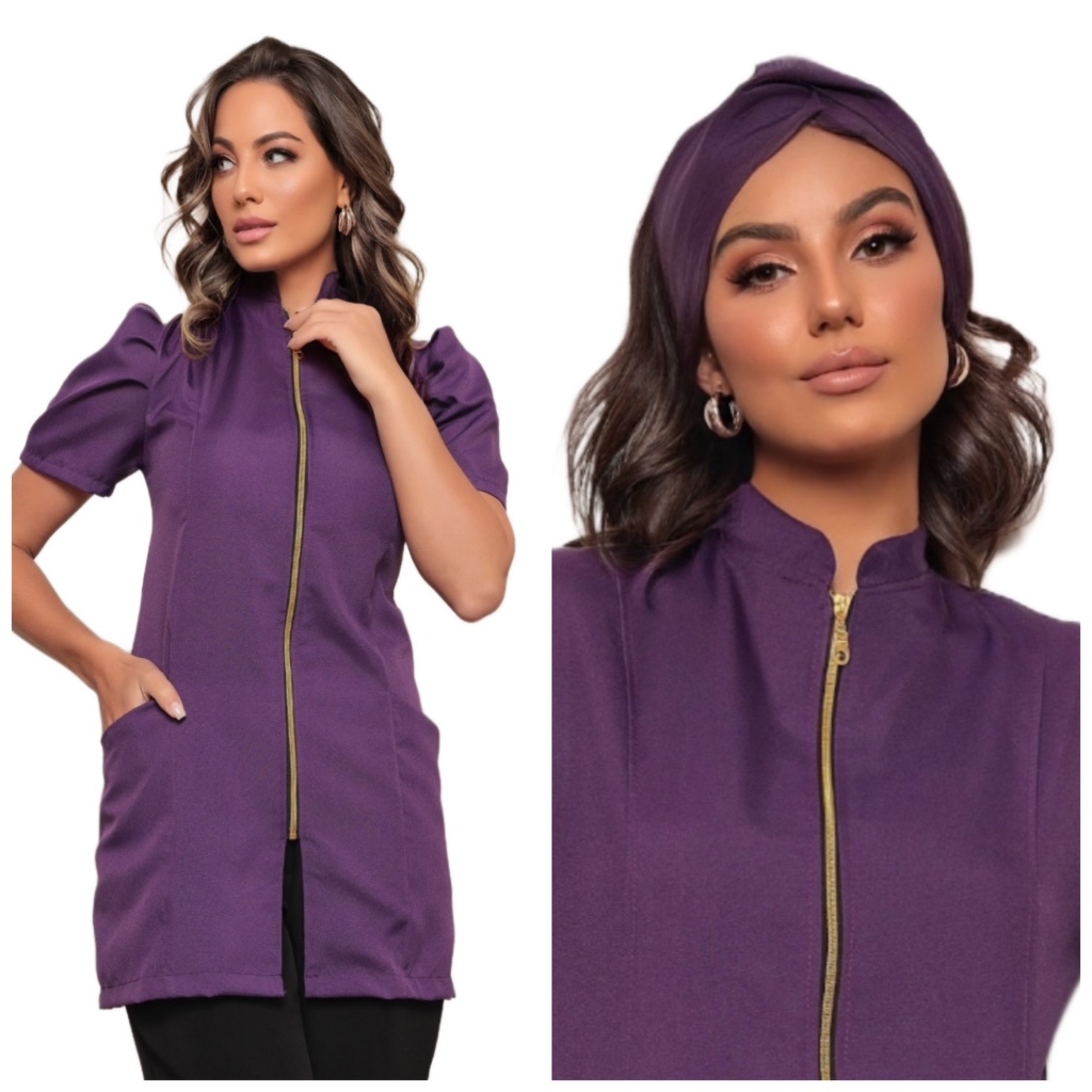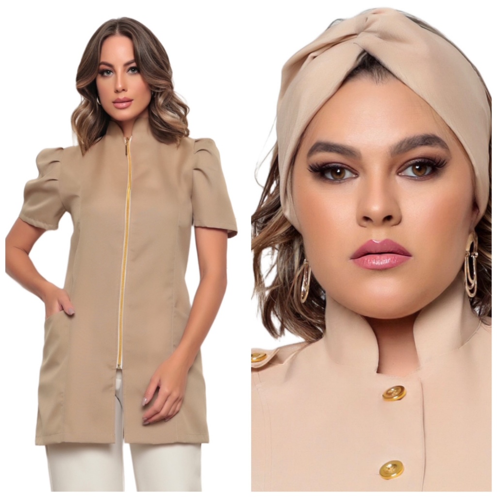Jaleco Feminino Manga Curta Bufante Zíper Mara Várias Cores + Turbante Gardenia Jalecos