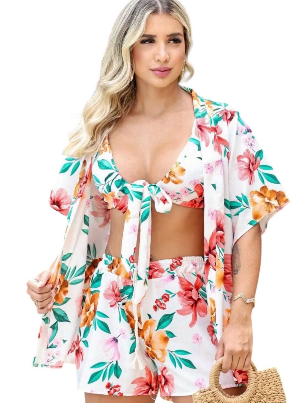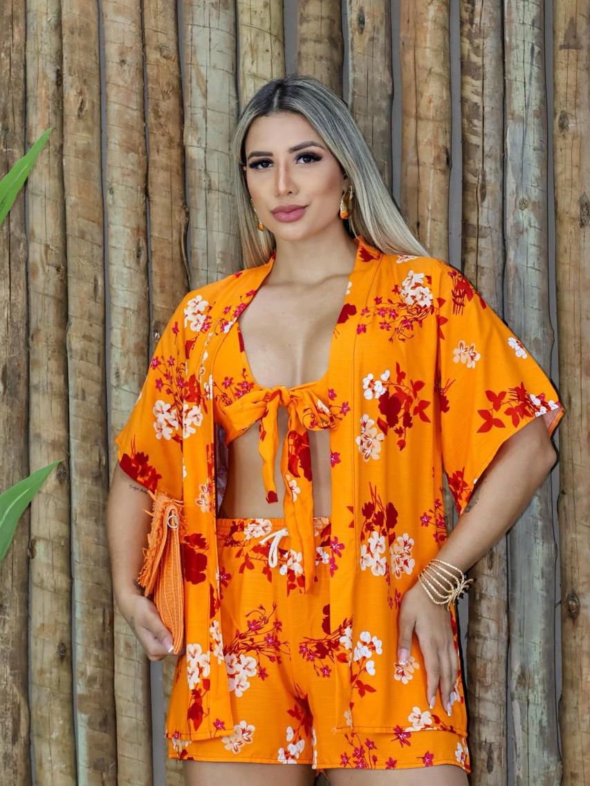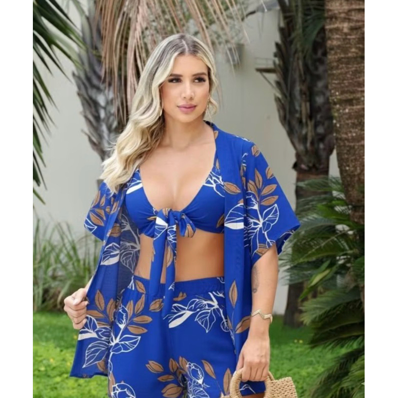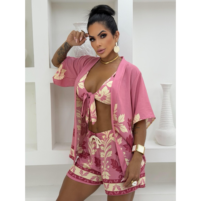 Conjunto Kimono 3 peças Moda Gringa Moda Praia Look Feminino Top Com Bojo