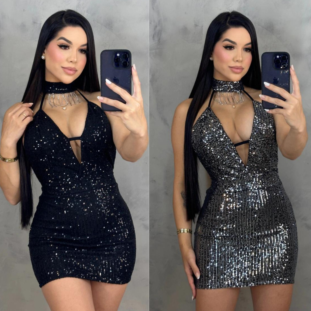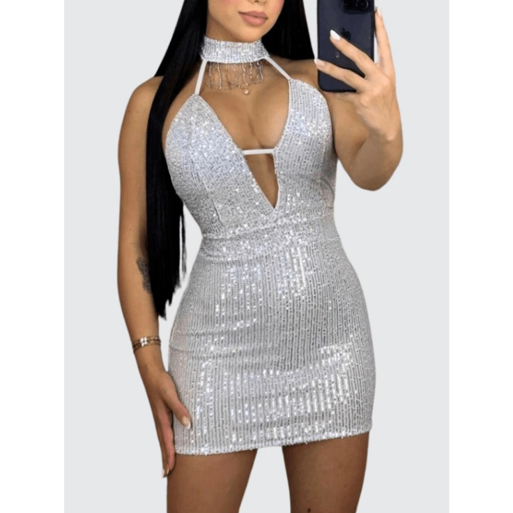 Vestido feminino Decotado em paetê curto moda pecuária festas gola alta c/ strass brilho balada