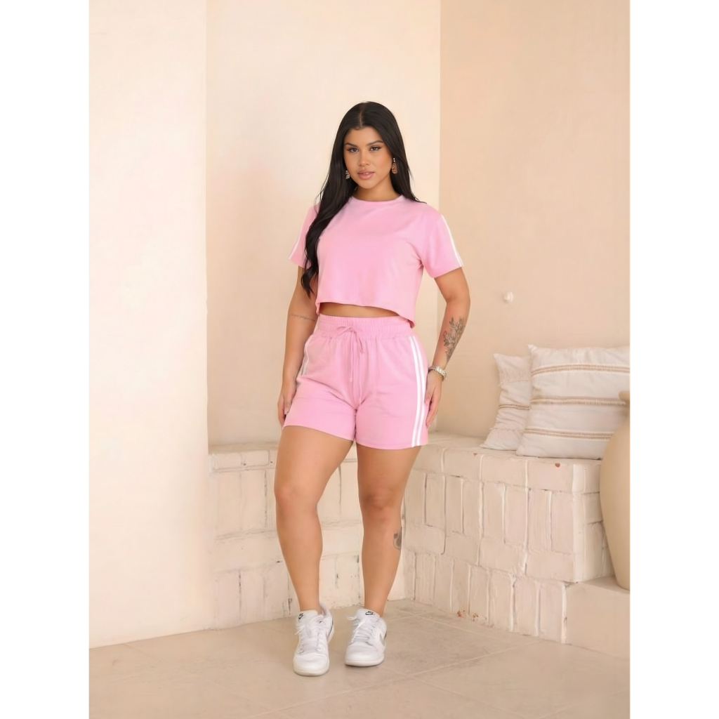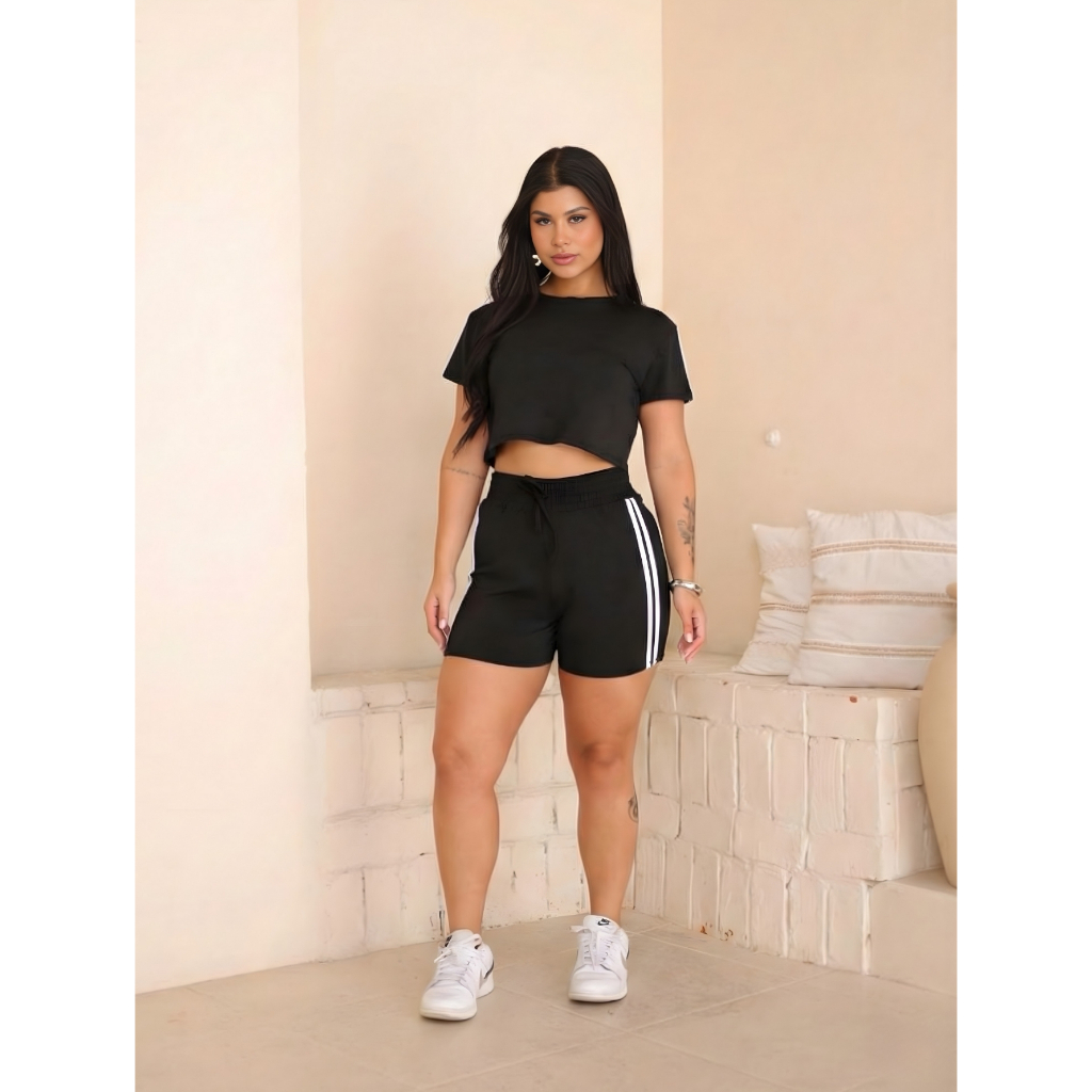 Conjunto Feminino Gringa Short Cós Alto + Cropped Listras Lateral Moda Verão Blogueira