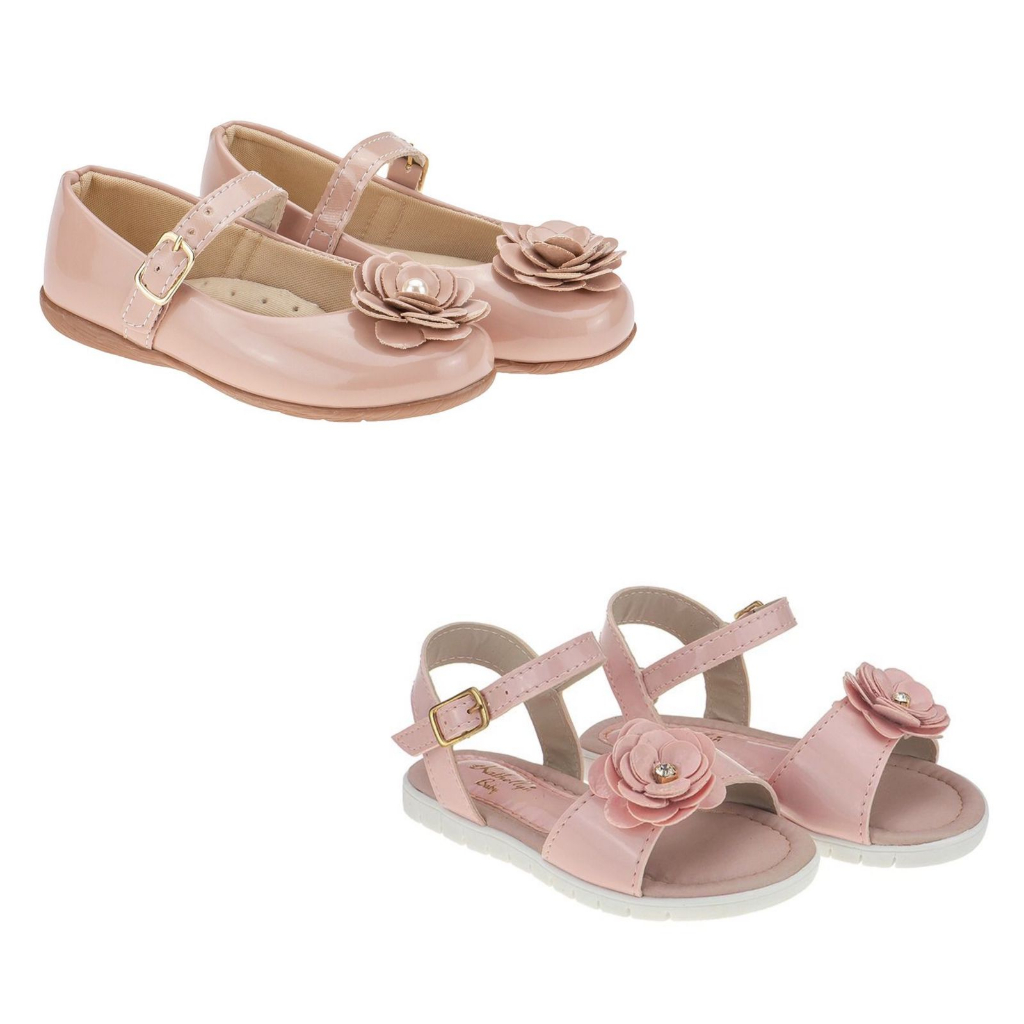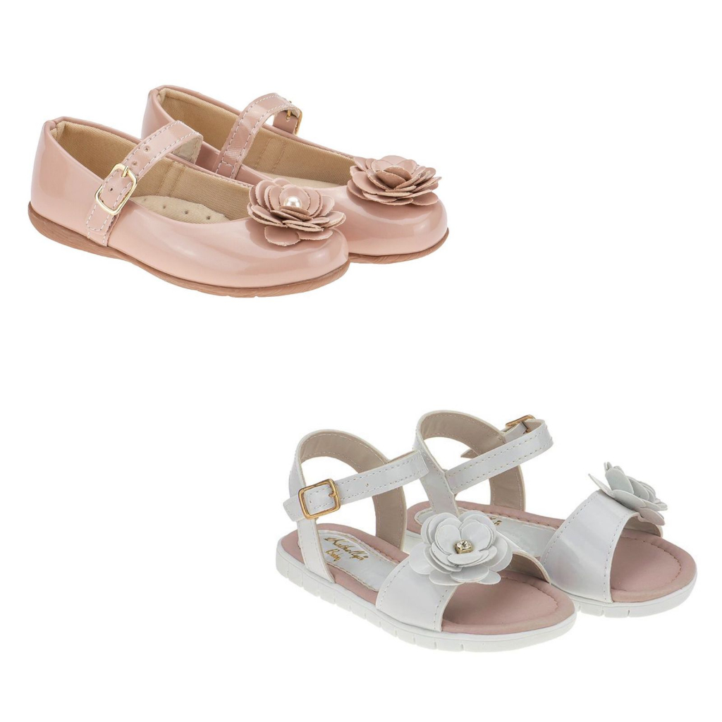 Kit 2 Pares Sapatilha e Sandália Menina Flor Nude Preto Branco Infantil Feminina Casual Festa Confortavel Daminha Macio