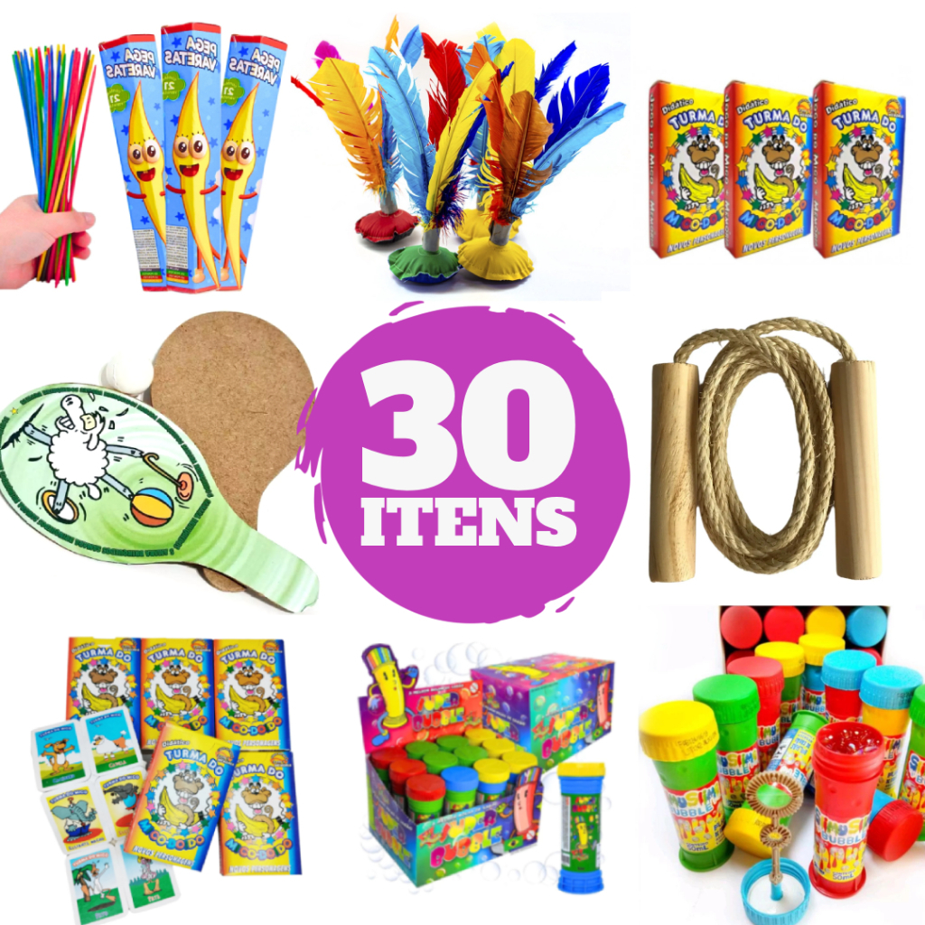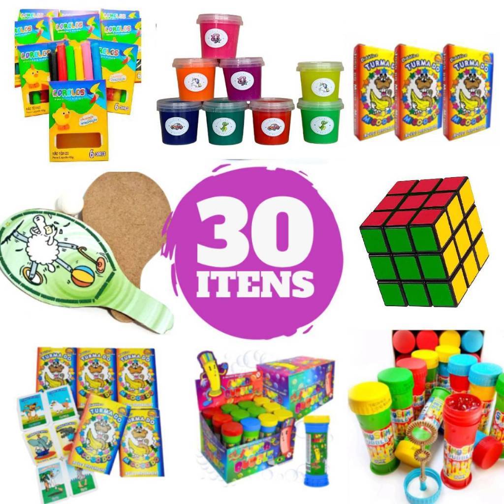 Kit 30 Brinquedos Infantil Lembrancinha Sacolinha Surpresa Pega Varetas Cubo Mágico Peteca Bolha