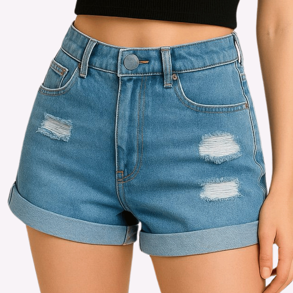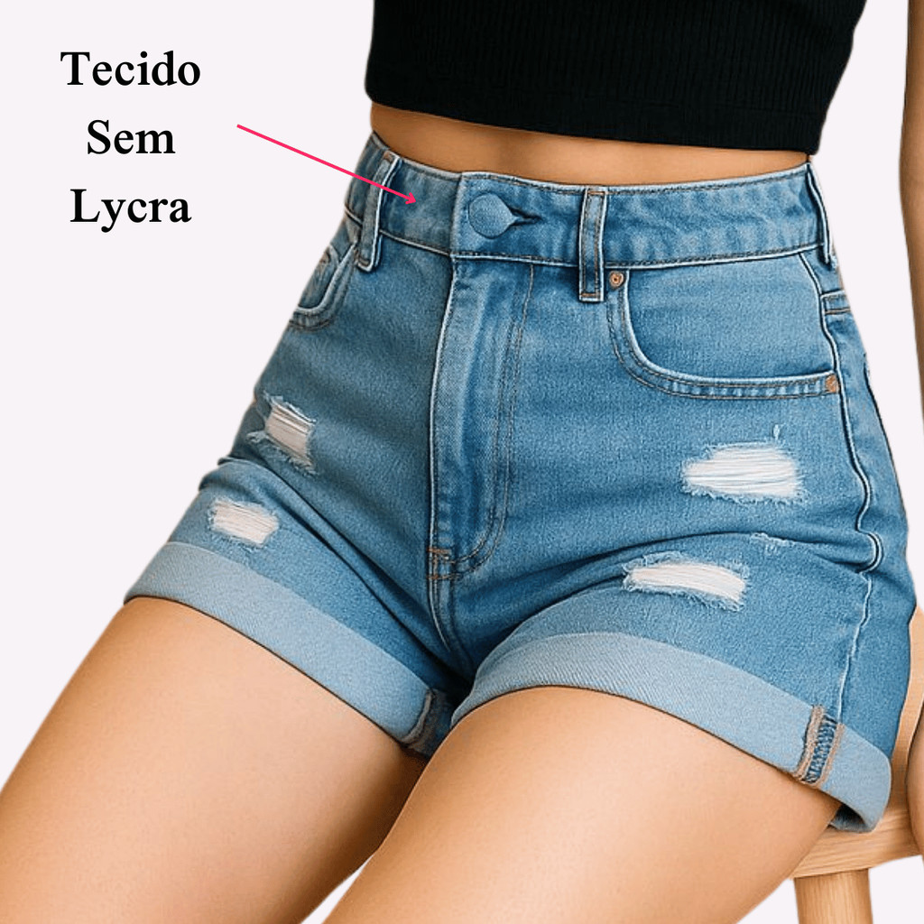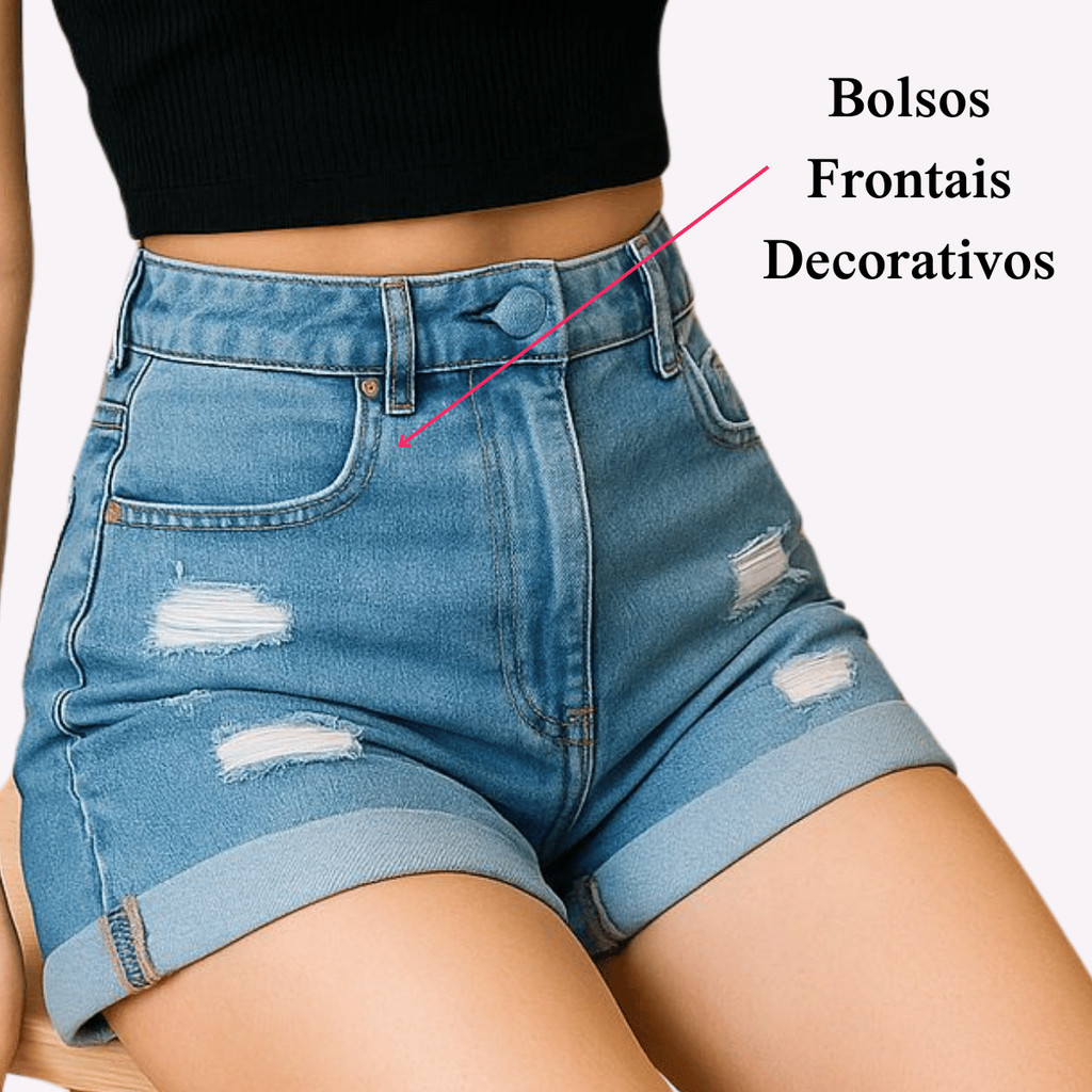 Shorts Jeans Feminino Cintura Alta Hot Pants Destroyed Com Barra Dobrada Premium Estilo Modelador