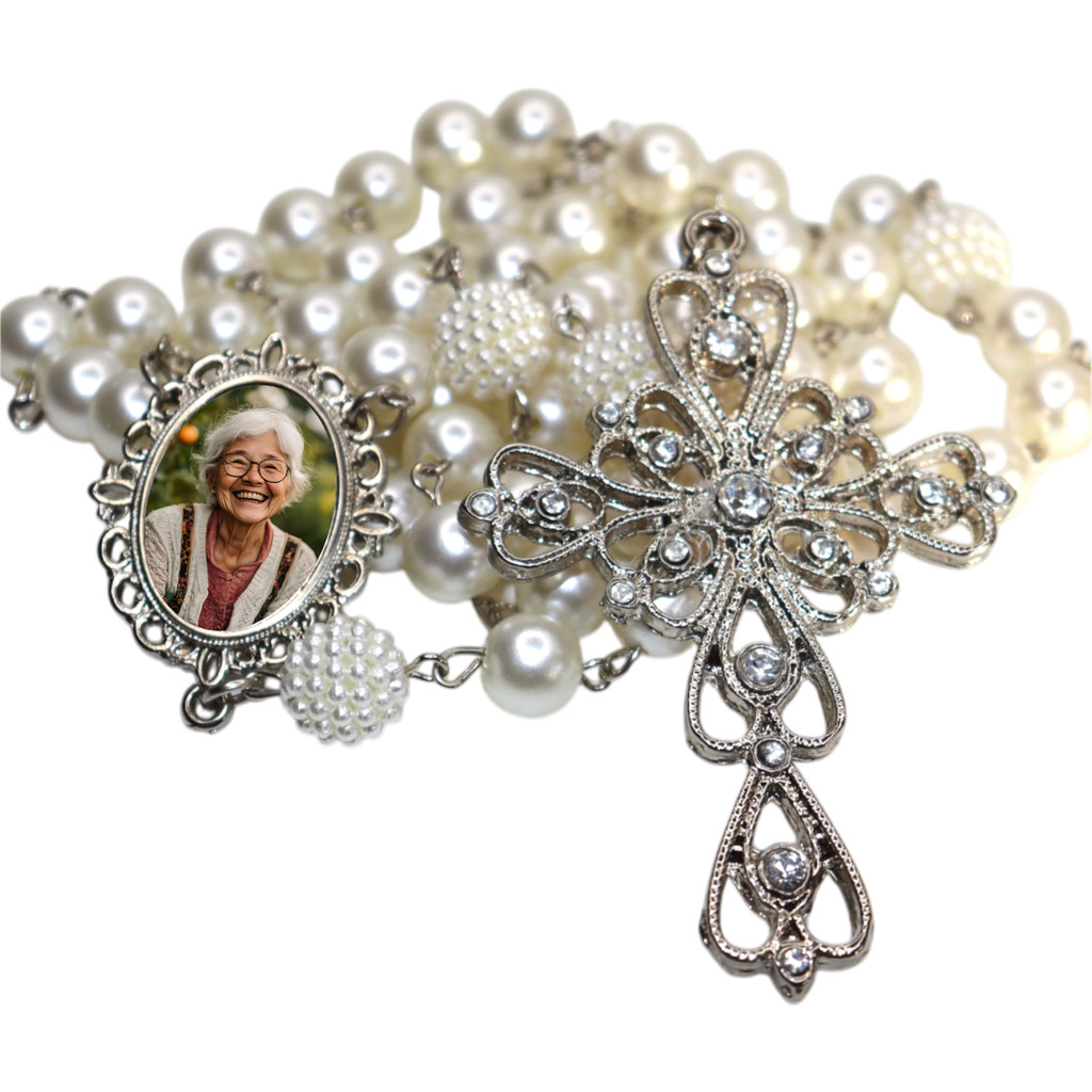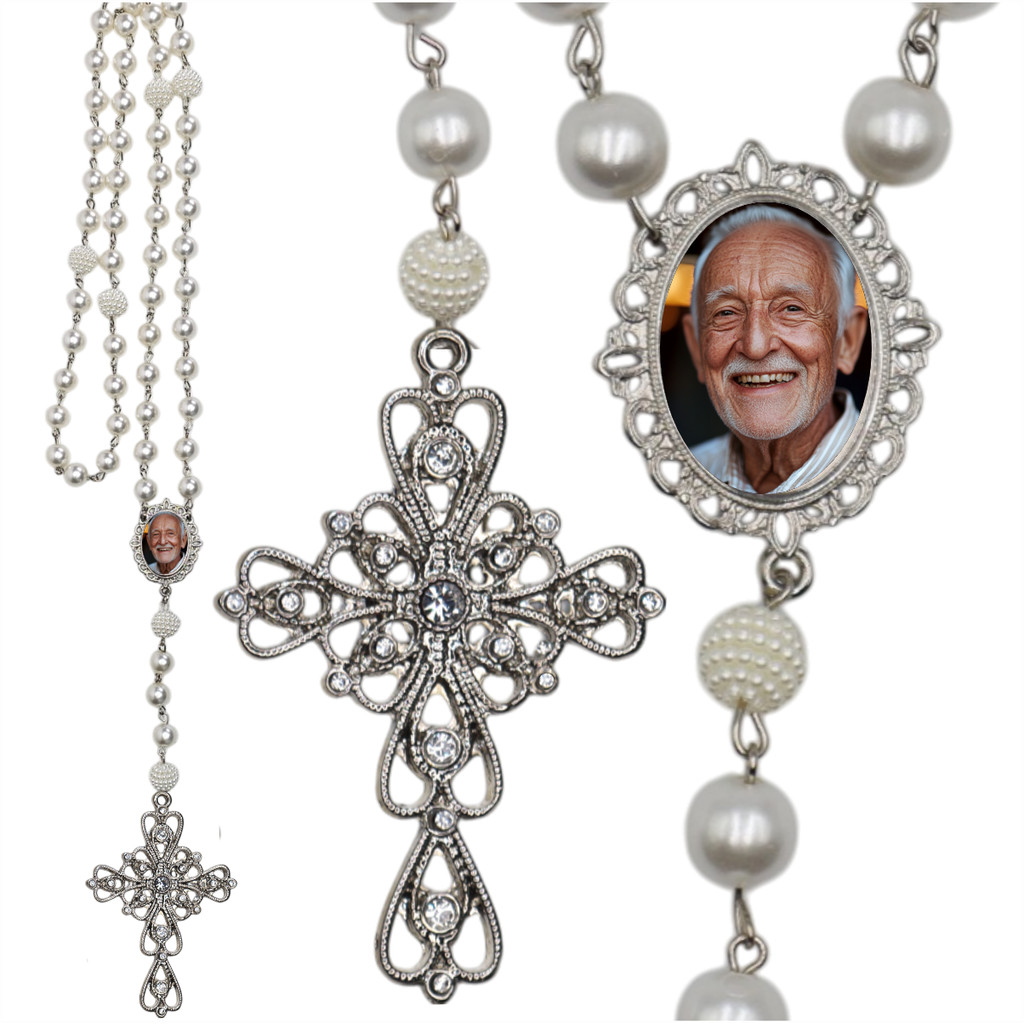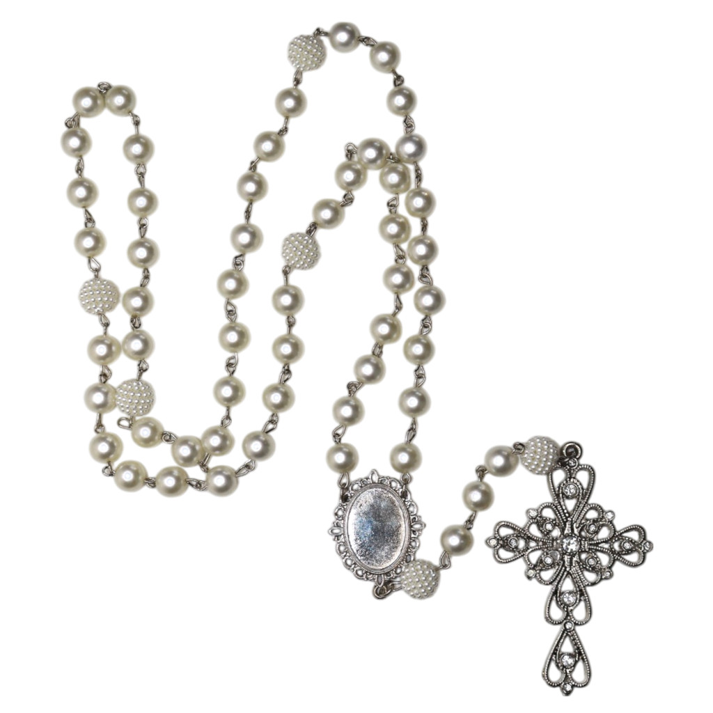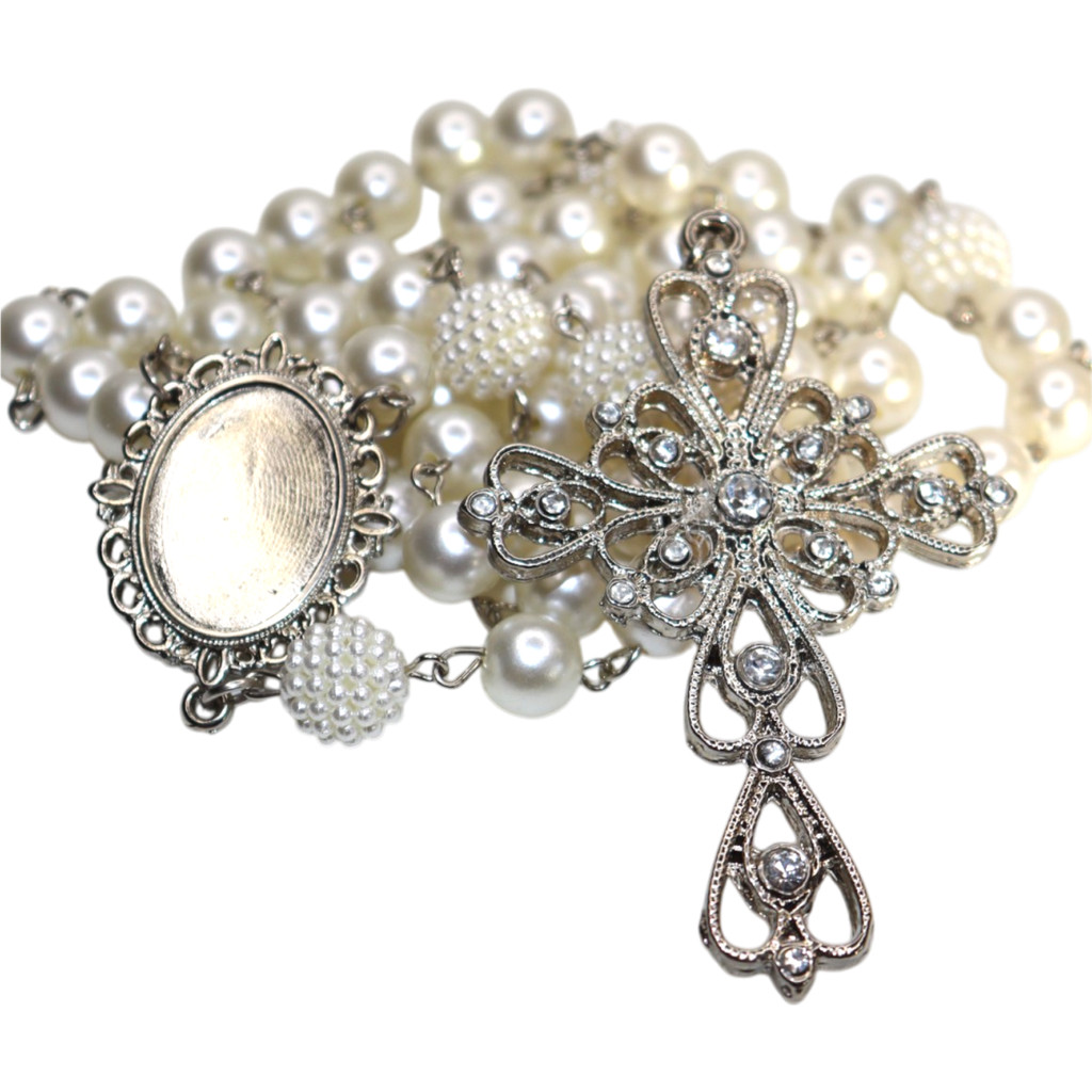 Terço De Noiva Pérolas Crucifixo Pedrarias Medalha Relicario Com Foto Personalizado Tradicional Catolico Mod 5