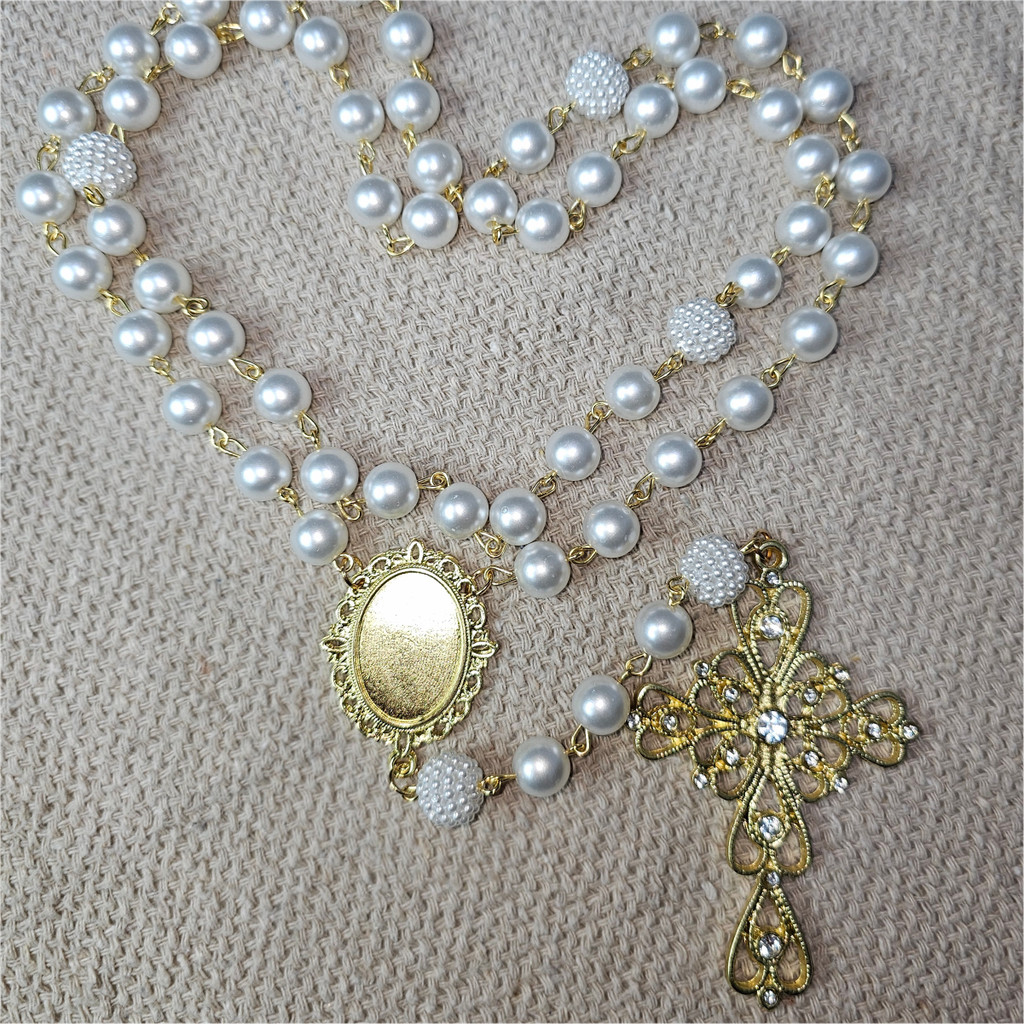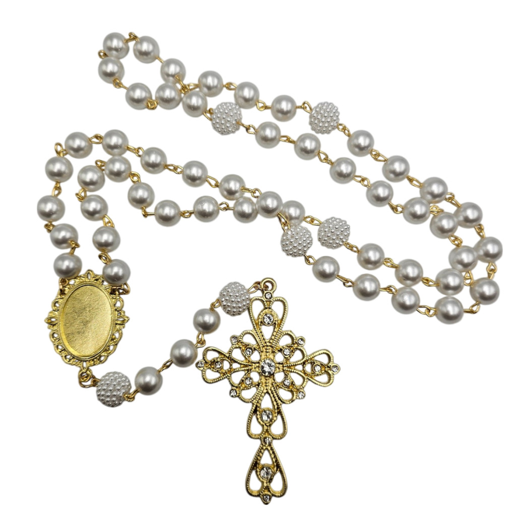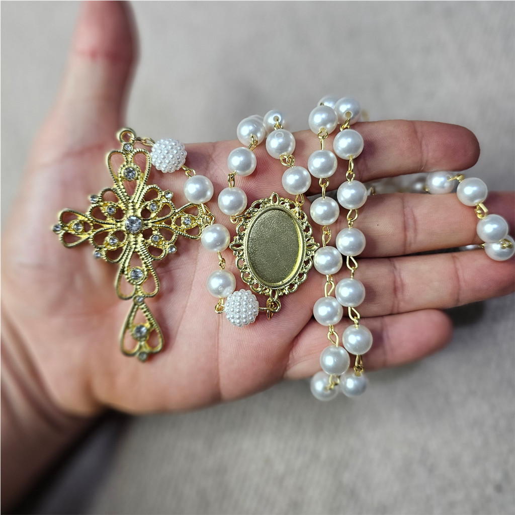 Terço De Noiva Pérolas Crucifixo Relicário Dourado Com Foto