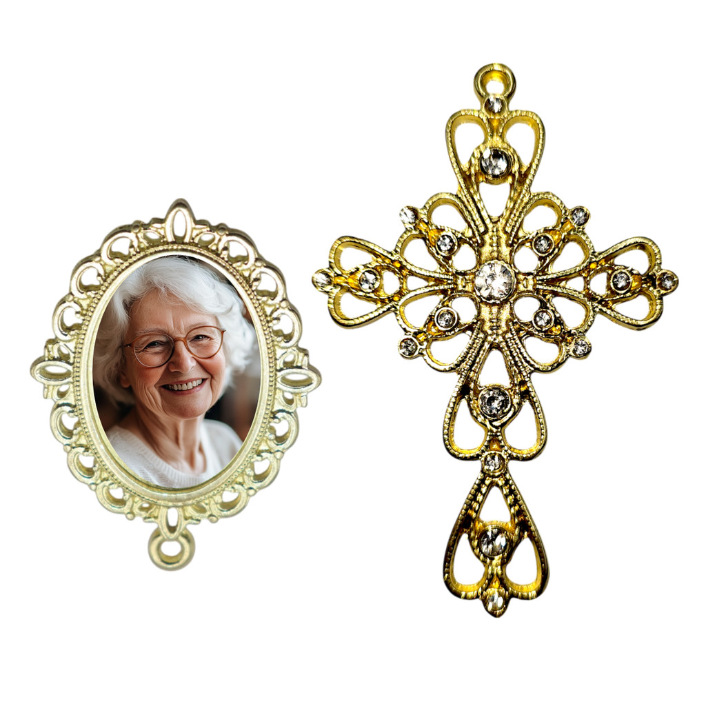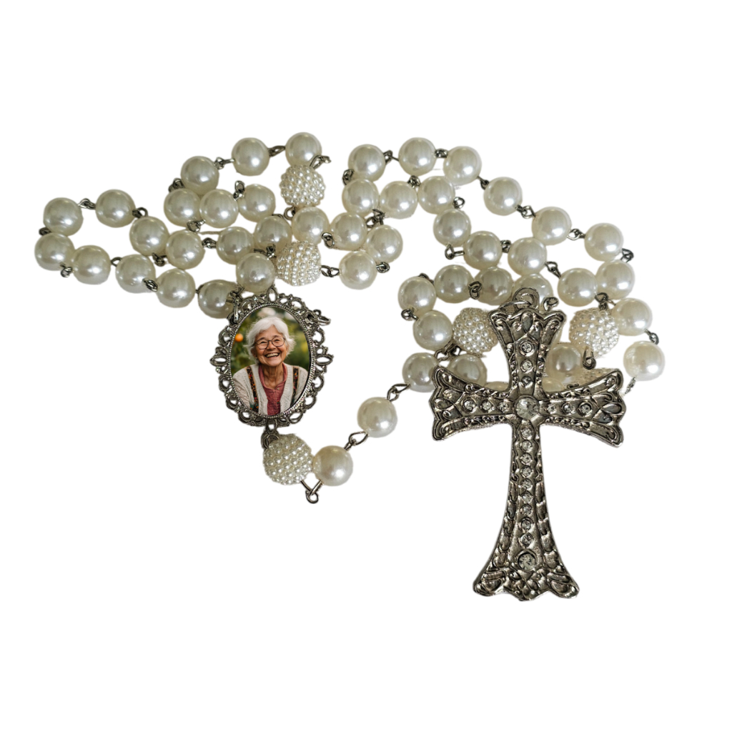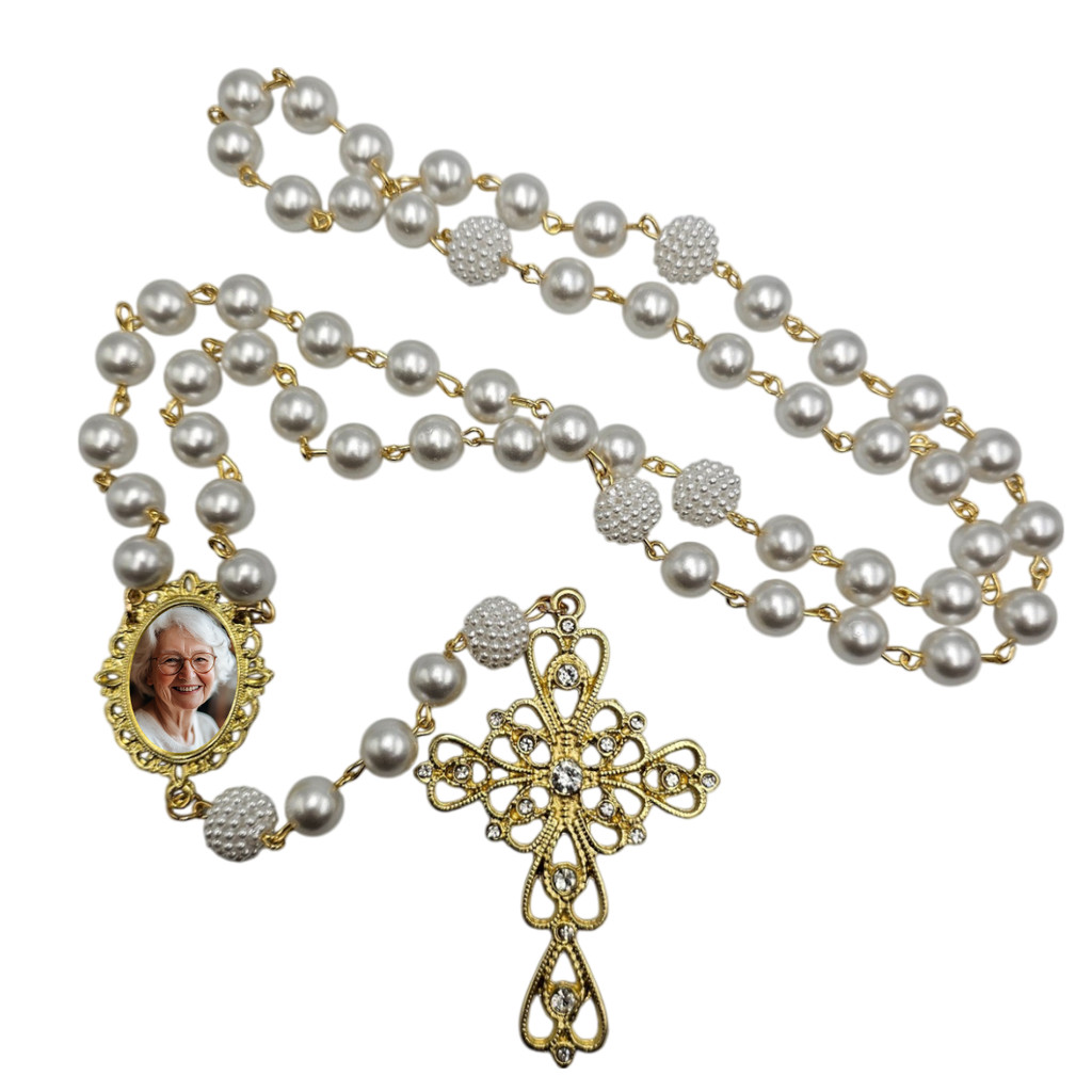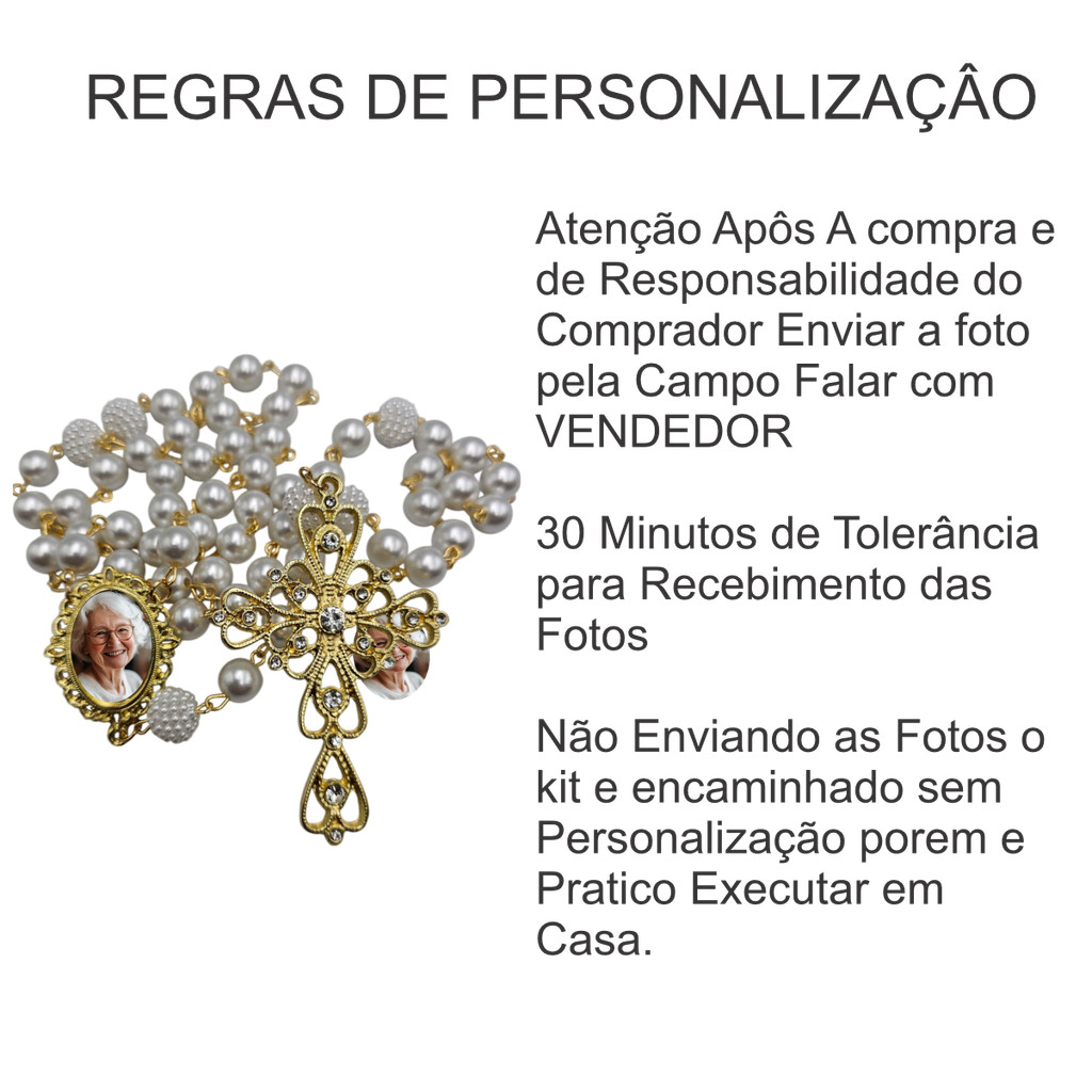 Terço De Noiva Pérolas Crucifixo Relicário Dourado Com Foto
