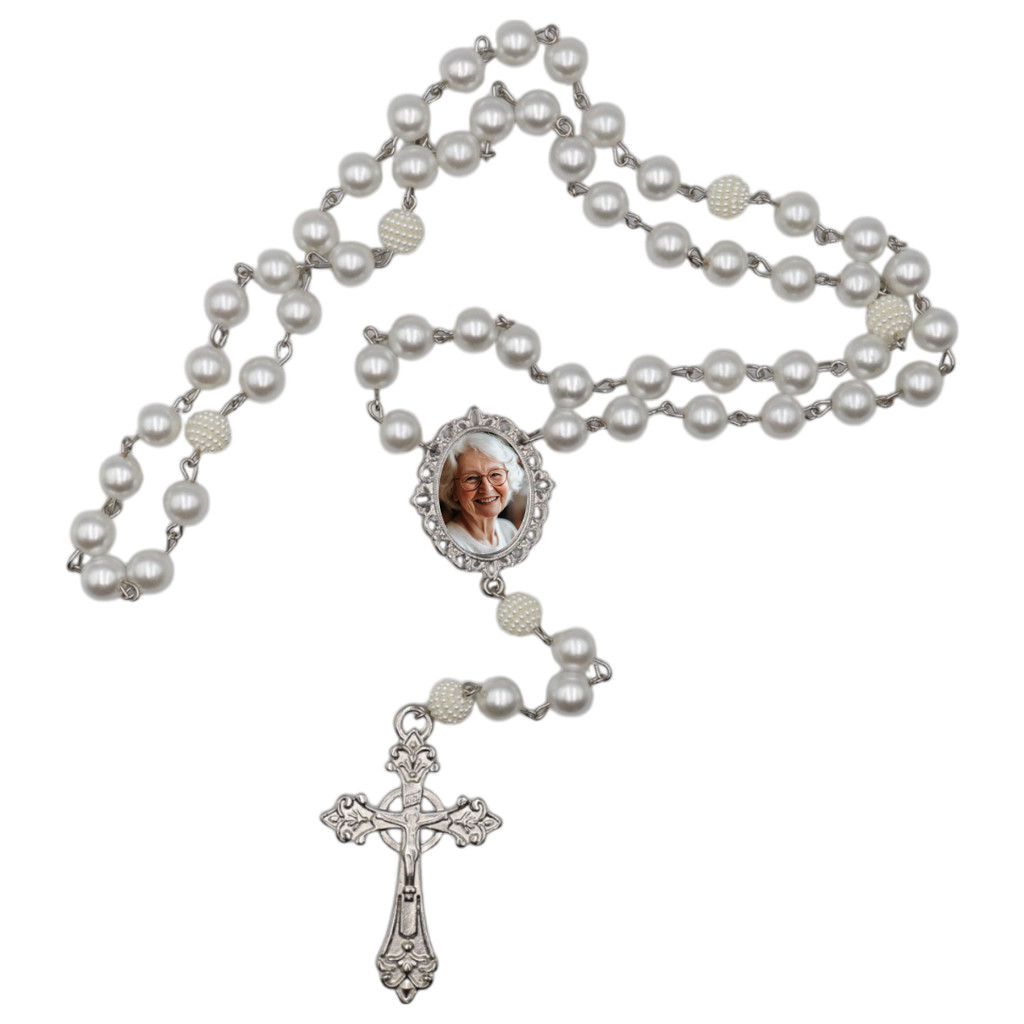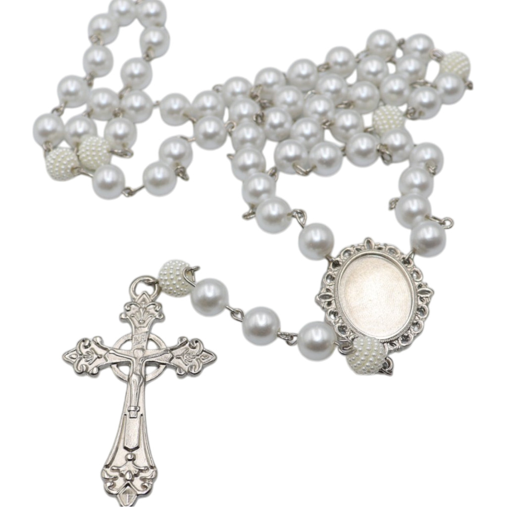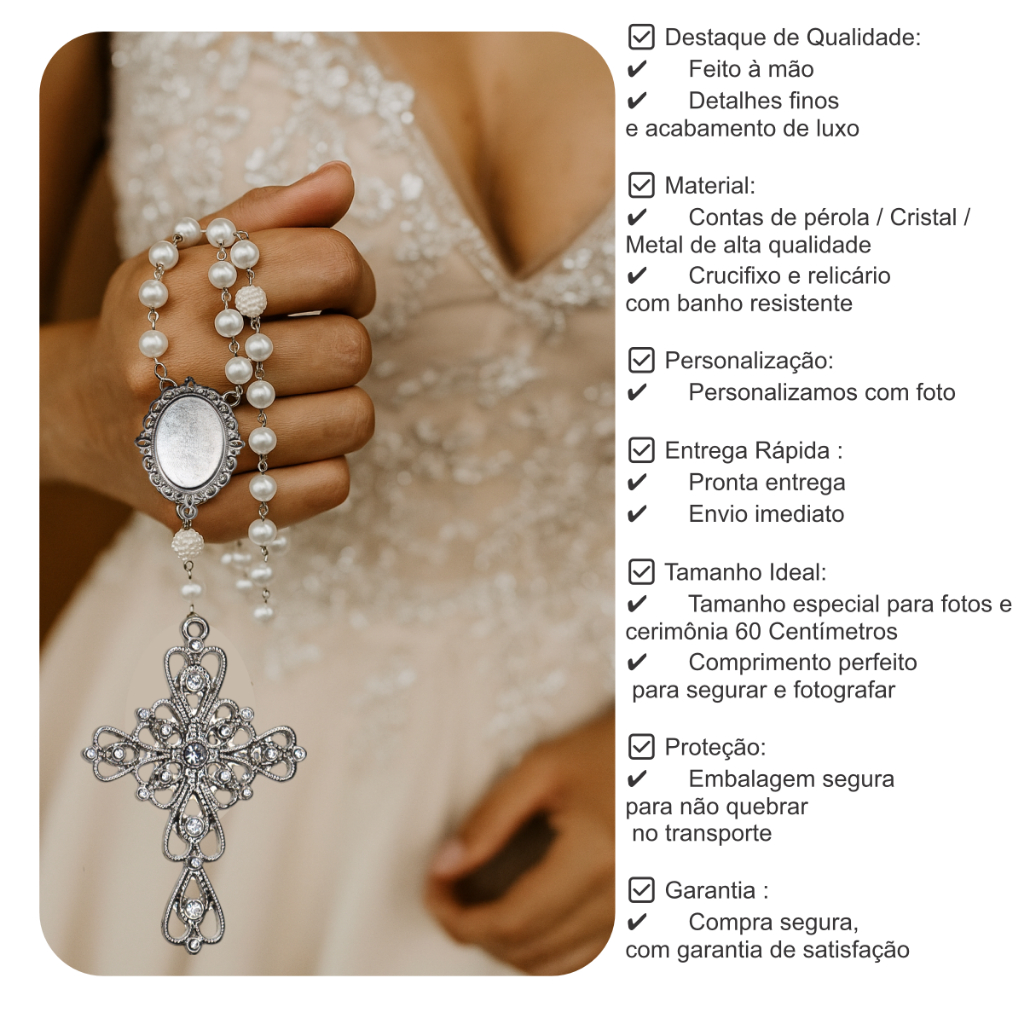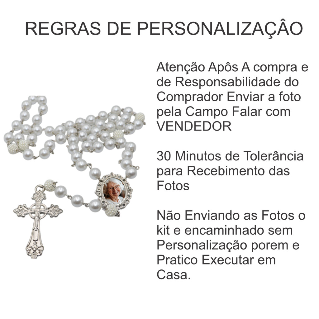 Terço de Casamento Noiva Personalizado com Foto Cor Prata Perolas e Cruz Casamento Homenagem Pai e Mãe Catolico