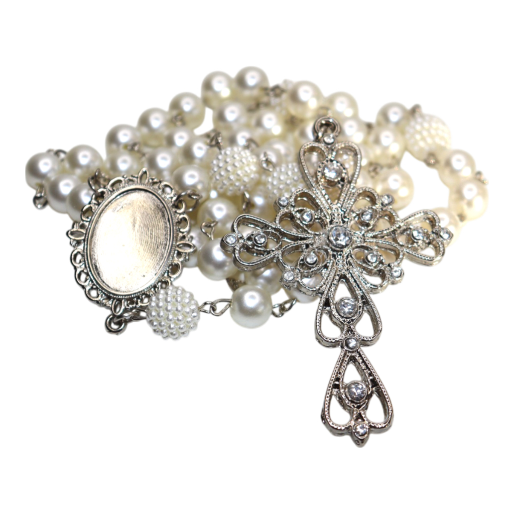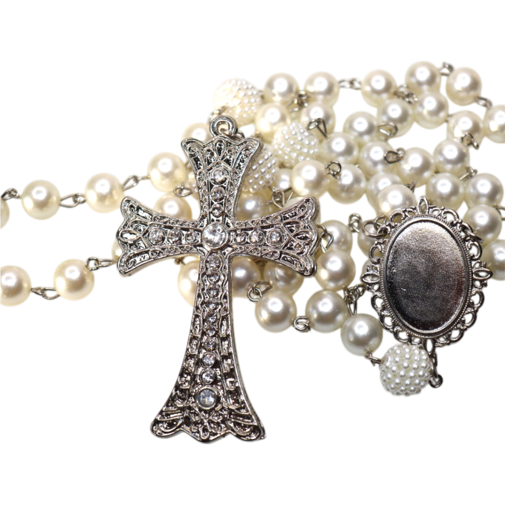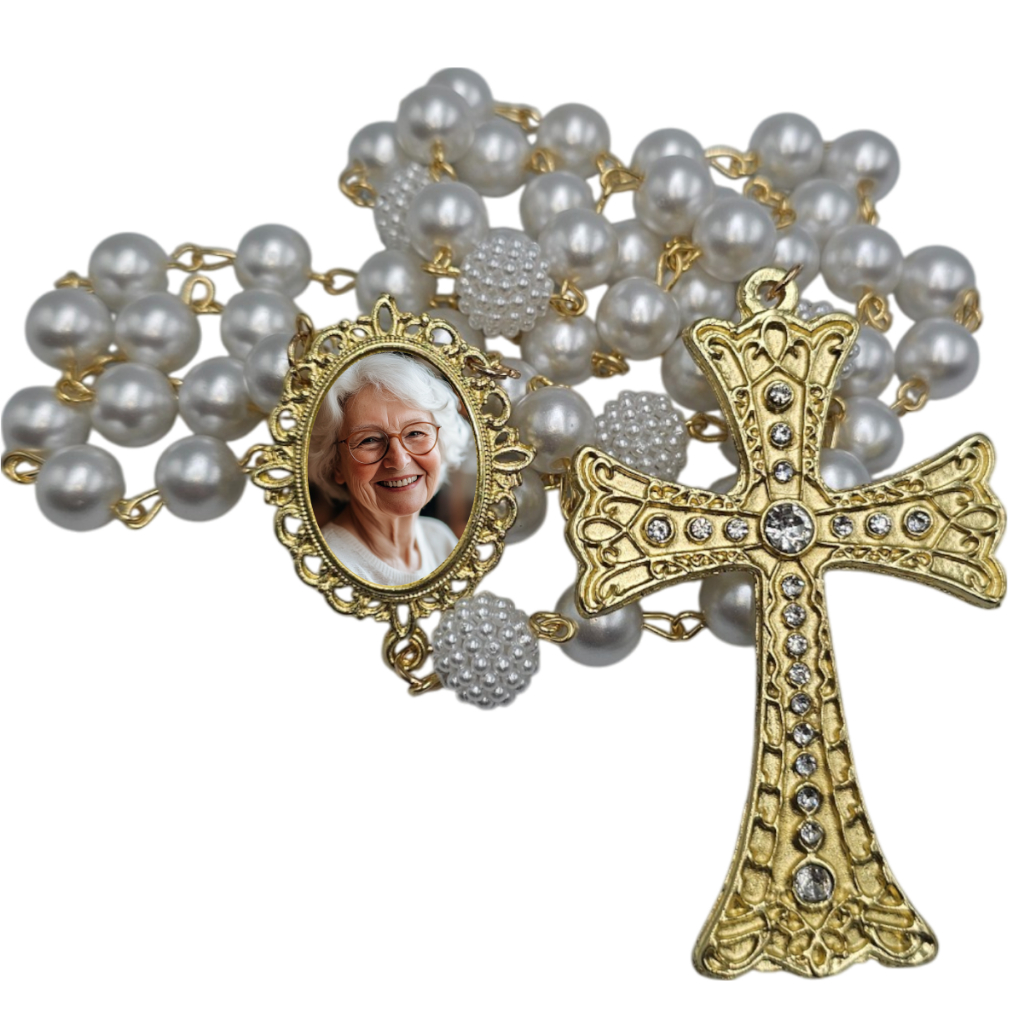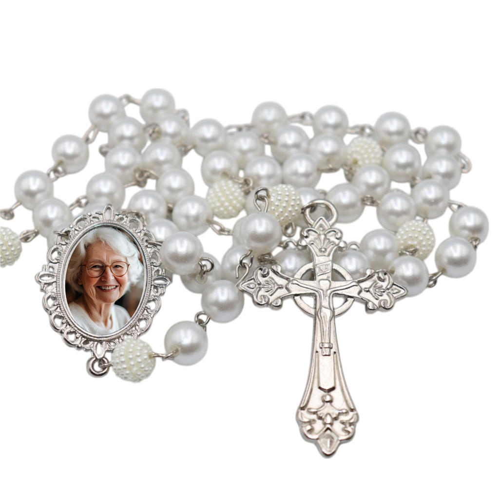 Terço de Casamento Noiva Personalizado com Foto Cor Prata Perolas e Cruz Casamento Homenagem Pai e Mãe Catolico