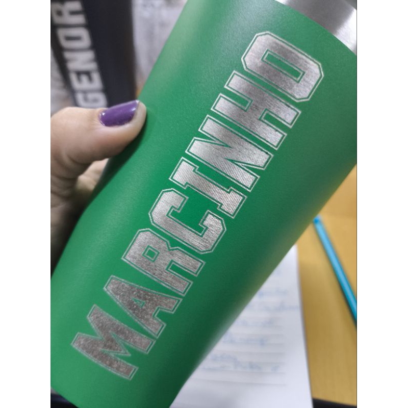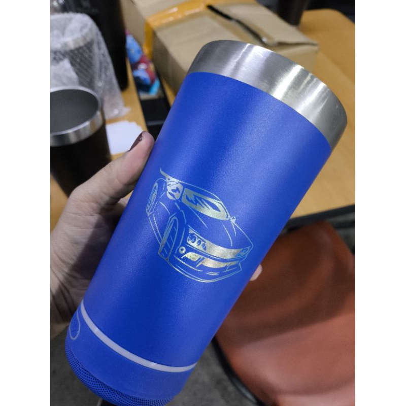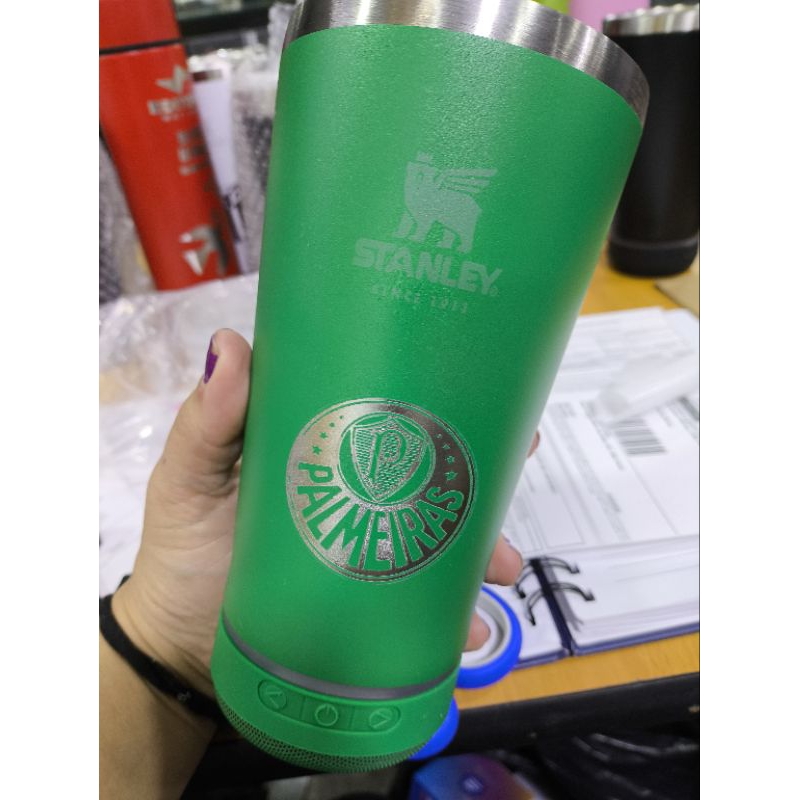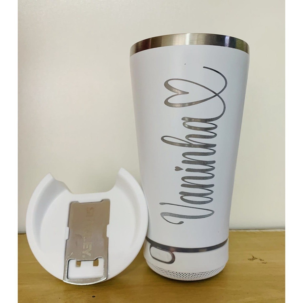 Copo térmico Personalizado inox com tampa abridor e caixa de som com bluetooth Led 420ML